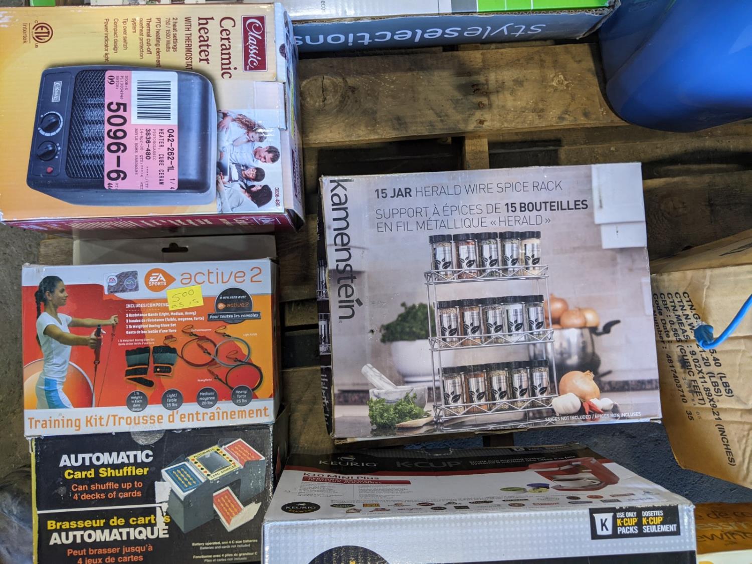 Portable speakers, keurig coffee maker, 15 jar spice rack, ceramic heater, 3 Tier shelving unit, sewing machine, miscellaneous household items