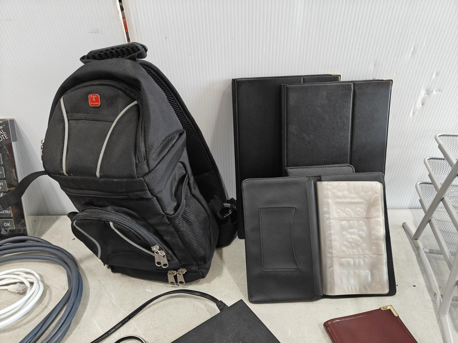 3-tier paper rack, power bar, assorted cables, camera bag, (5) bard holder books, jumbo remote, DVD player, (2) indoor power cables