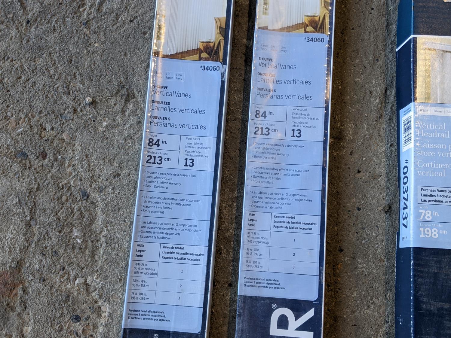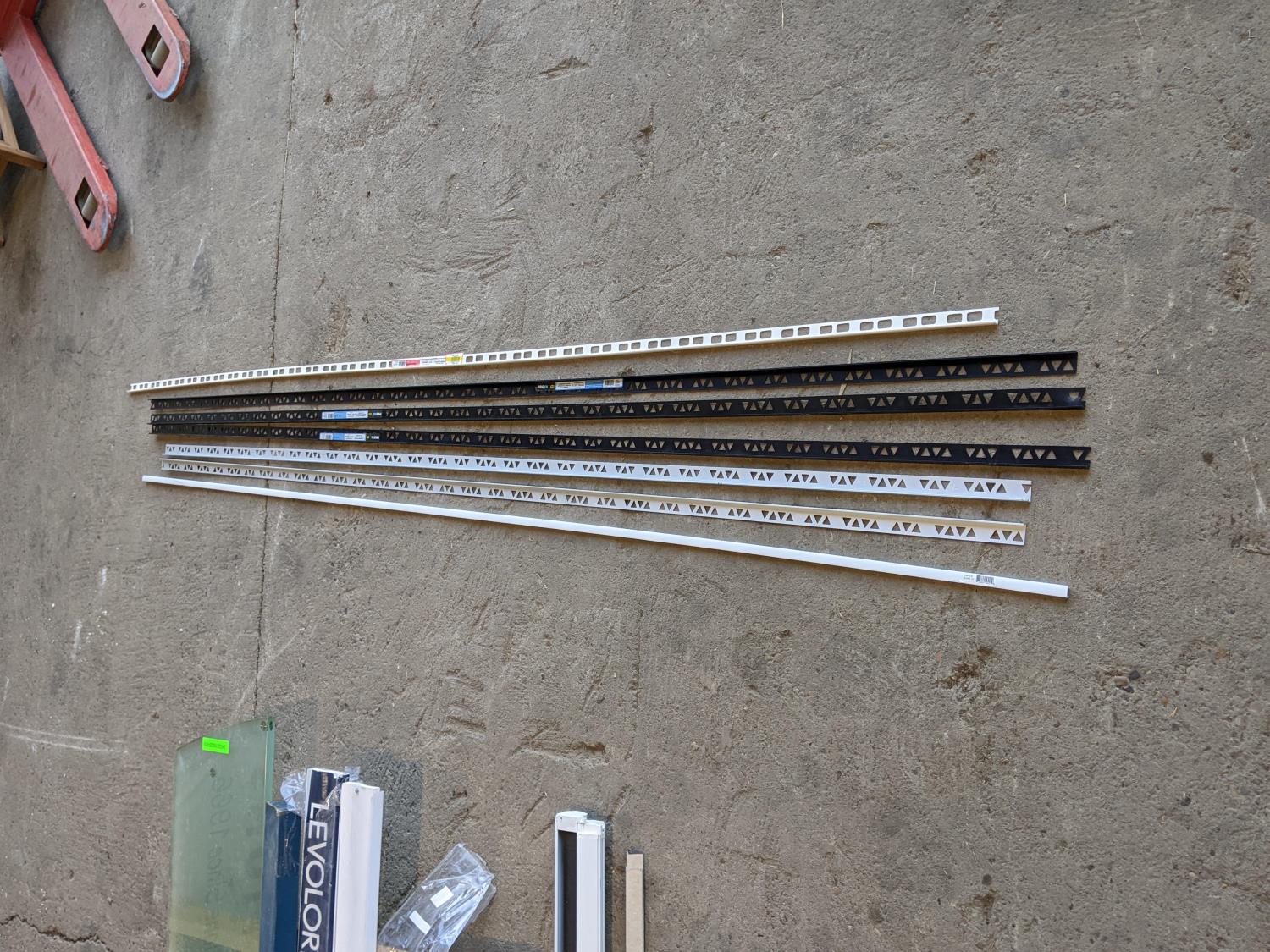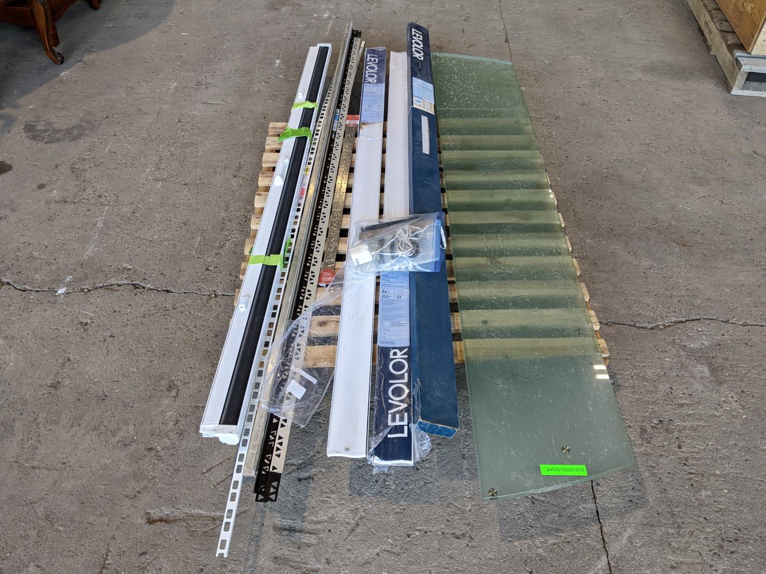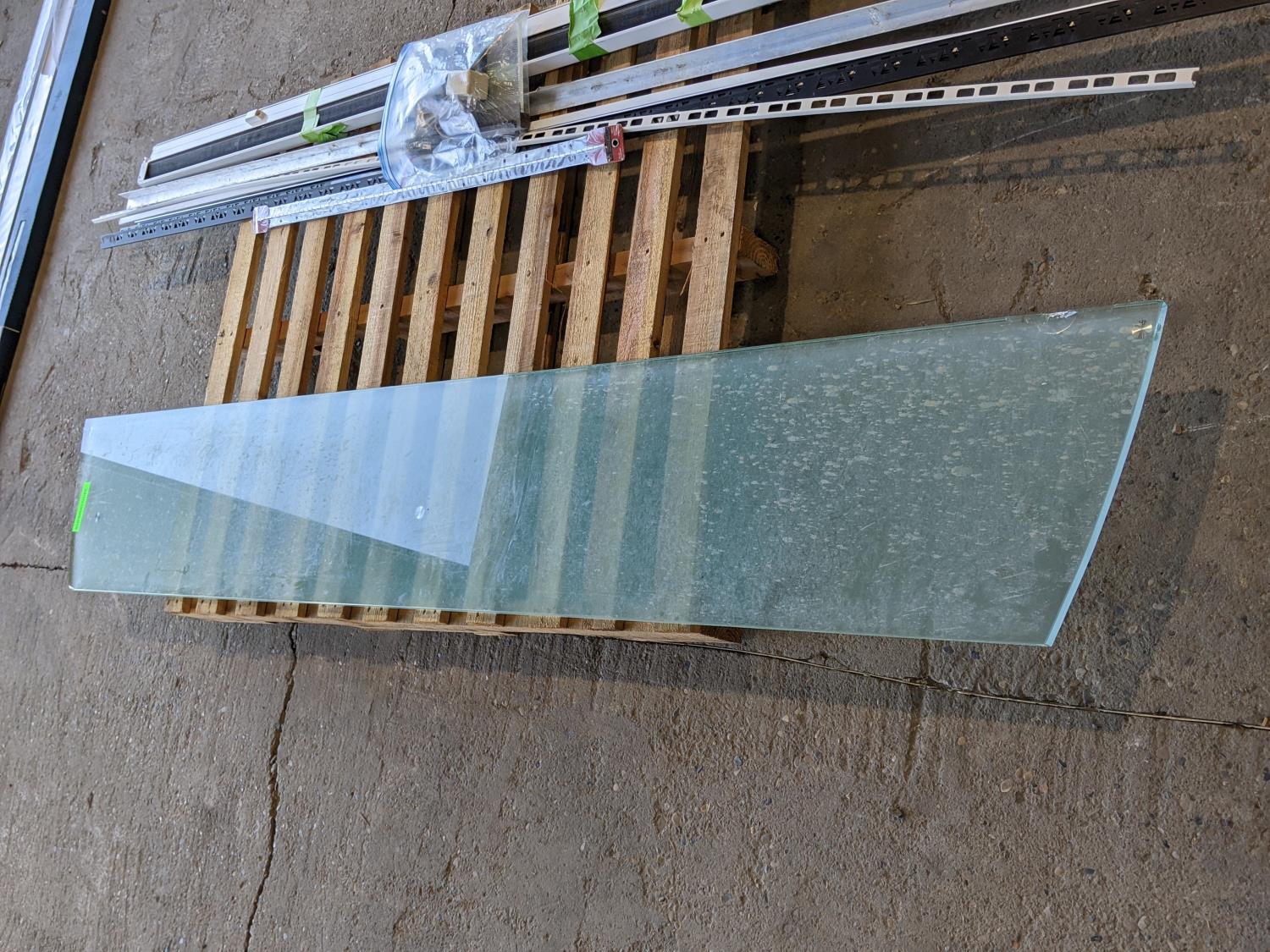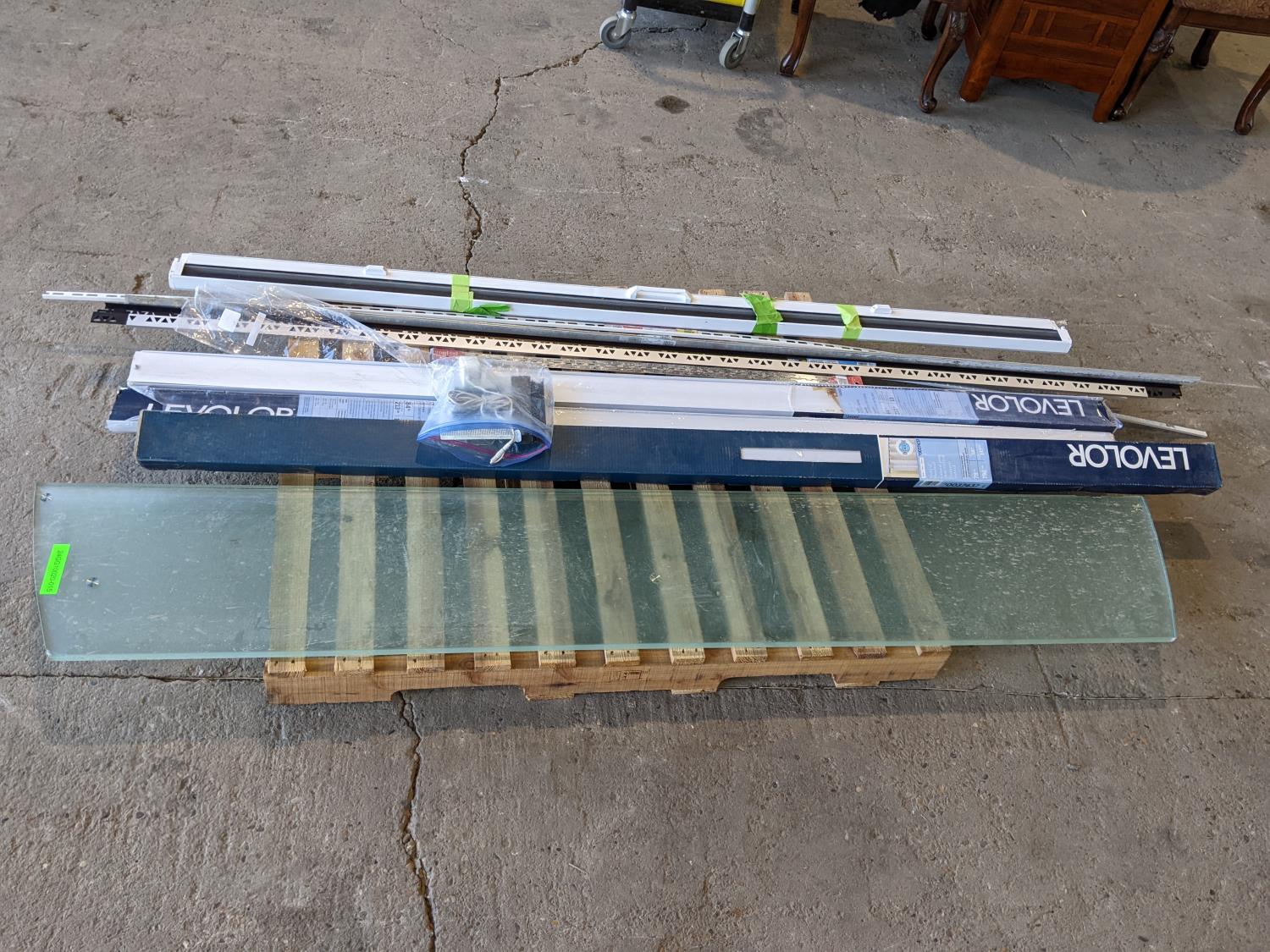 Retractable screen door 80-1/2 inch h, vertical blind headrail, vertical blinds, glass bar top 85-3/4 inch l x 14 inch w x 3/4 inch thick, (2) 1/16 inch x 1 inch x 8 ft long aluminum angle, tile edging