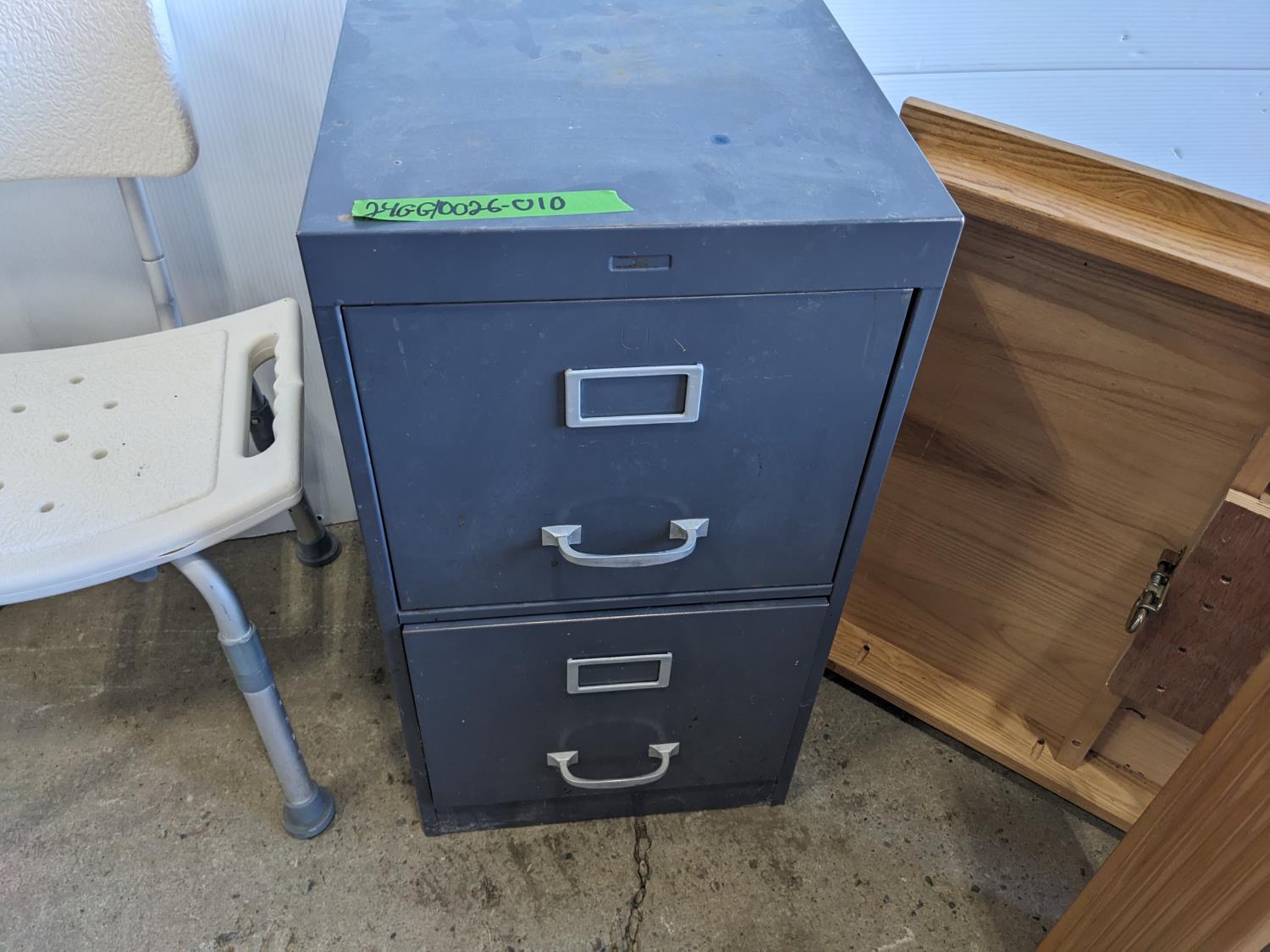 2 drawer metal filing cabinet 15 inch w x 18 inch d x 28 inch h, oak RV table 39 inch w x 26 inch d x 30 inch h, shower chair