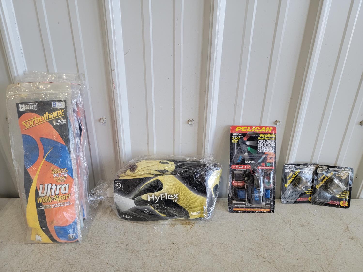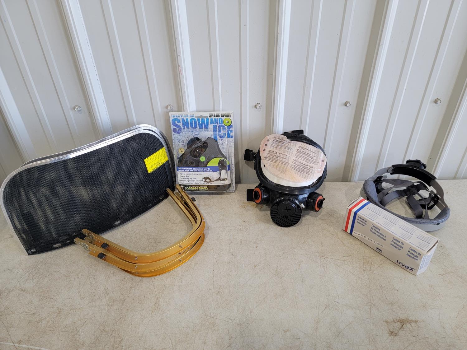 replacement insoles, hyflex gloves, hands free lights, full face respirators, shoe spikes, face shields, half face respirators, glasses, goggles
