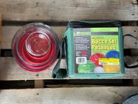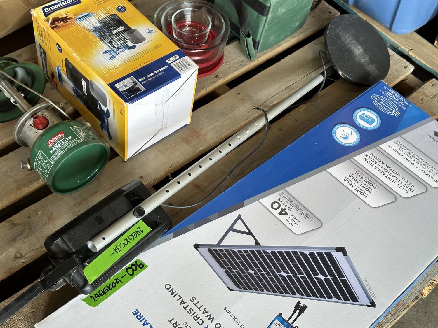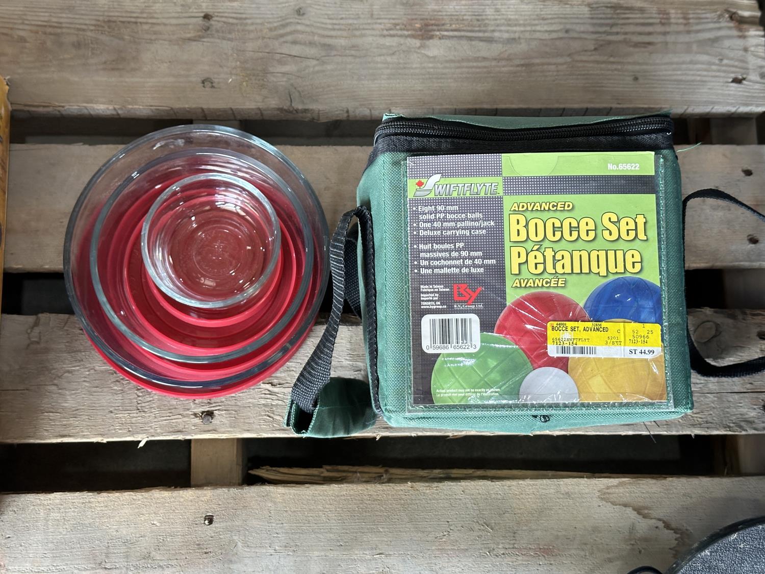 Metal Detector, Coleman 40 watt 12v solar panel kit, Bocce ball set, (2) outdoor lanterns, set of glass nesting bowls