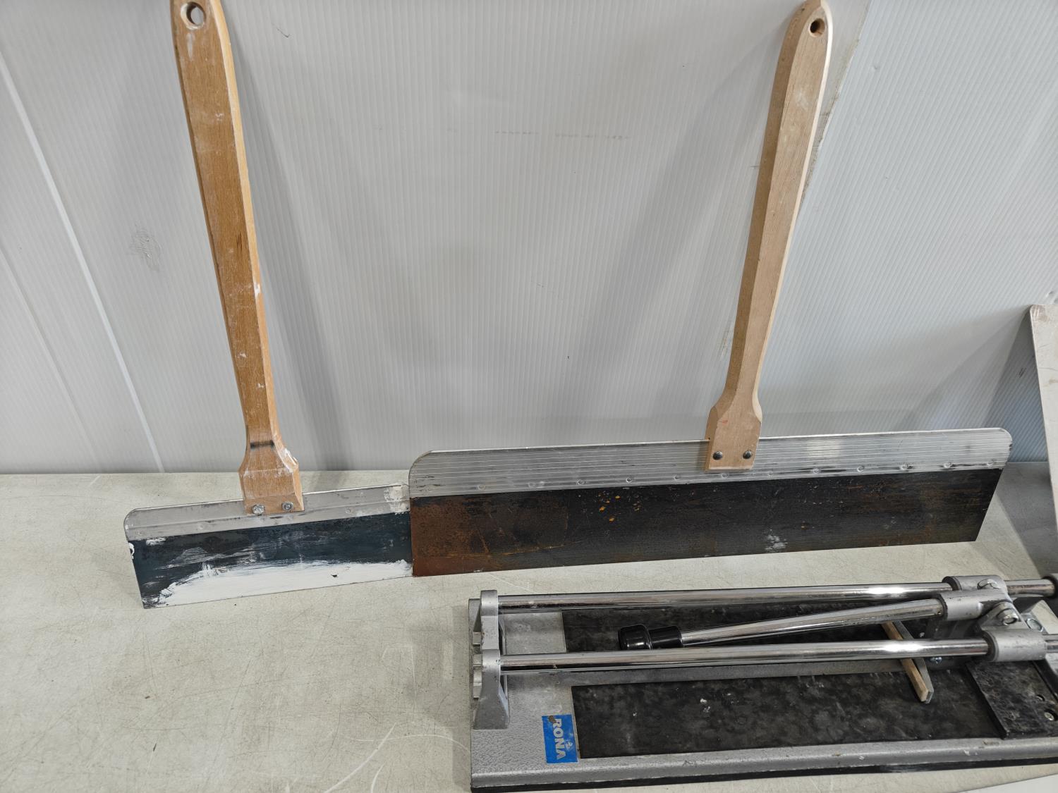 (2) long handled mudding knives, tile cutter, Bora straight edge clamp, 13 inch x 13 inch drywall mud tray