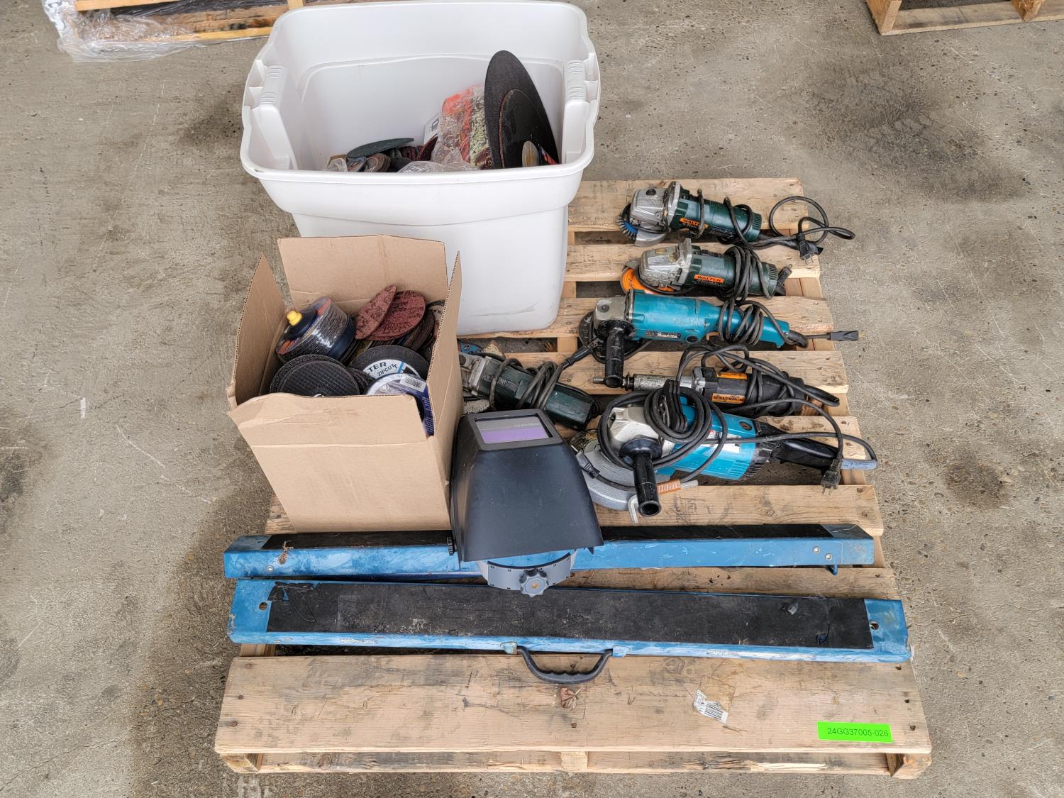 Welding helmet, grinders, saw horses, discs