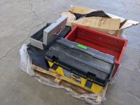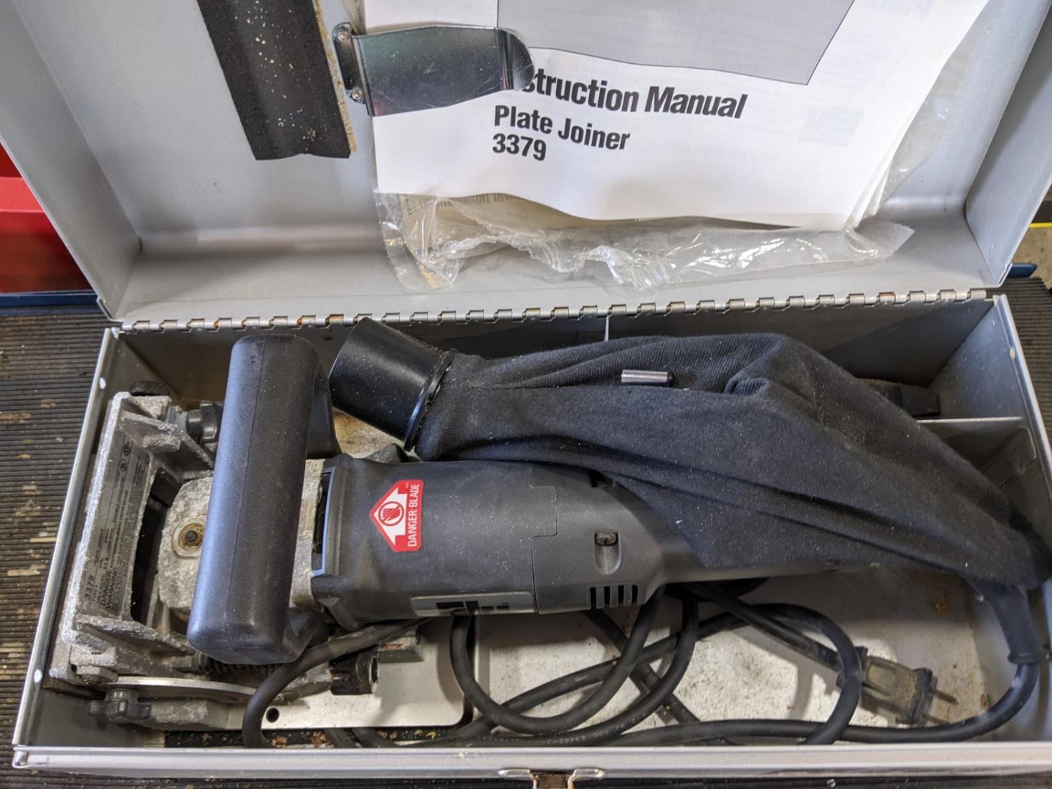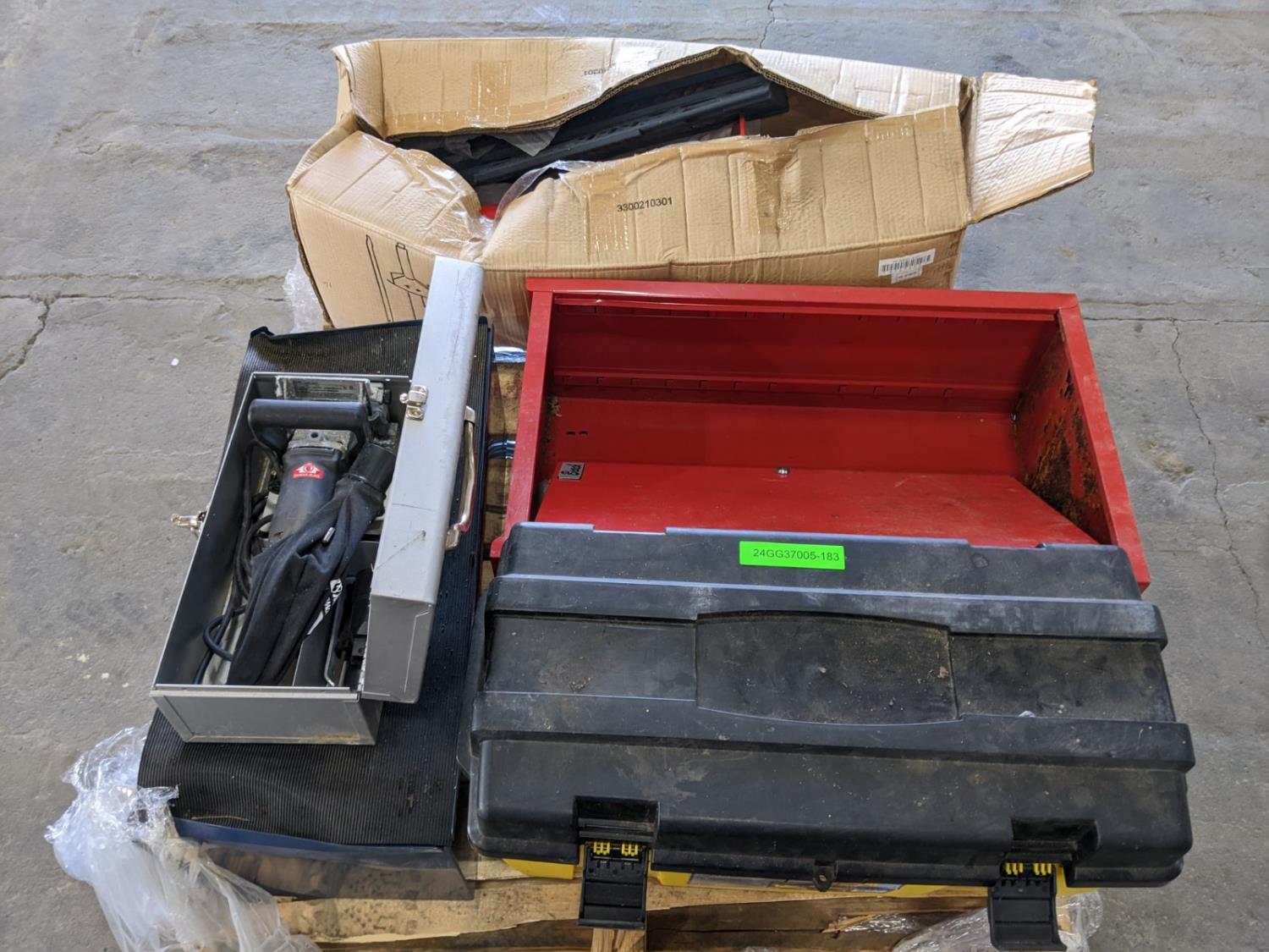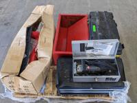 manual tire changer, Beach tool cabinet, Mastercraft 2 drawer metal tool box (has dents), plastic tool box, Elu by Black & Decker joiner