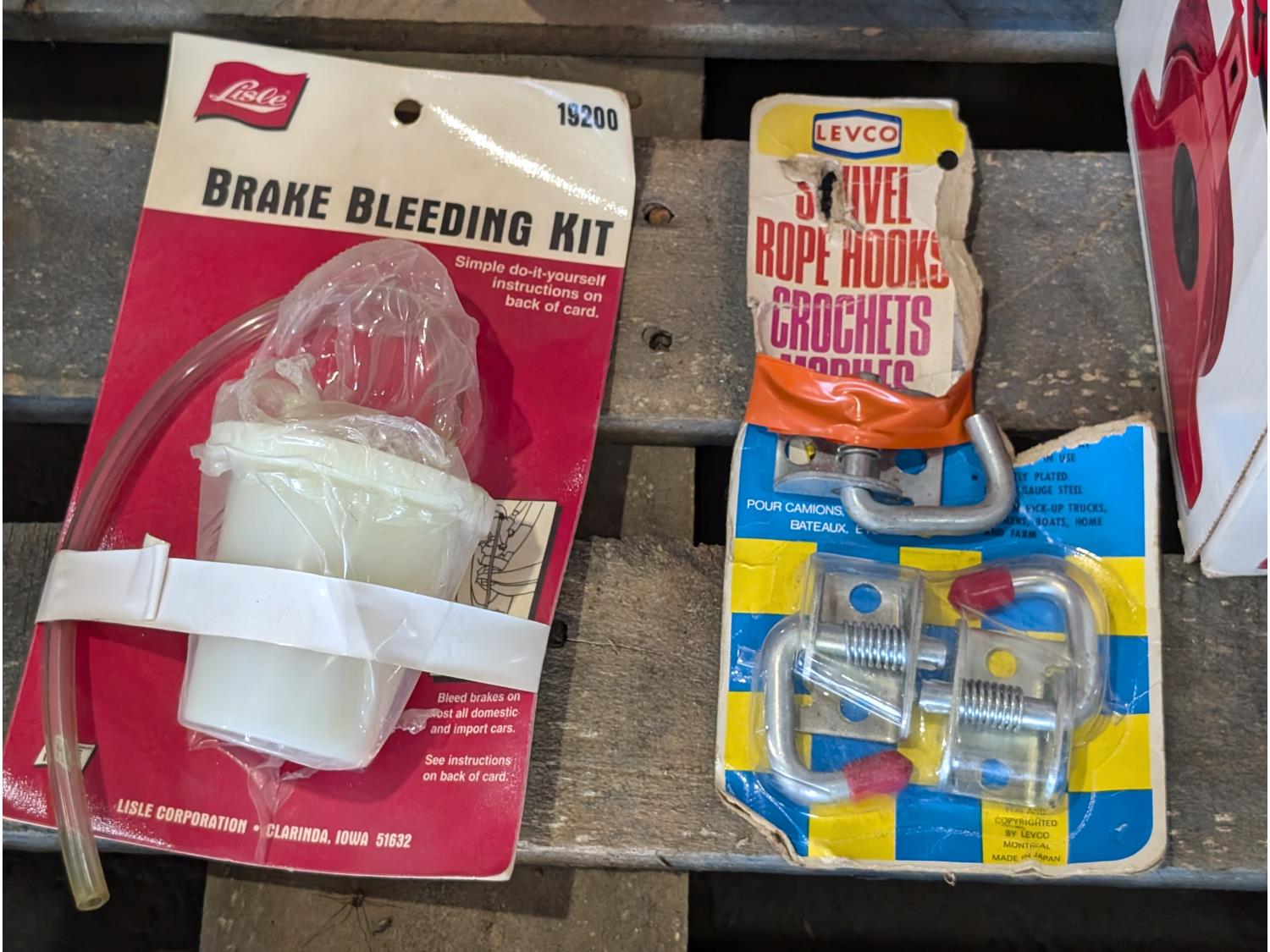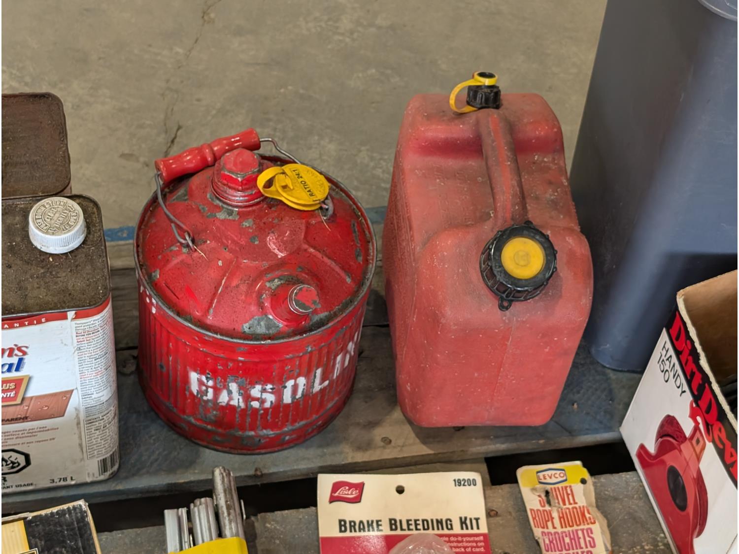 axes, pad locks, extra-large wrap-a-round, PVC elbows, mobil gear lube 275, brake bleed kit, wall hooks, grease gun holder, tarp repair kit, grill briquettes, dirt devil vacuum, wood protector, jerry cans, wastebasket, wooden shelf