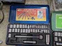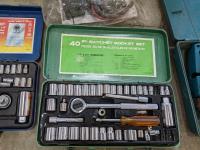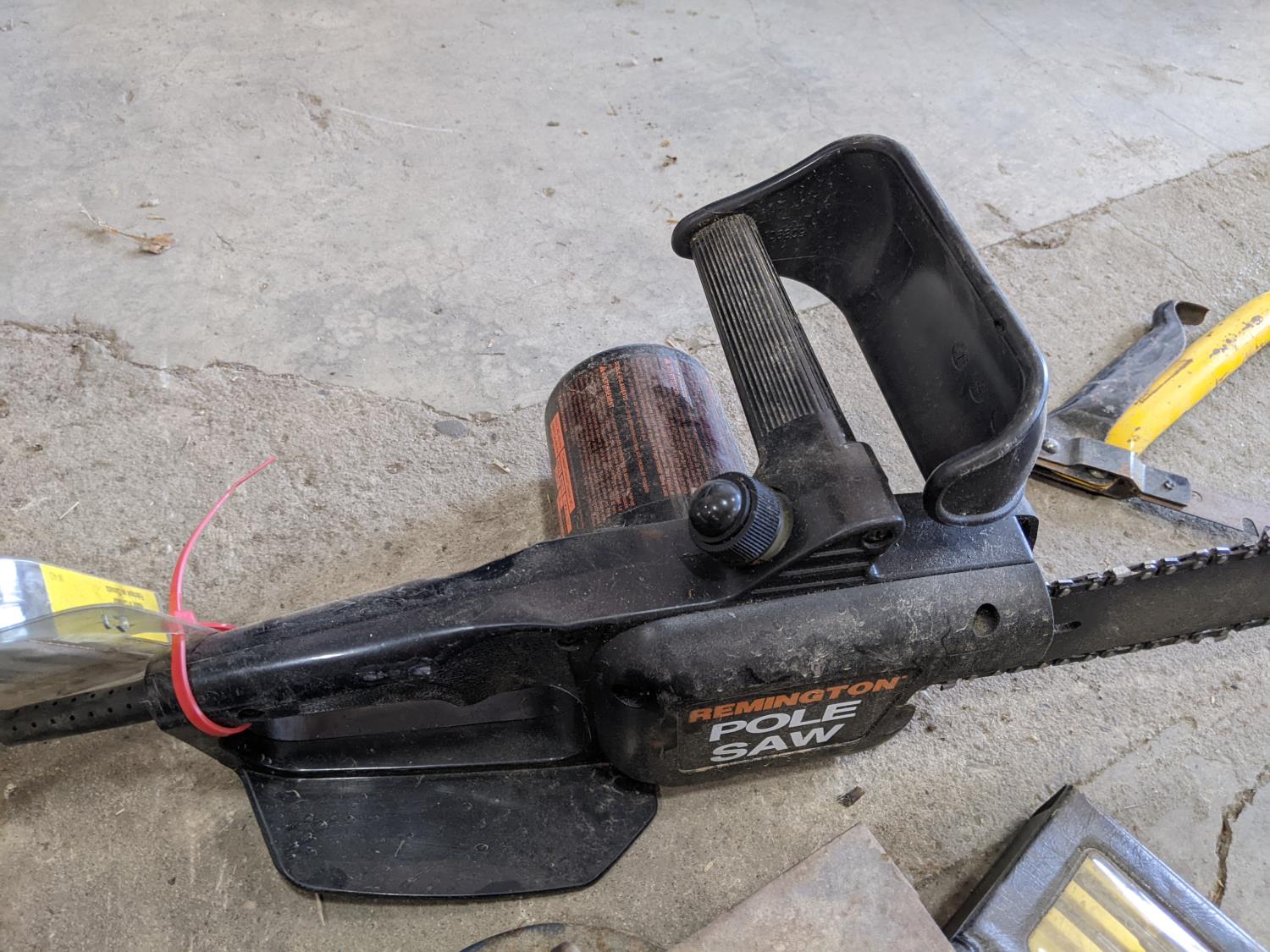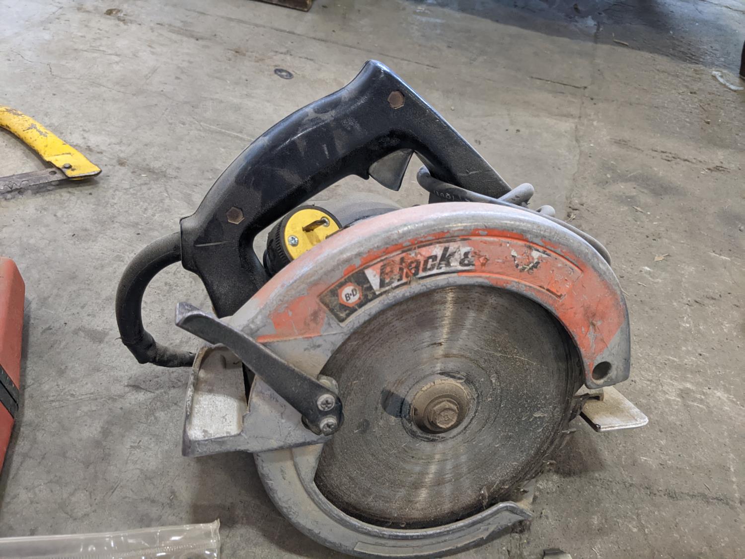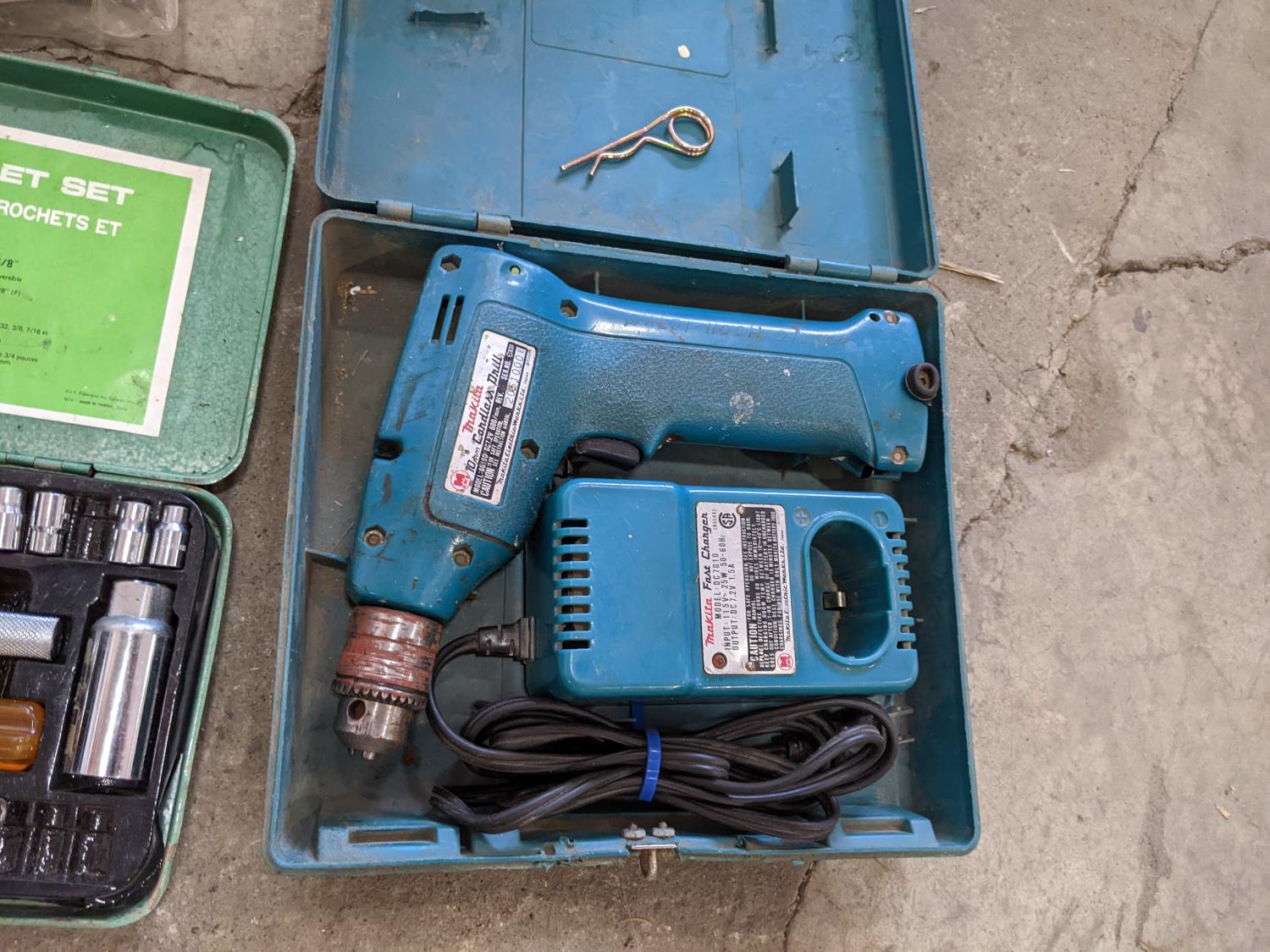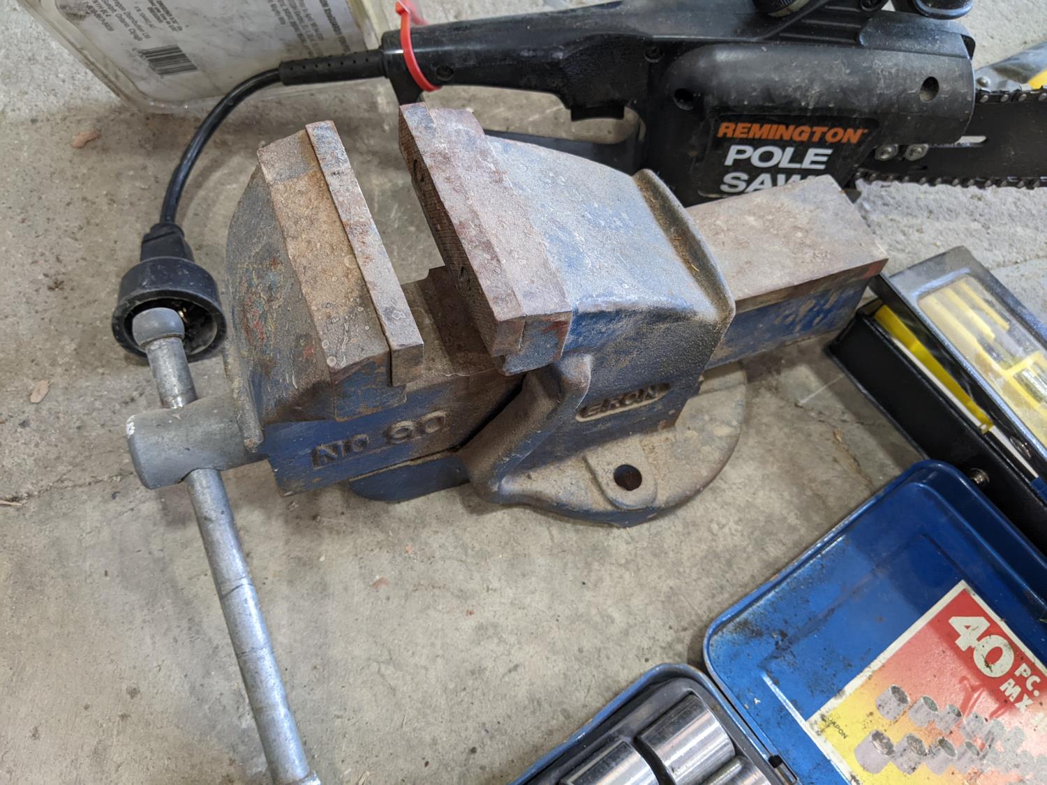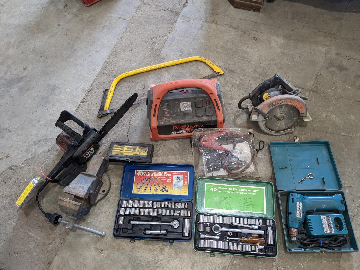 electric chainsaw, hand saw, circular saw, socket sets, makita drill and charger, vise, eliminator power pack
