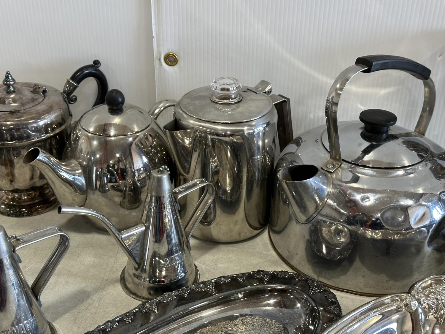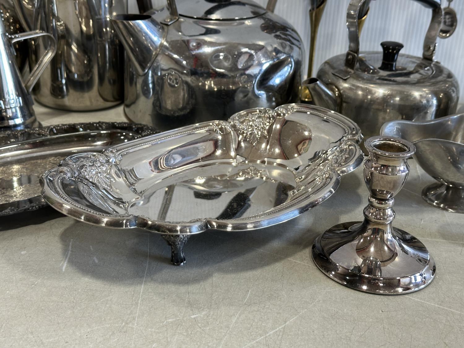 Teapots, kettles, candelabra, candlesticks, goblets, salt and pepper, serving plates, gravy boat, egg cup, utensils, Family Tree photo stand