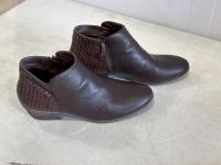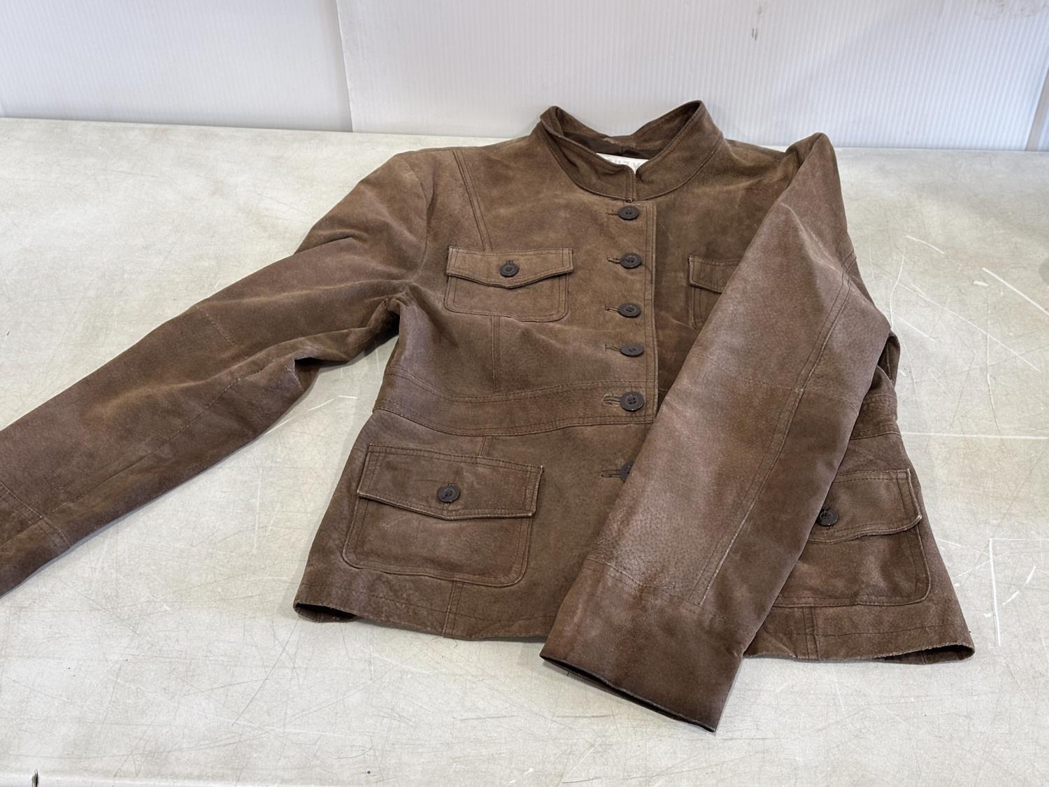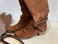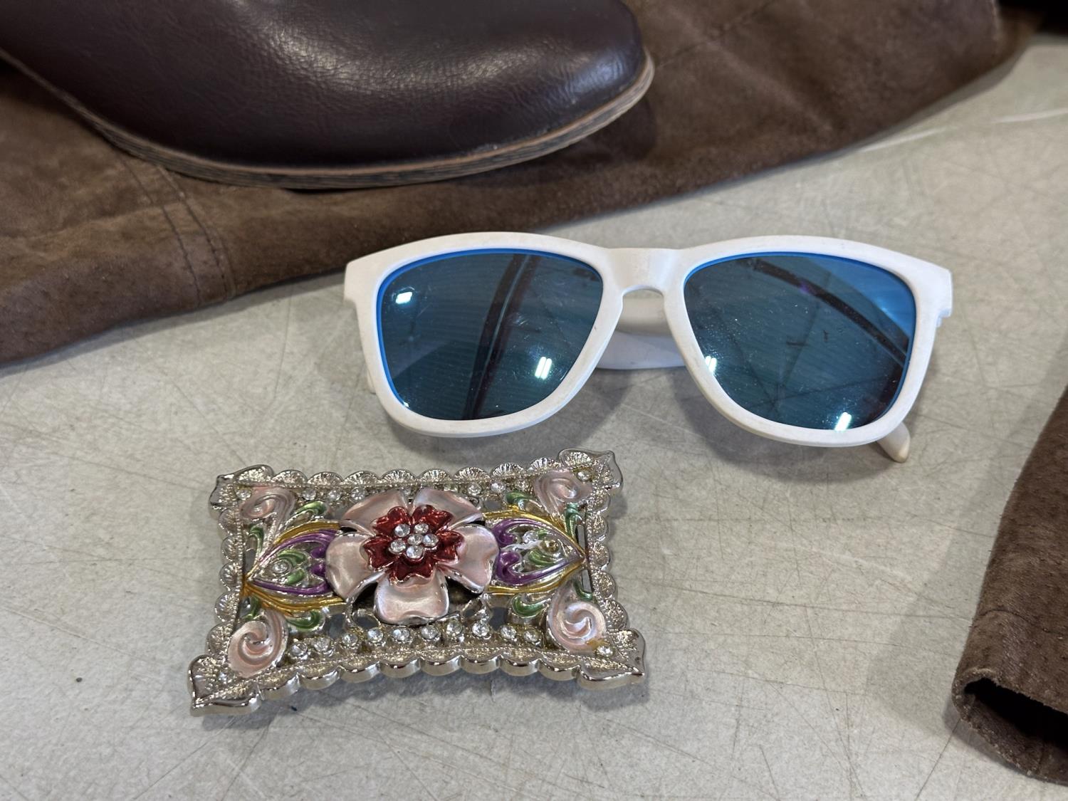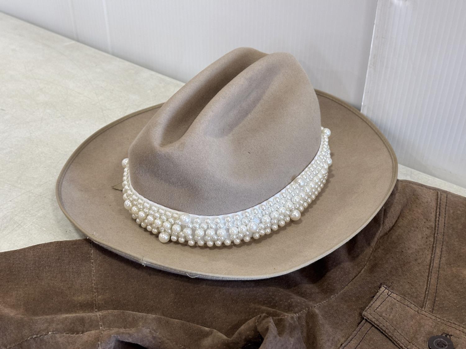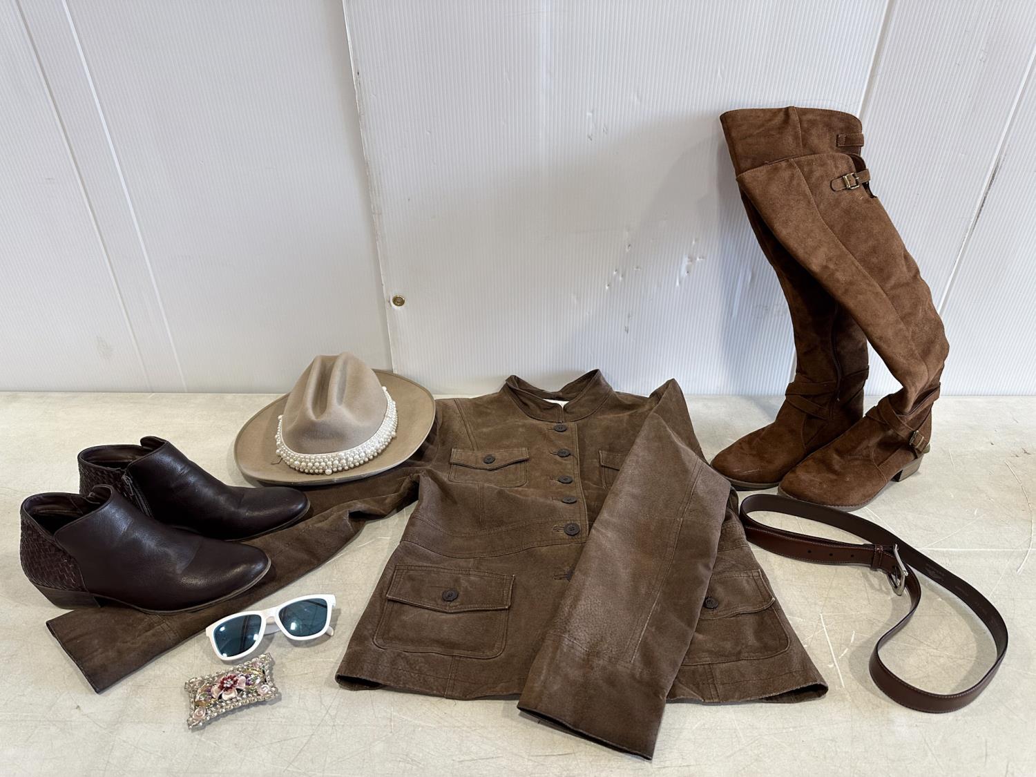 Ladies cowboy hat, XL leather jacket, size 8.5 boots, size 8.5 shoes, leather belt, belt buckle, sunglasses