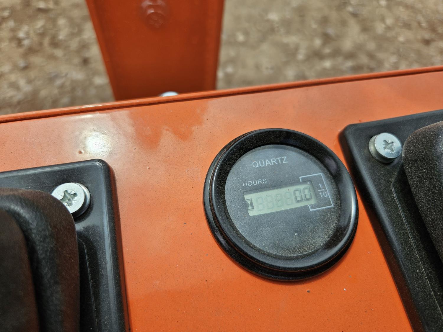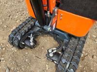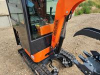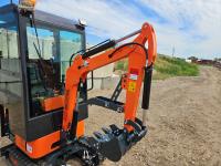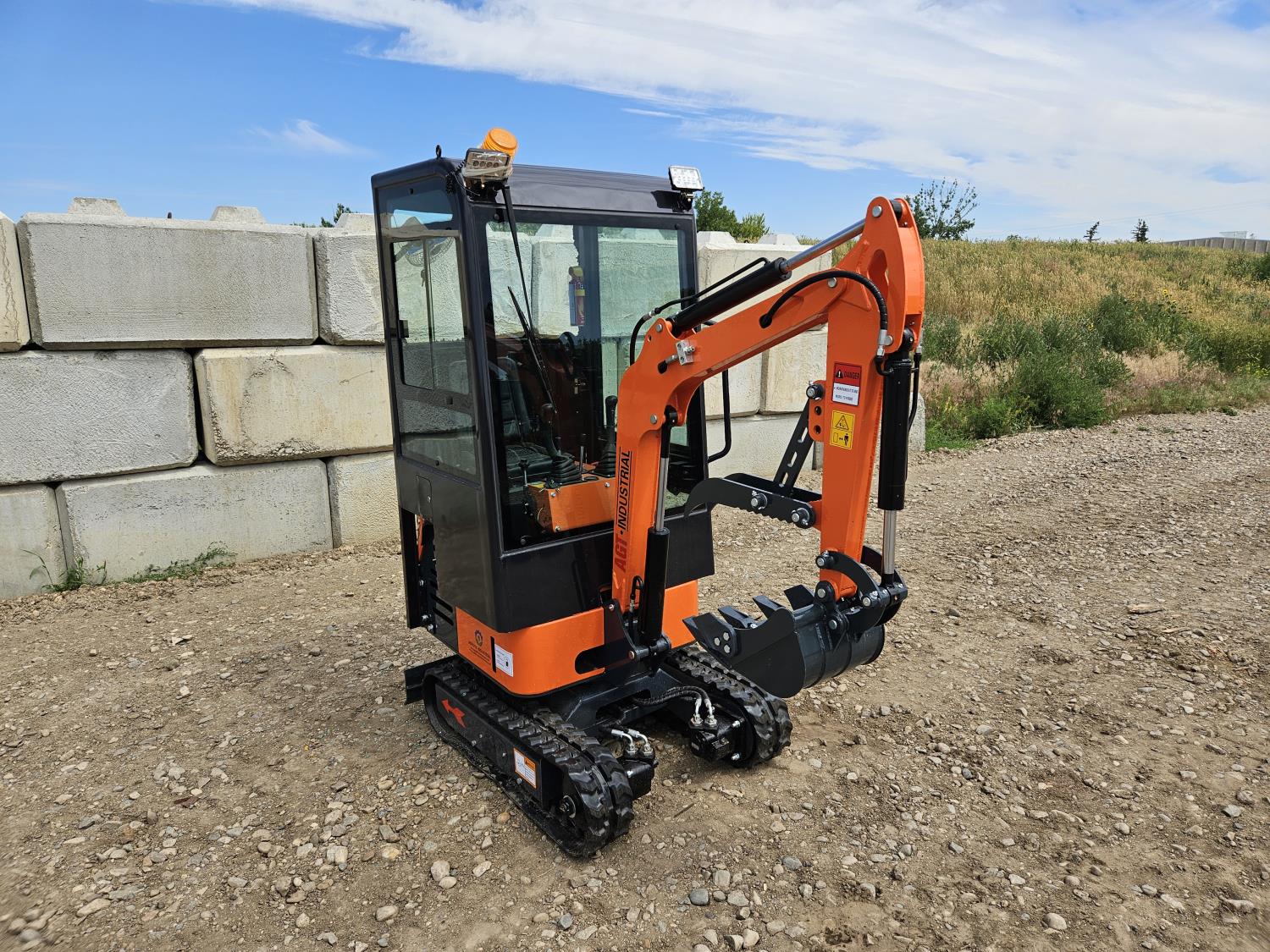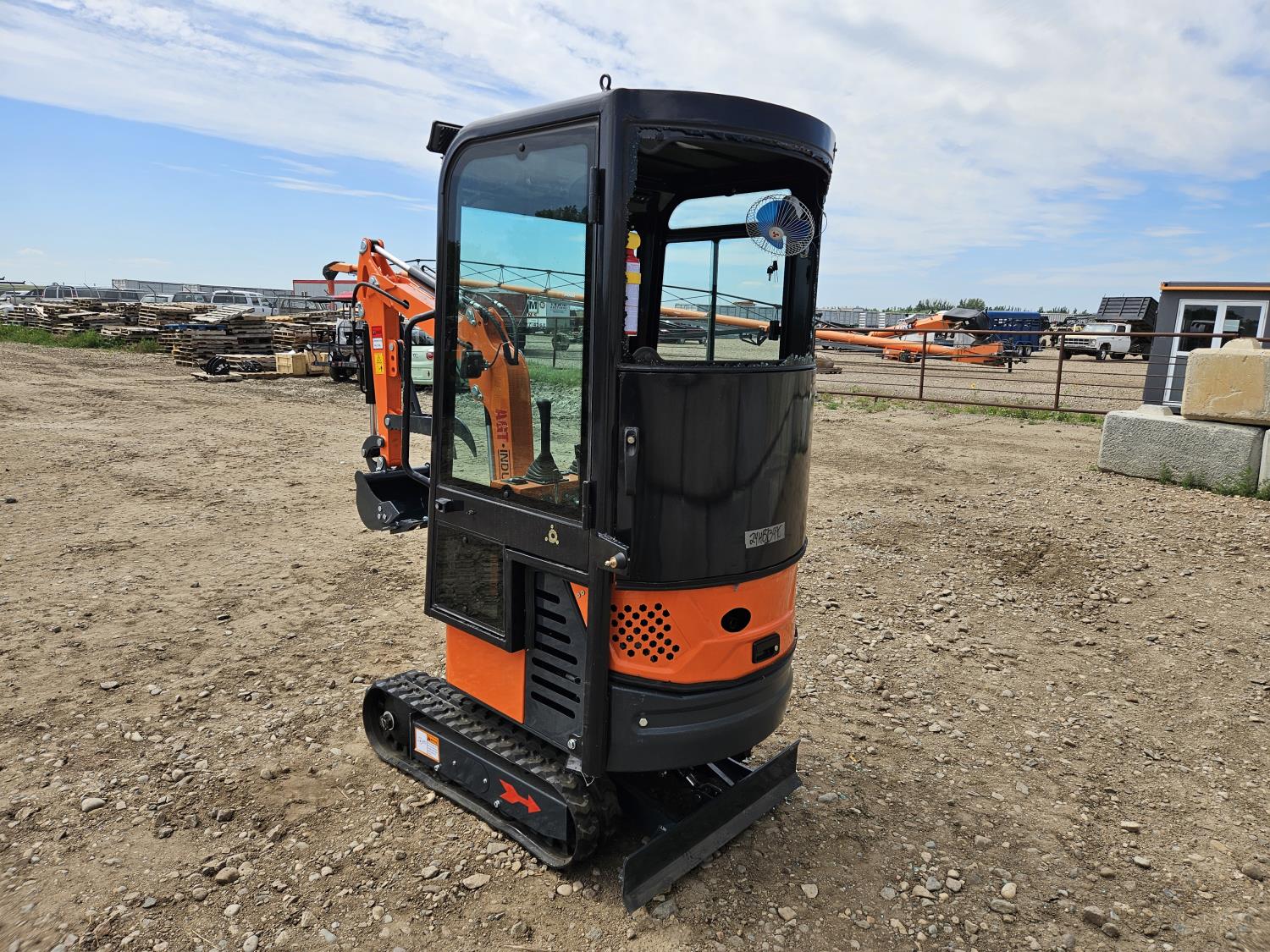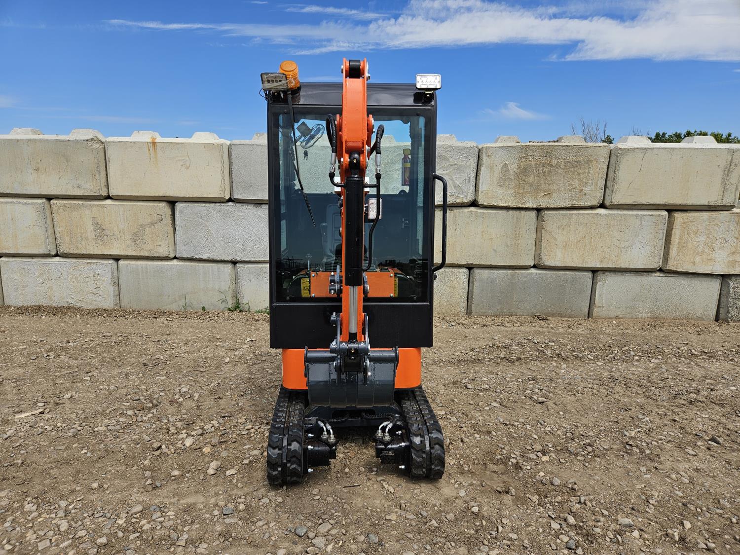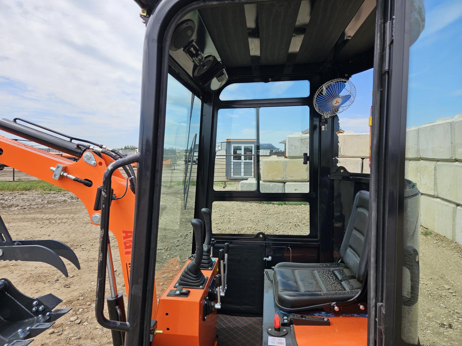 Enclosed cab, gas engine, 15" dig bucket, manual coupler, 39" stick, 37" backfill blade, 7" rubber tracks ,