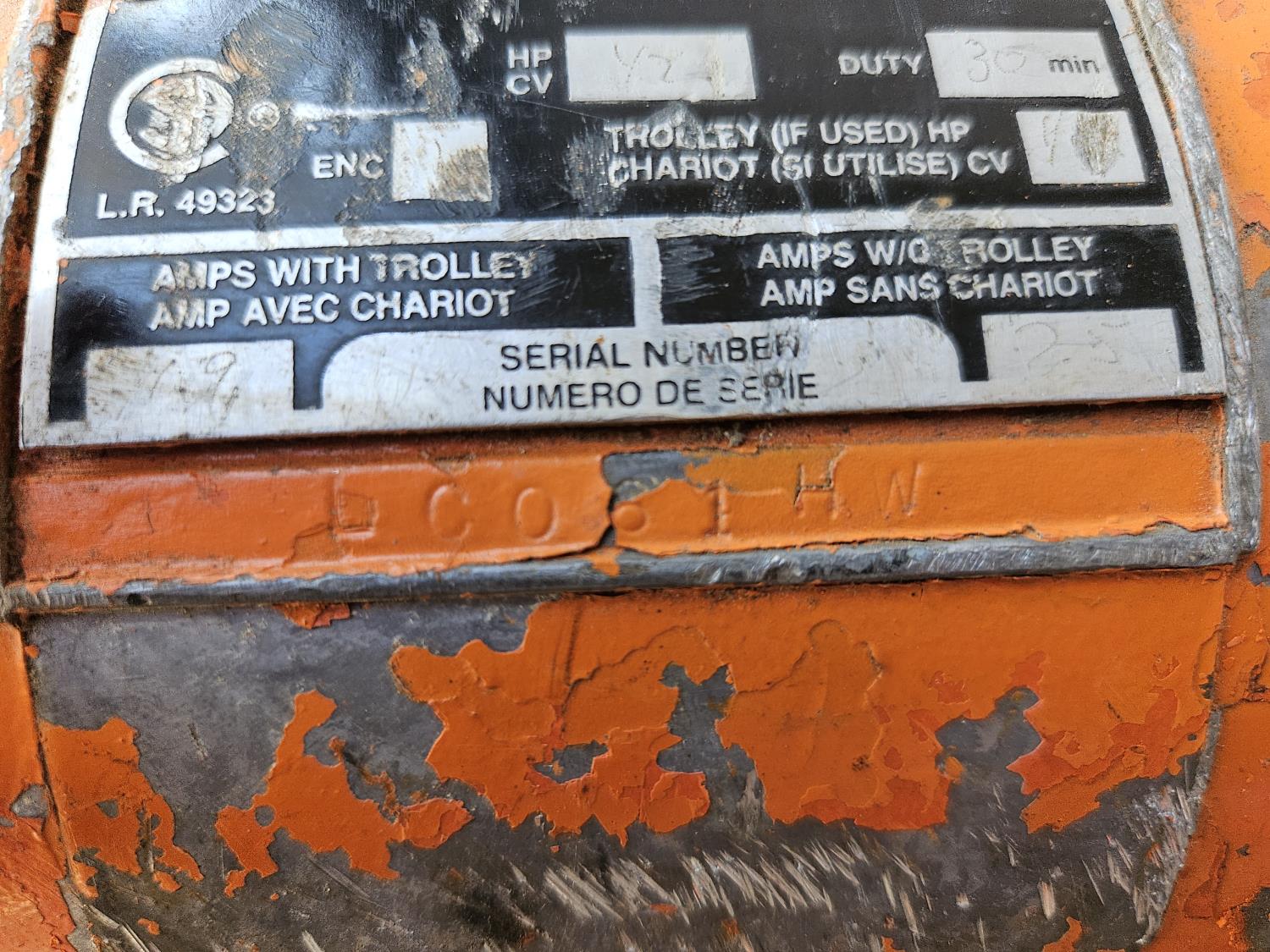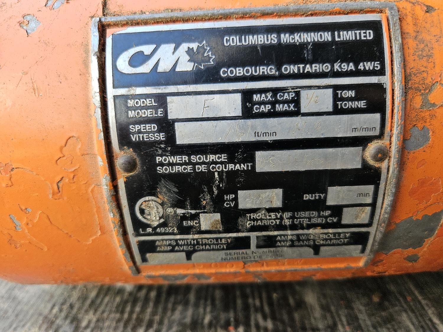1/2 ton max. capacity, speed 16 ft /min. , 115V, 60 Hz, 1/2 HP, 1.9A w/ trolley, 2.5A w/o trolley