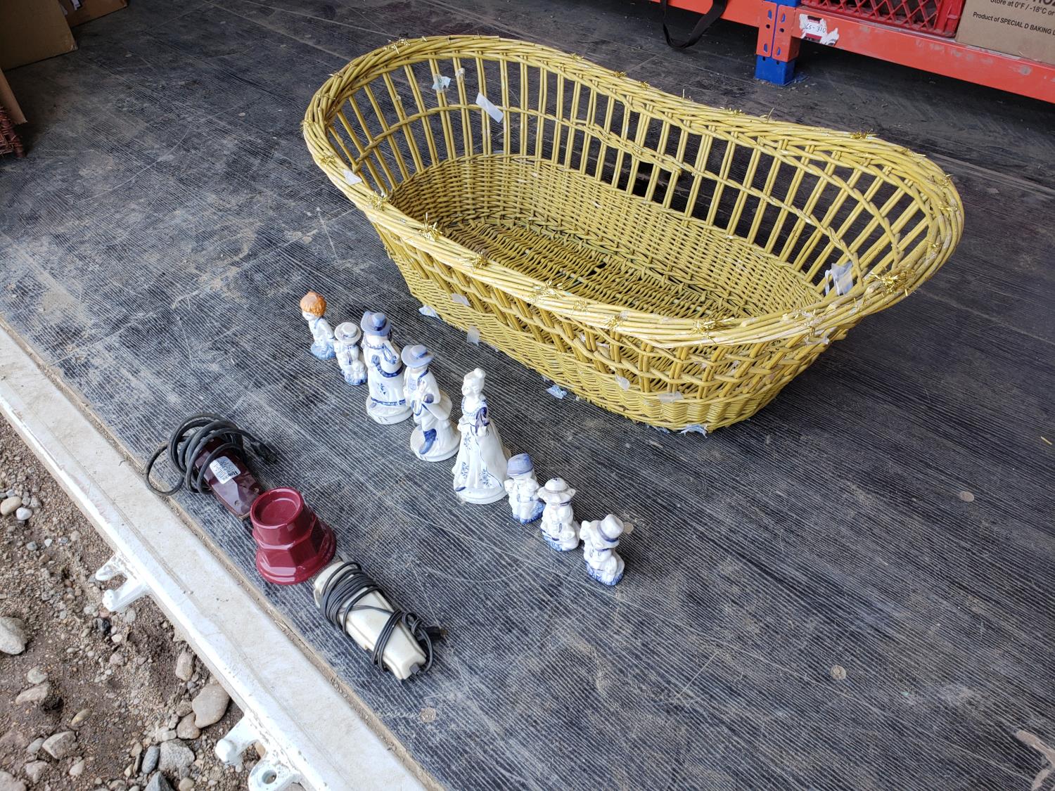 1031 Qty of (8) Porcelain Figurines W/ (2) Raycine Electric Hair Clippers, Candle Holder, Wicker Basket