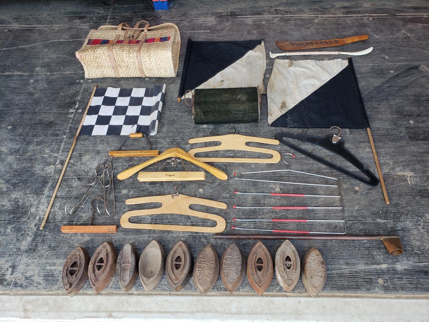 (10) Sad Irons w/ Foot Warmer, Hangers, Flags, Handbag, and Back Scratchers
