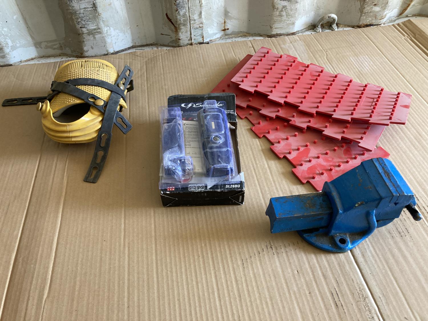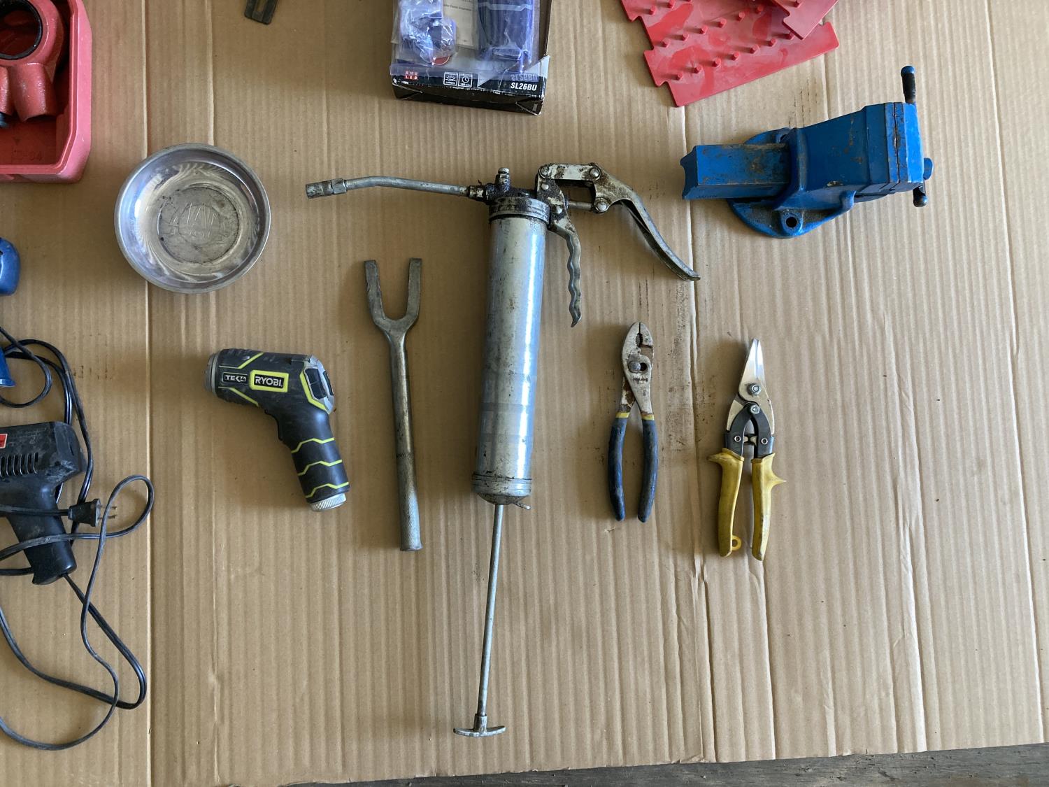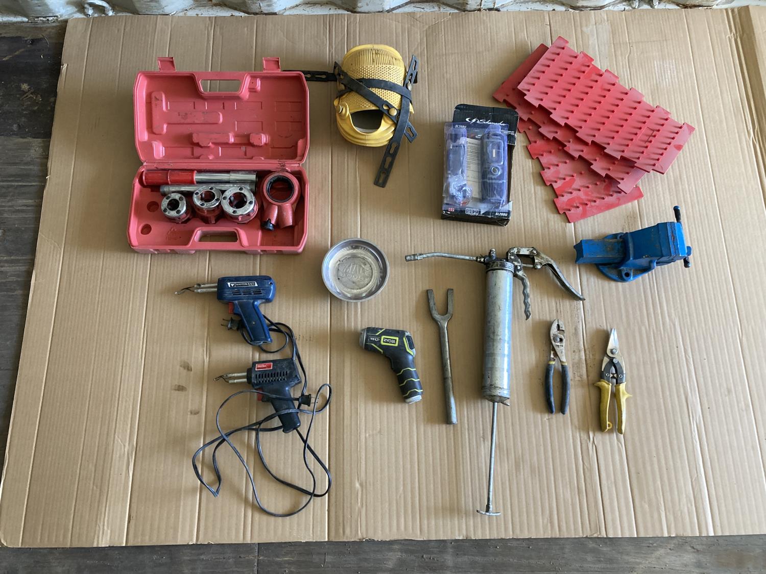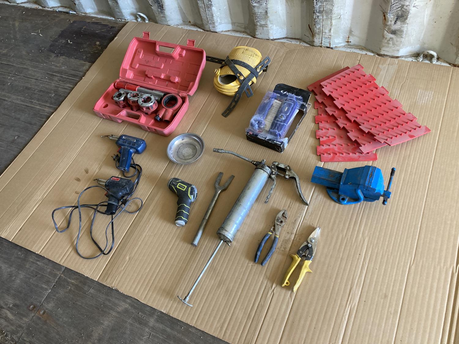 threader, (2) soldering guns, grease gun, vice, knee pads, magnet tray, snips, ball joint fork