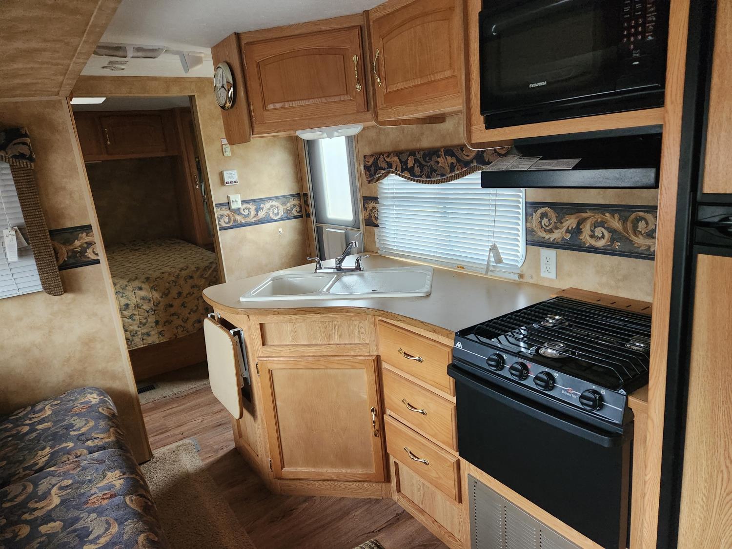 stove, fridge, microwave, full bath, master bedroom, bunk beds, A/C, manual awning, spring suspension, 13ft slide, 225/75R15 tires