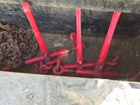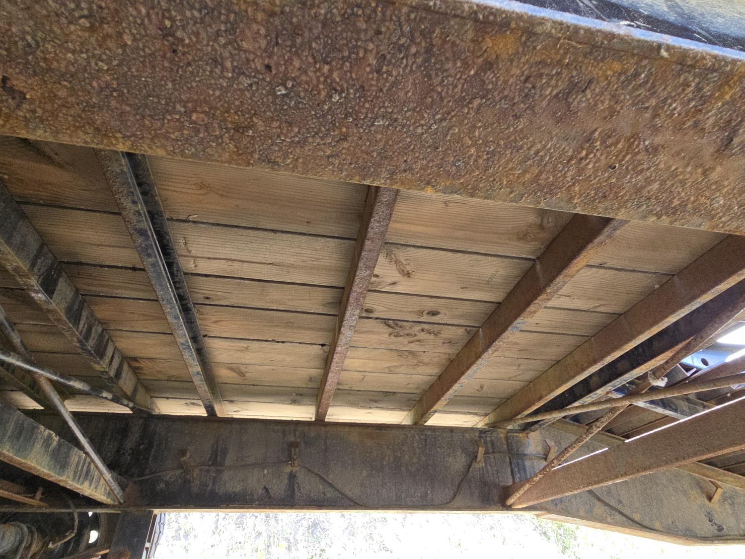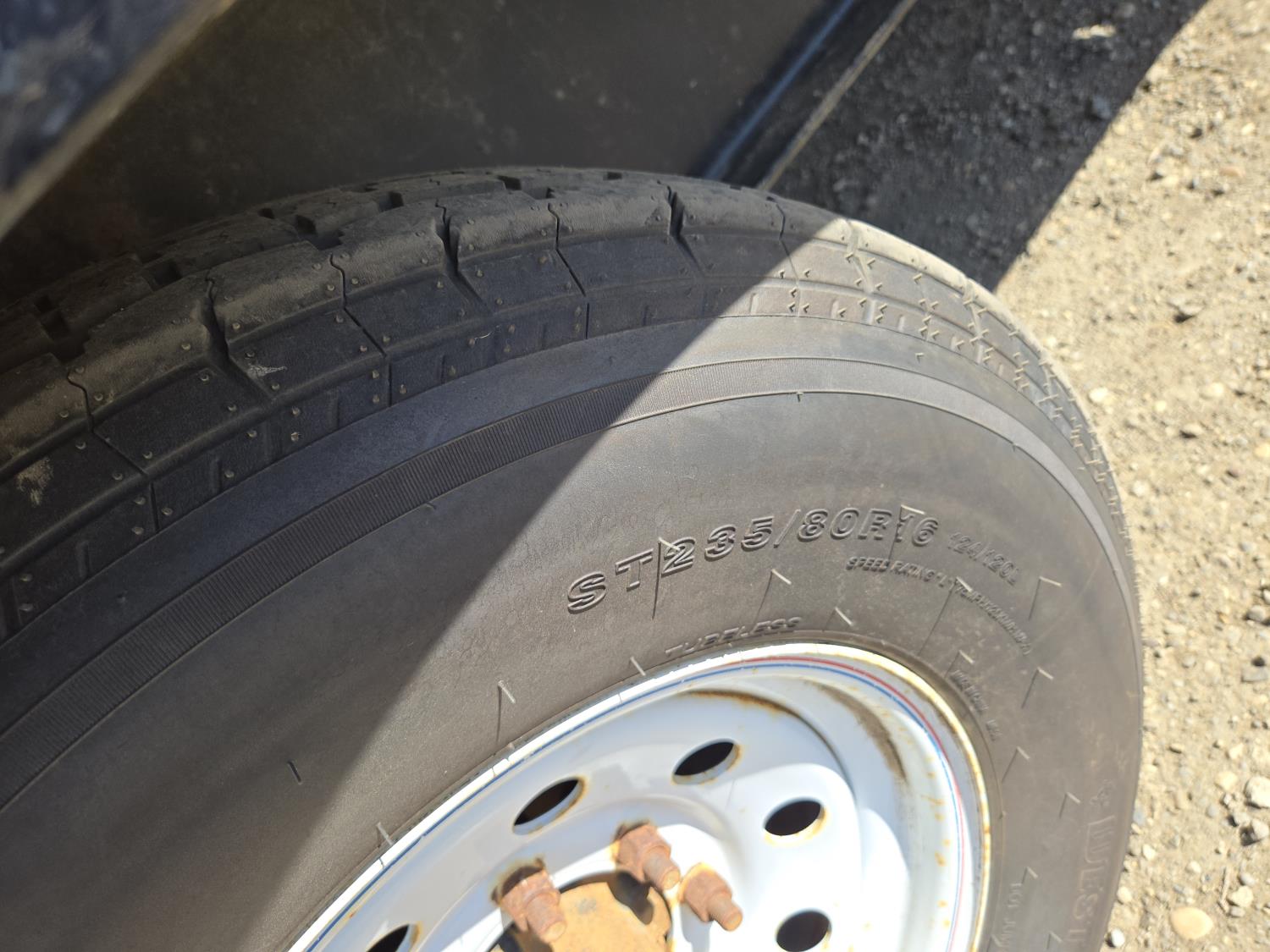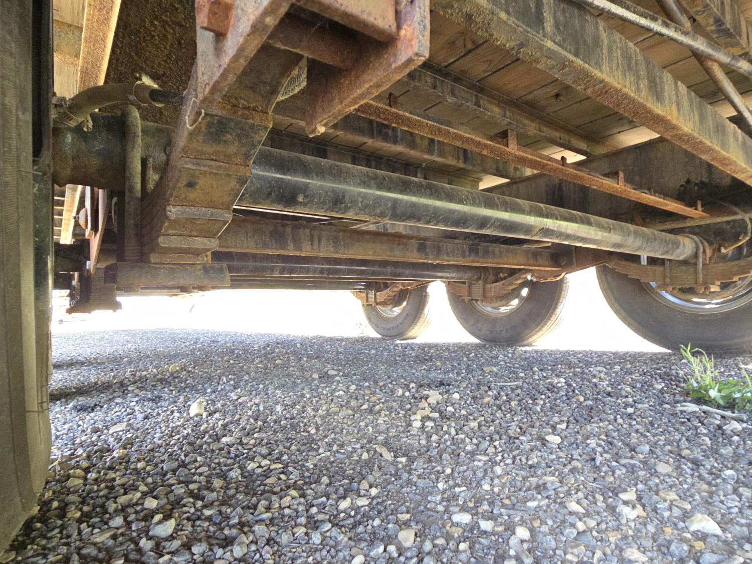 102 inch wide deck, wood deck, electric brakes, spring suspension, tool / storage box, rub rails, stake pockets, full width spring assisted flip over ramps, dual jacks, some chains and load binders, 7000 lb axles, ST235/80R16 tires