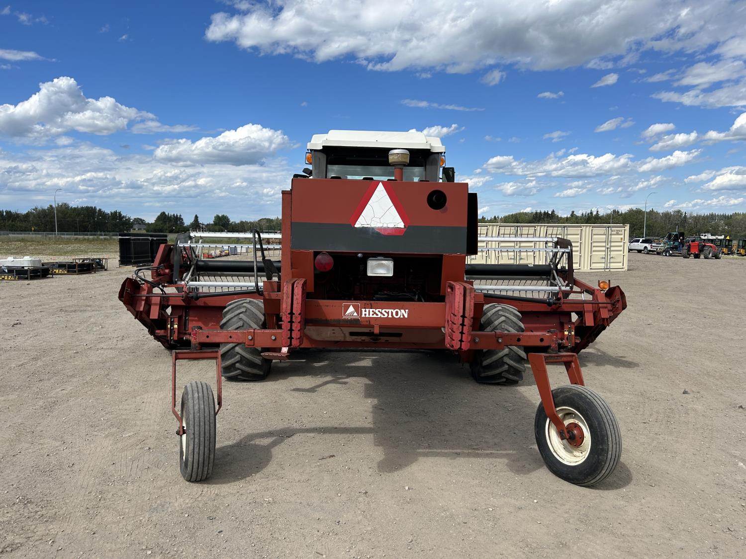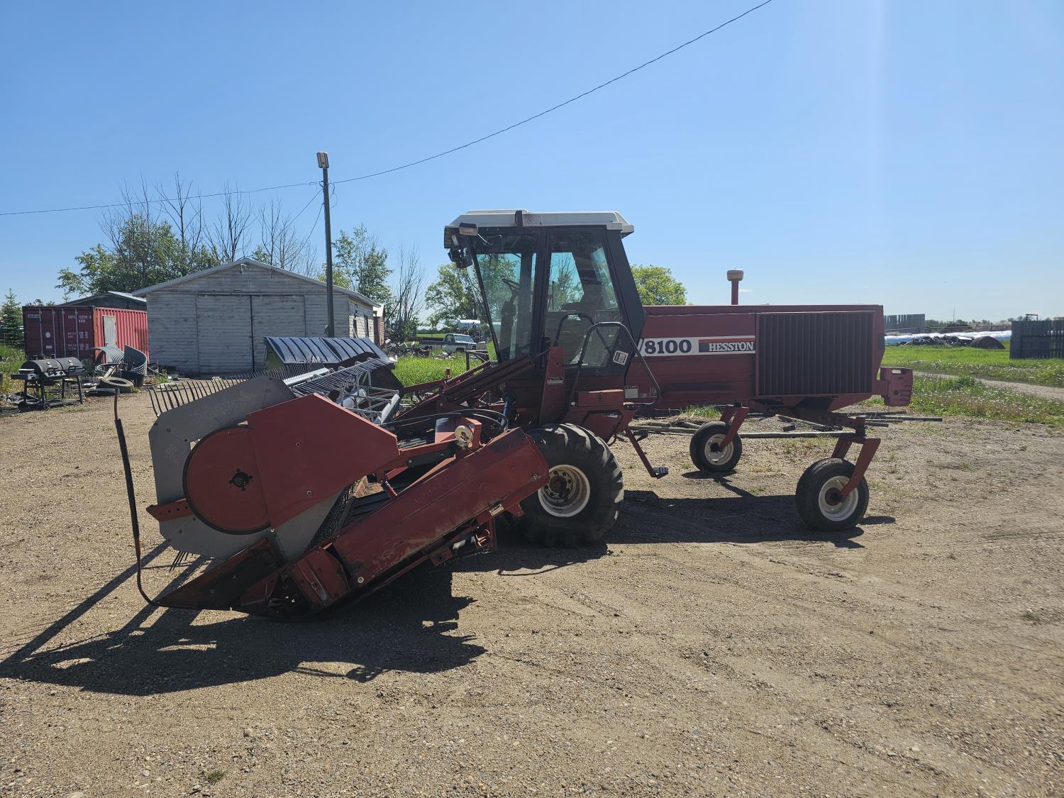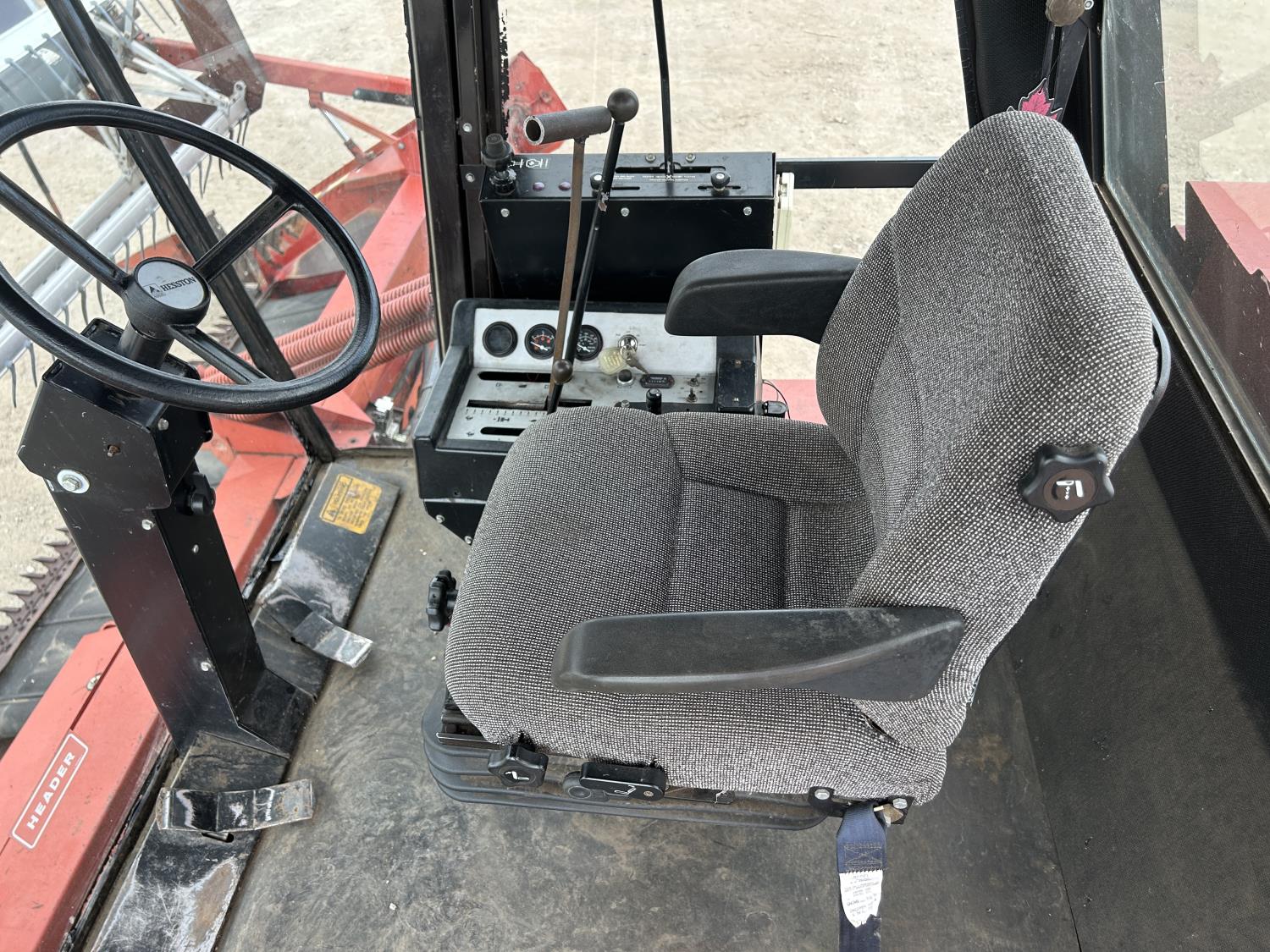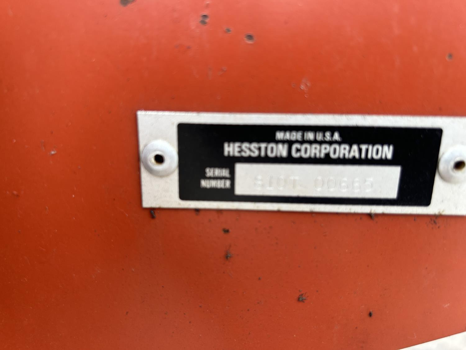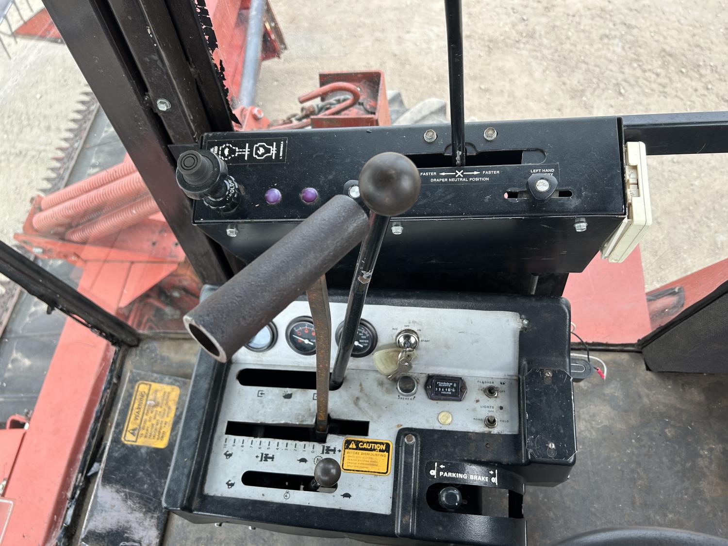 Hesston 8100 center delivery rigid draper header, pickup reel, variable speed reel, skid plates, crop dividers, Evco 4 cylinder diesel engine, radio, upgraded stereo, air ride seat