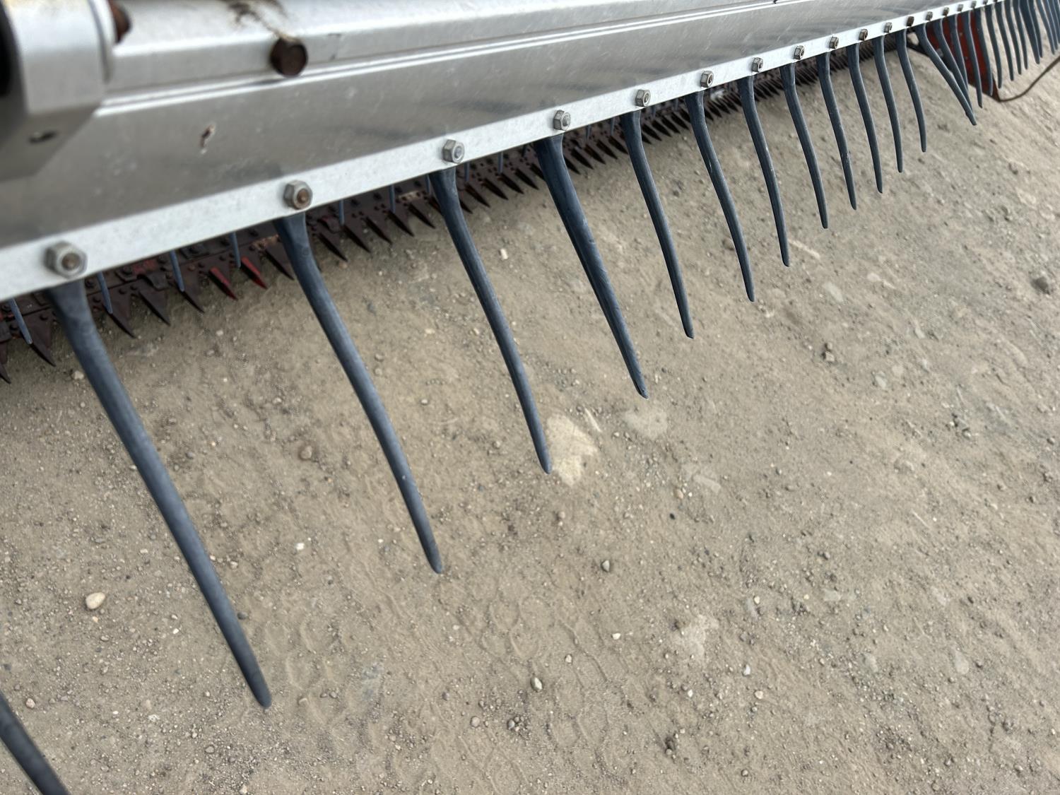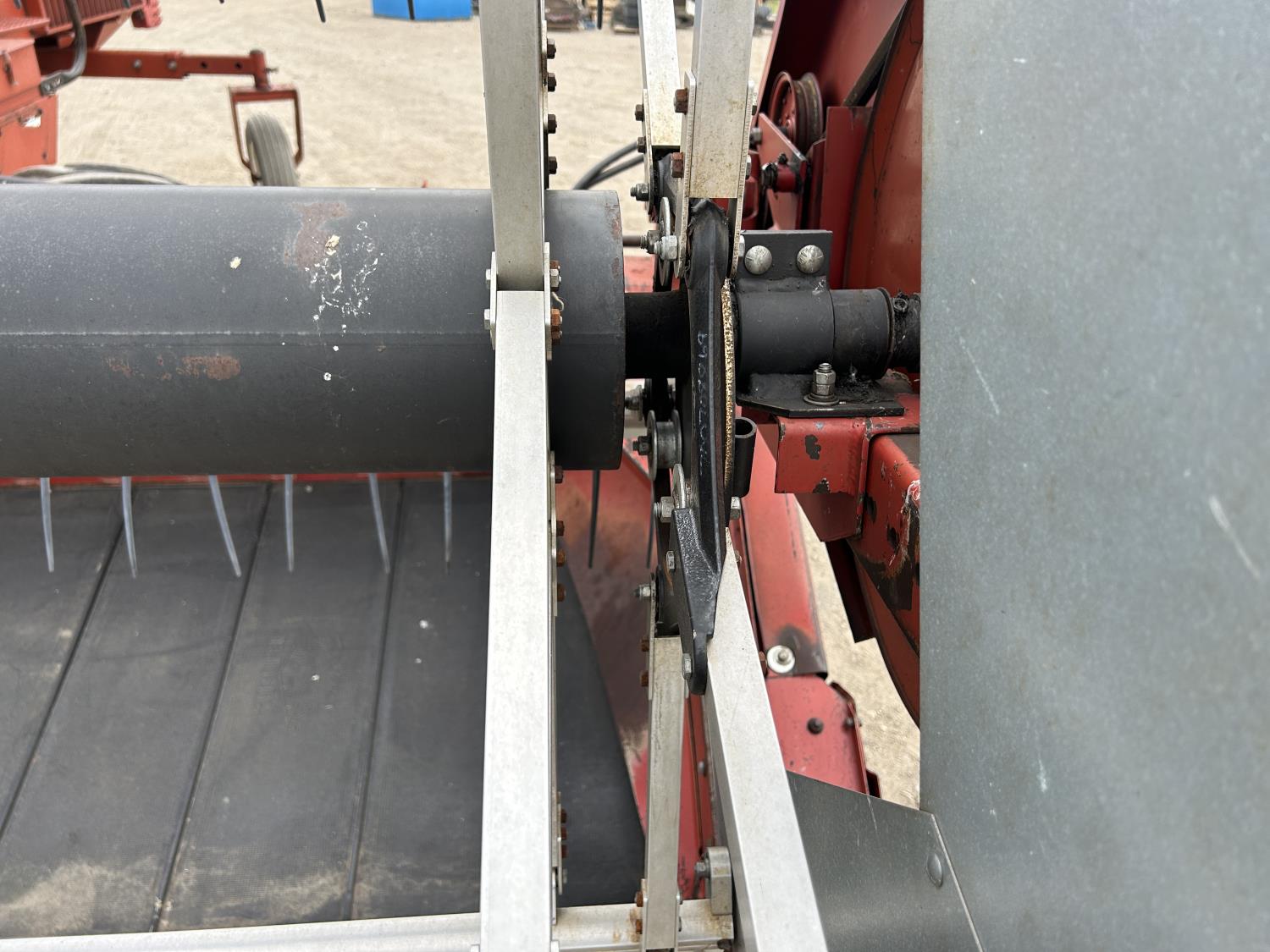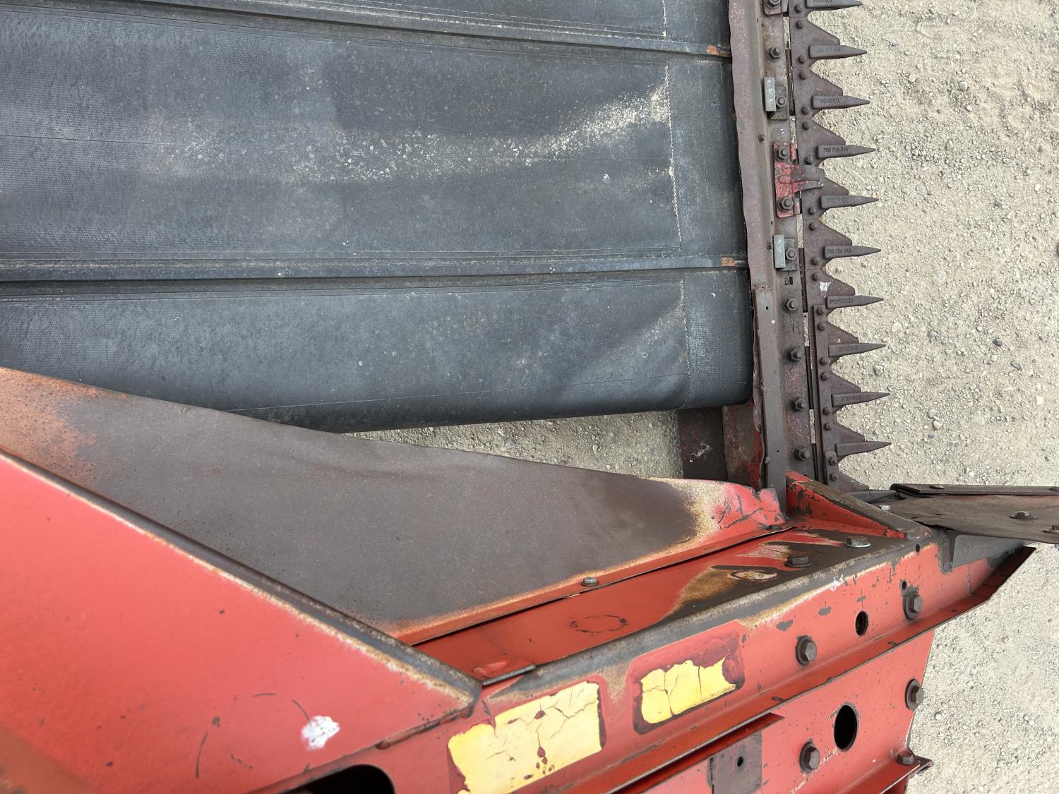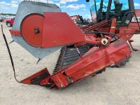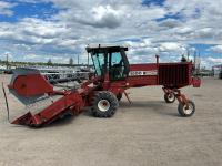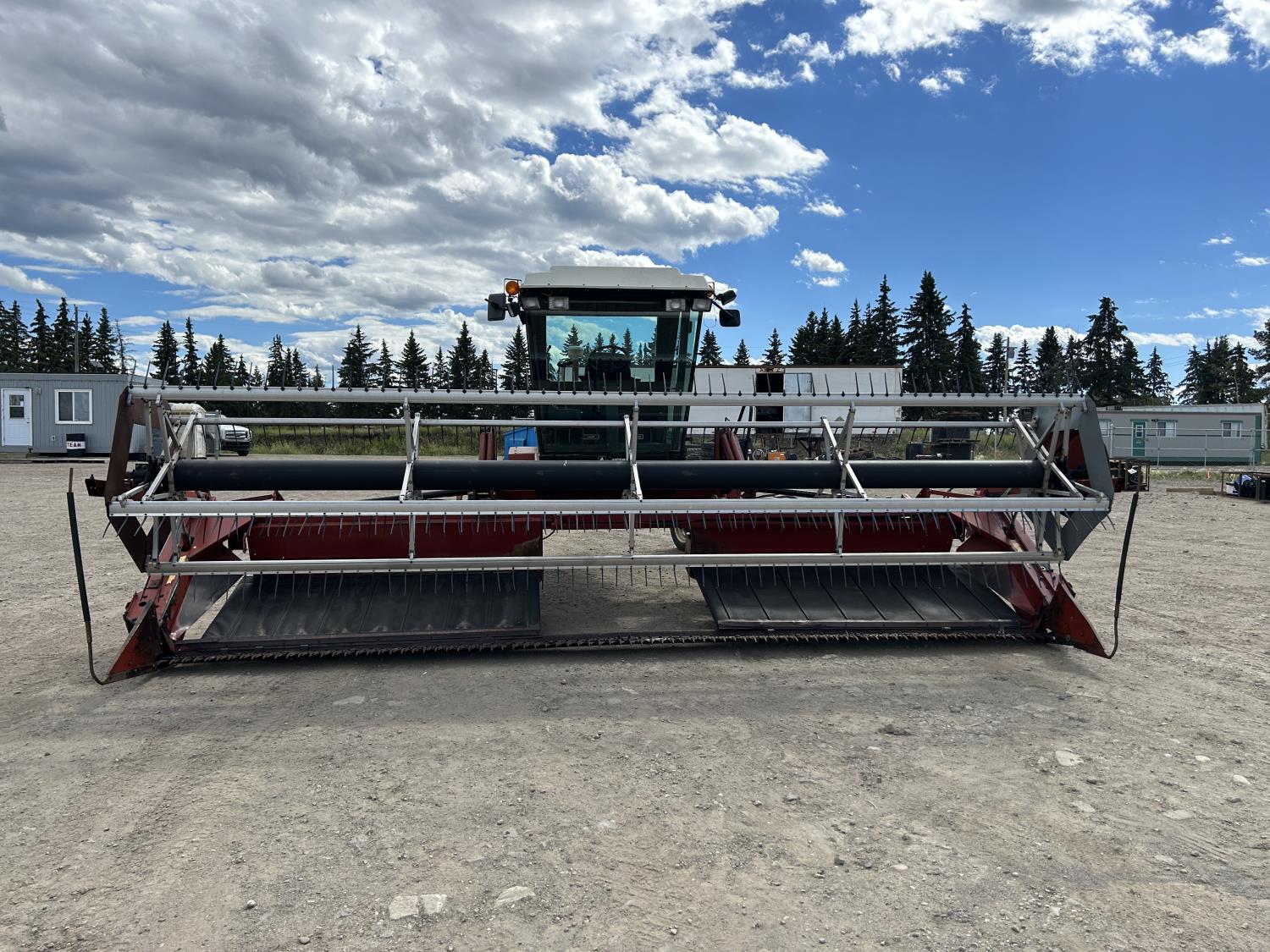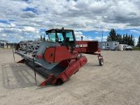 Hesston 8100 center delivery rigid draper header, pickup reel, variable speed reel, skid plates, crop dividers, Evco 4 cylinder diesel engine, radio, upgraded stereo, air ride seat