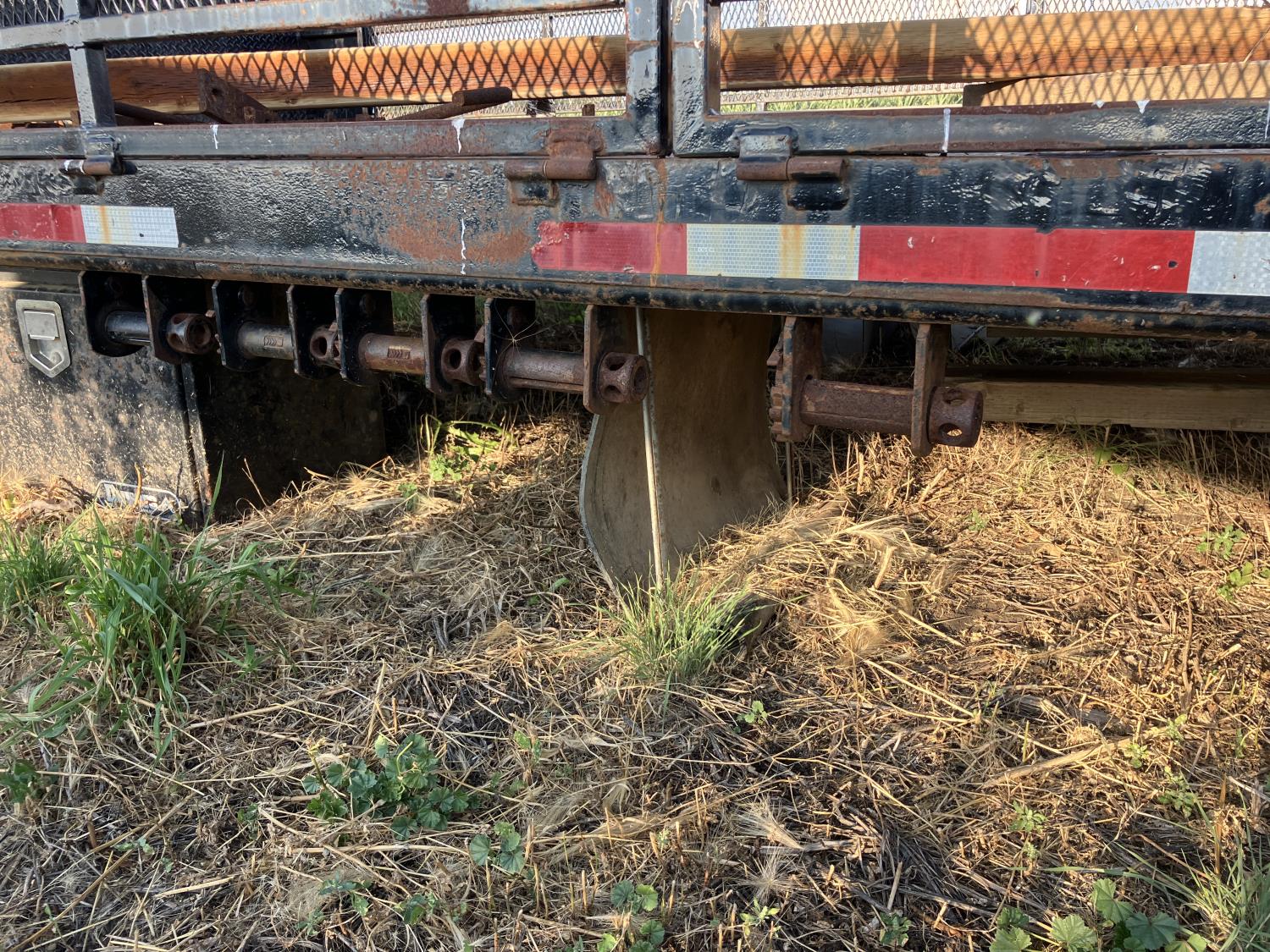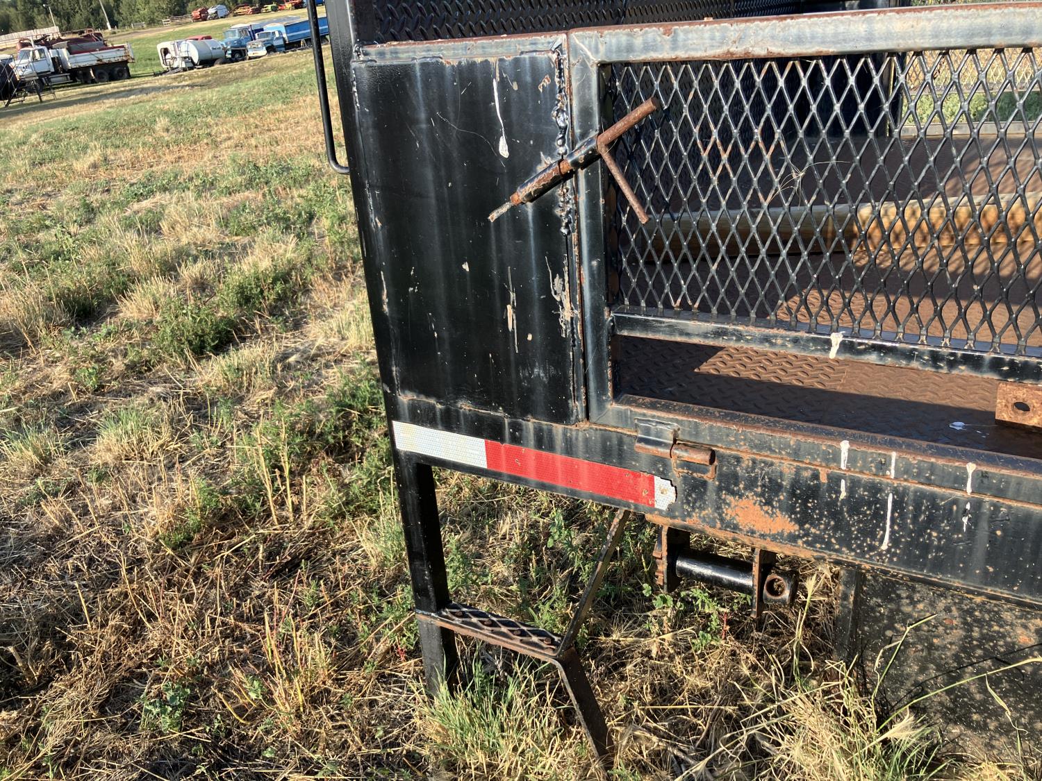 102 inch wide, 18 inch fold down mesh sides, cargo winches on left side, headache rack, backup lights, block hanger on right side, tool box