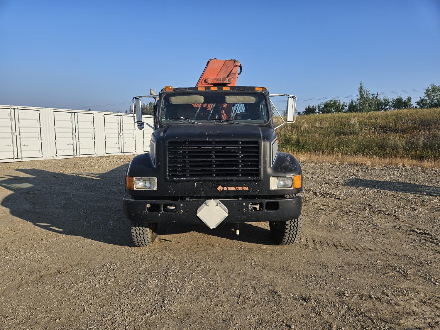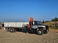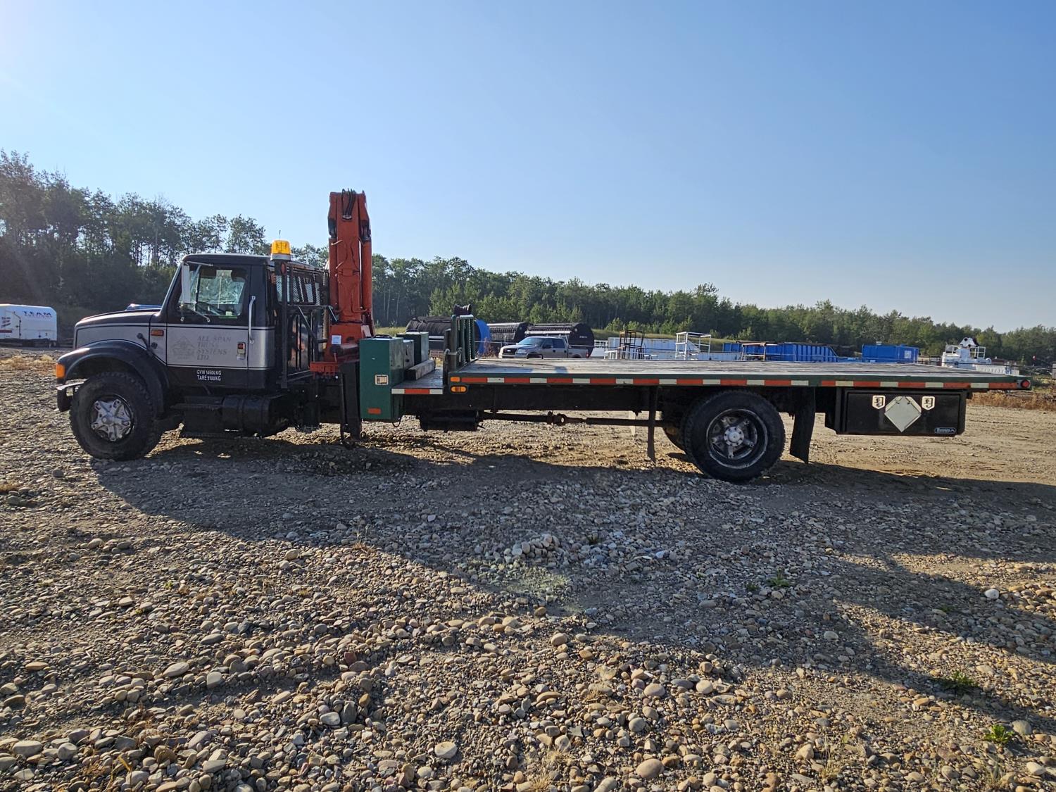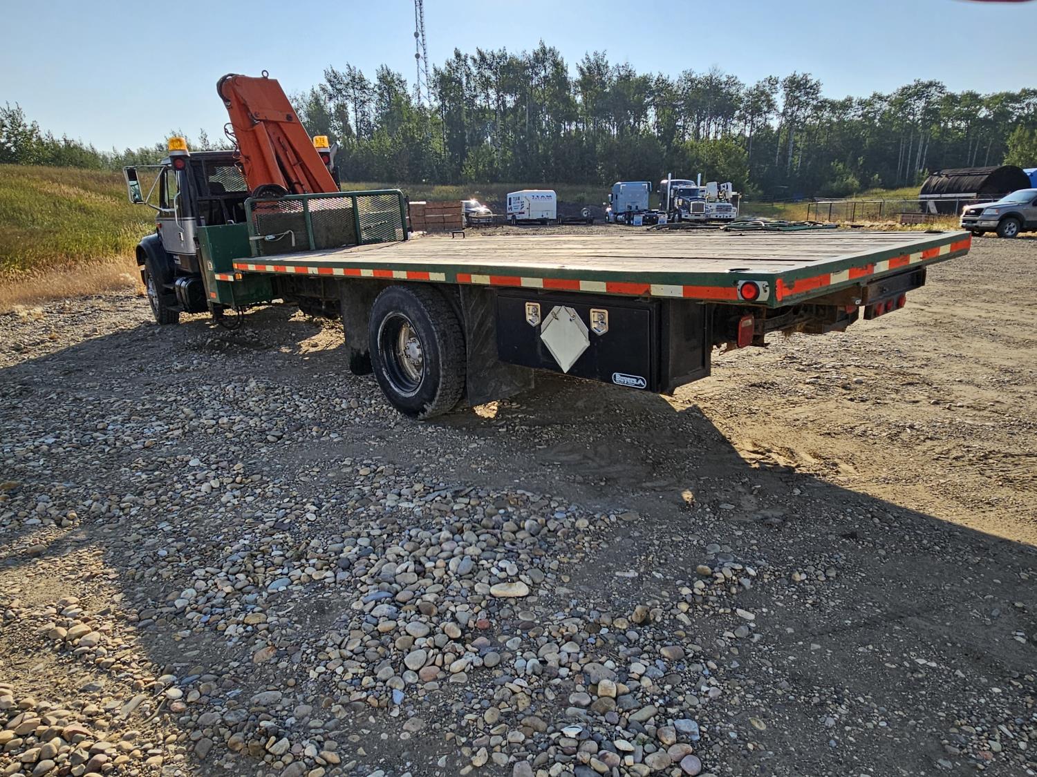 International 6 cylinder diesel engine, 5 X 2 manual transmission, hydraulic wet kit, tool boxes, 8 ft x 20 ft deck, beacons, HAP 1710 D 2 section knuckle crane, outriggers, spring suspension, 236 inch WB, 11R22.5 tires