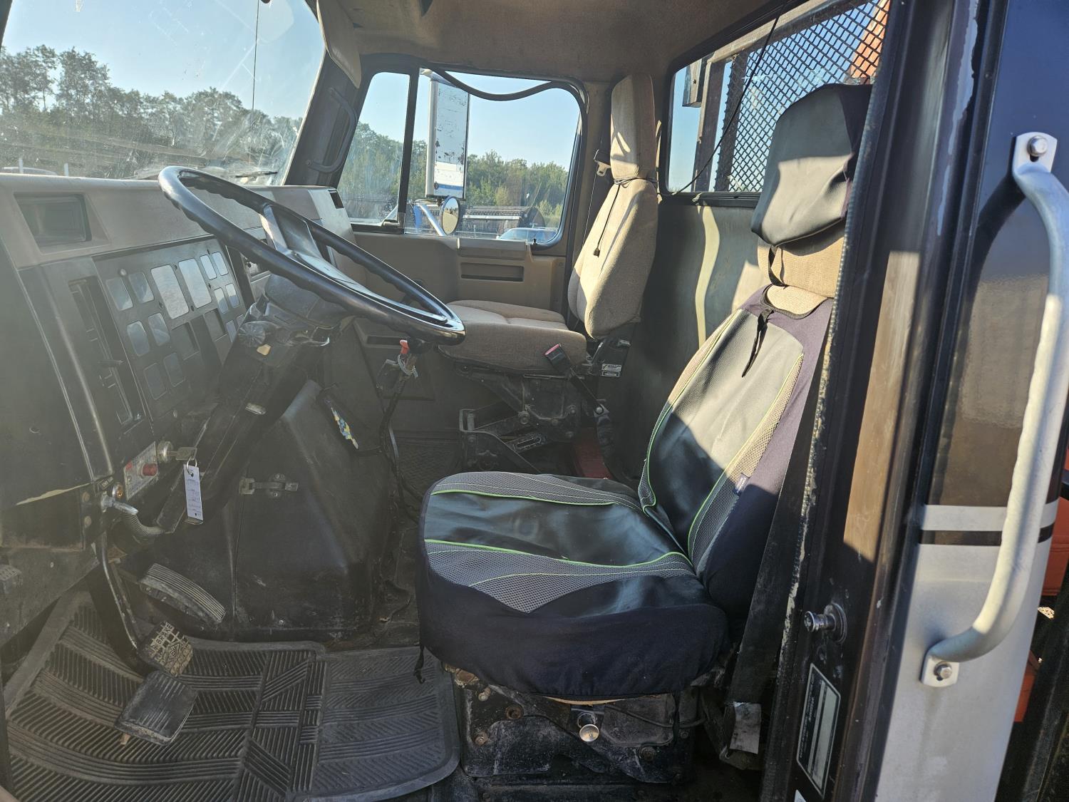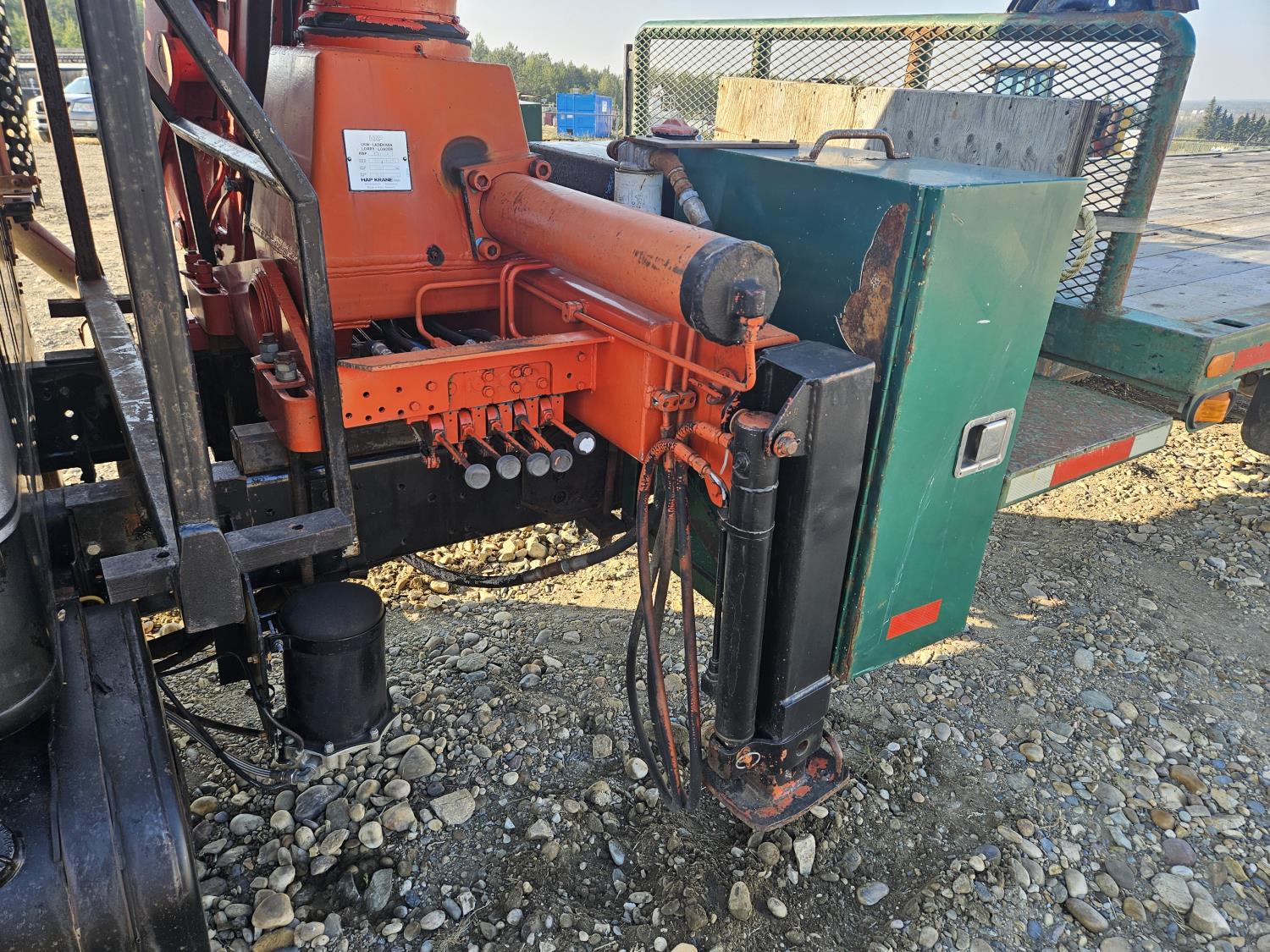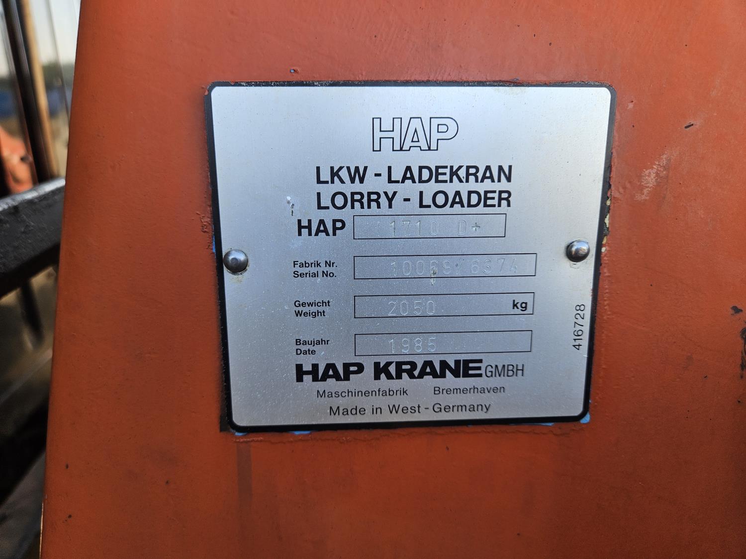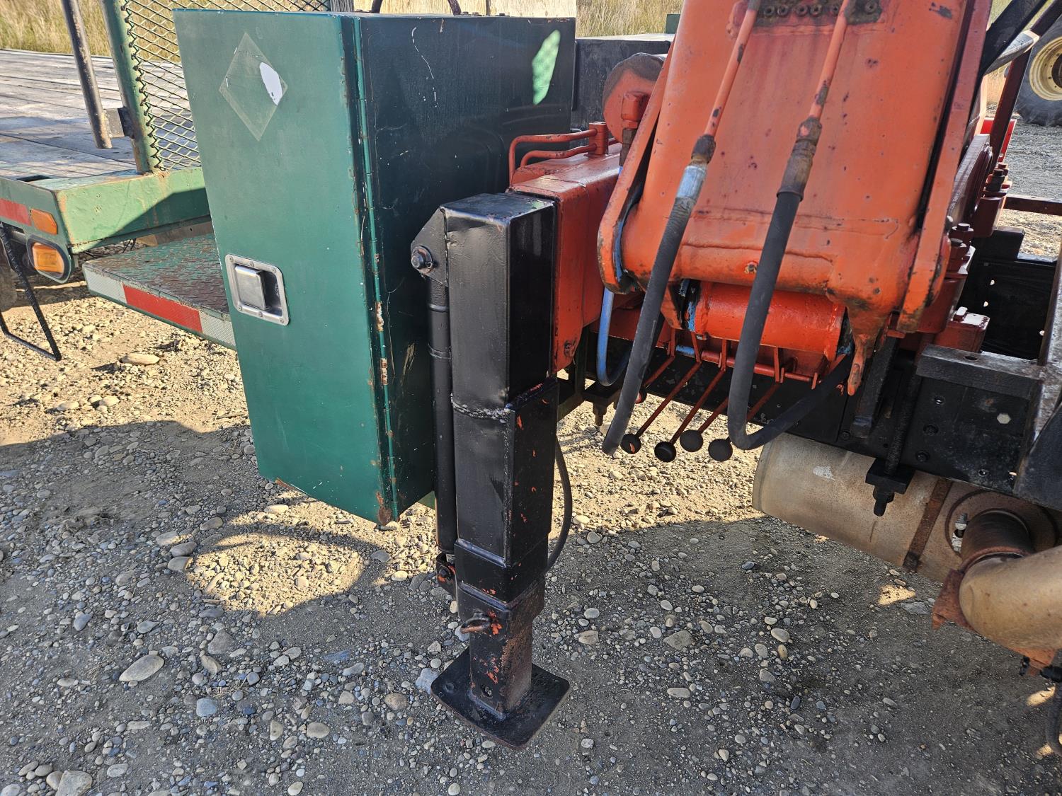International 6 cylinder diesel engine, 5 X 2 manual transmission, hydraulic wet kit, tool boxes, 8 ft x 20 ft deck, beacons, HAP 1710 D 2 section knuckle crane, outriggers, spring suspension, 236 inch WB, 11R22.5 tires