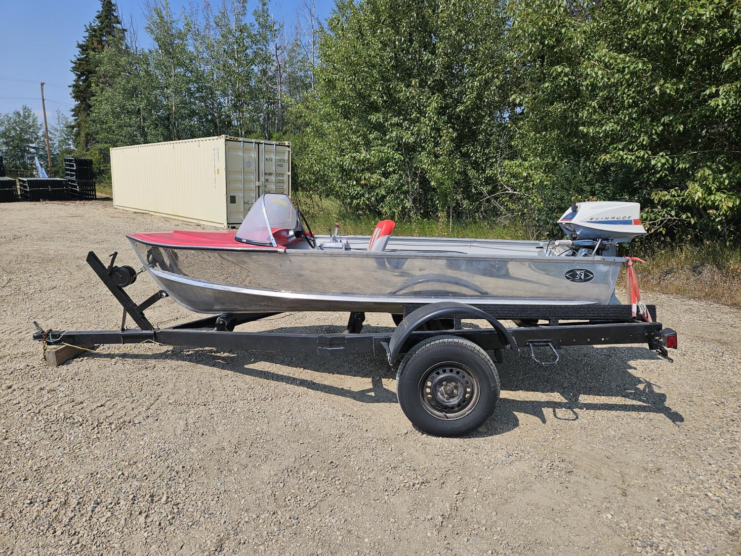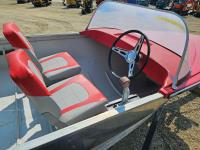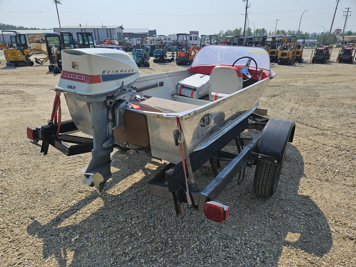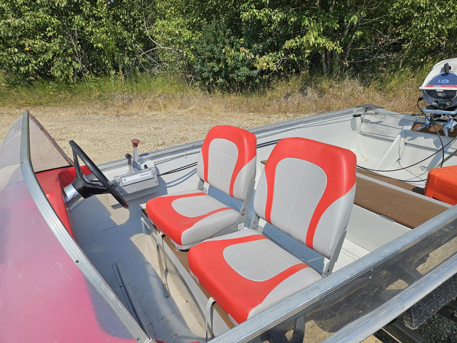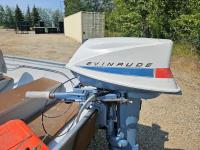 12 ft Sears aluminum boat with 18HP outboard Evinrude. Fresh paint on the interior with two new swivel bucket seats, new steering cable, fuel tank and storage under the second bench seat. No leaks and motor runs.