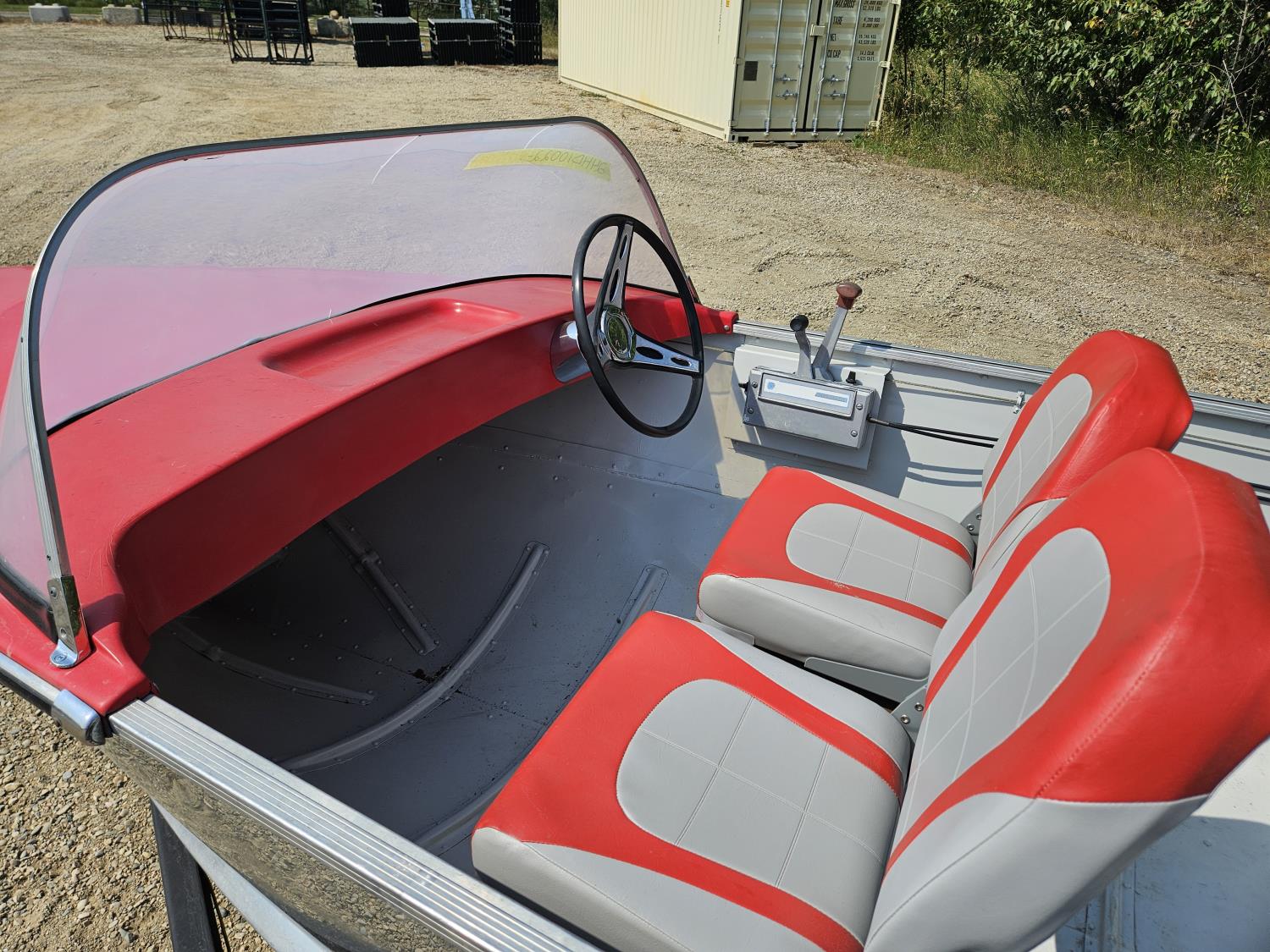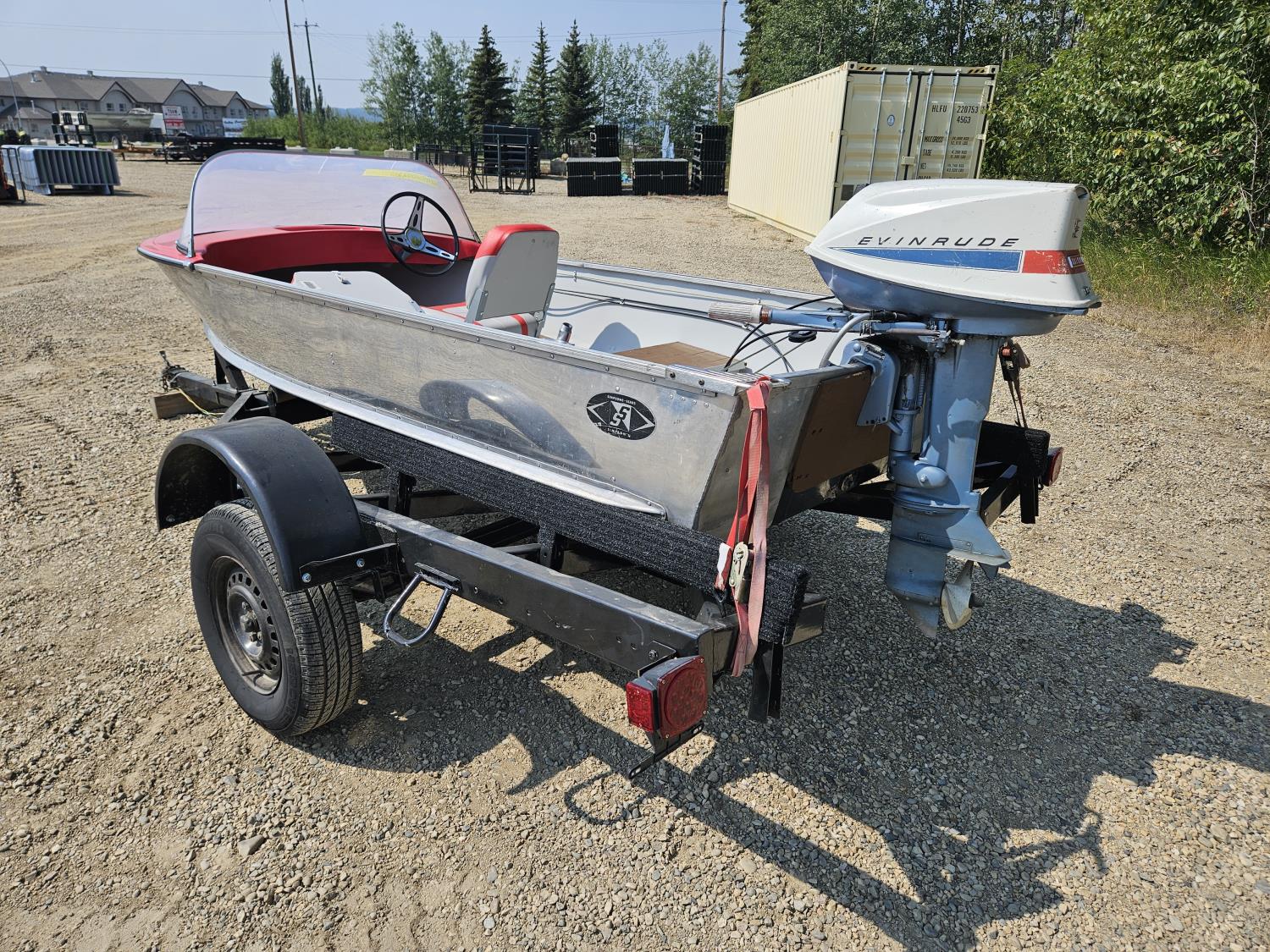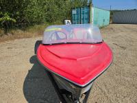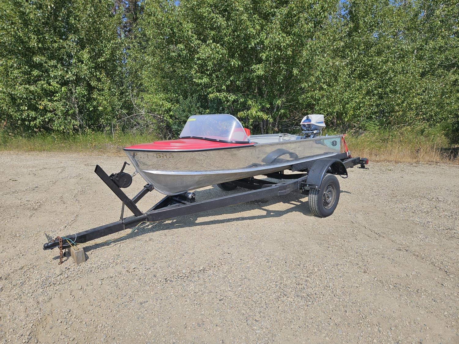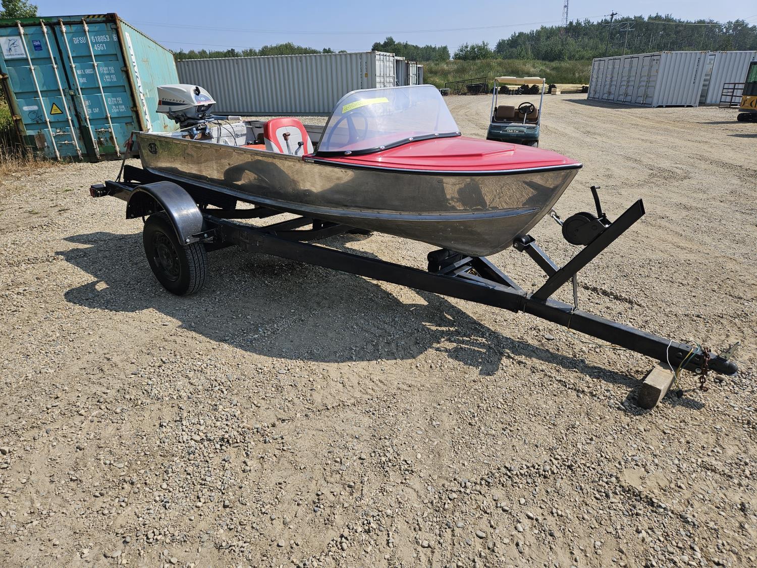 12 ft Sears aluminum boat with 18HP outboard Evinrude. Fresh paint on the interior with two new swivel bucket seats, new steering cable, fuel tank and storage under the second bench seat. No leaks and motor runs.