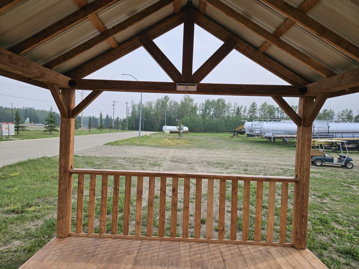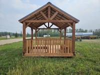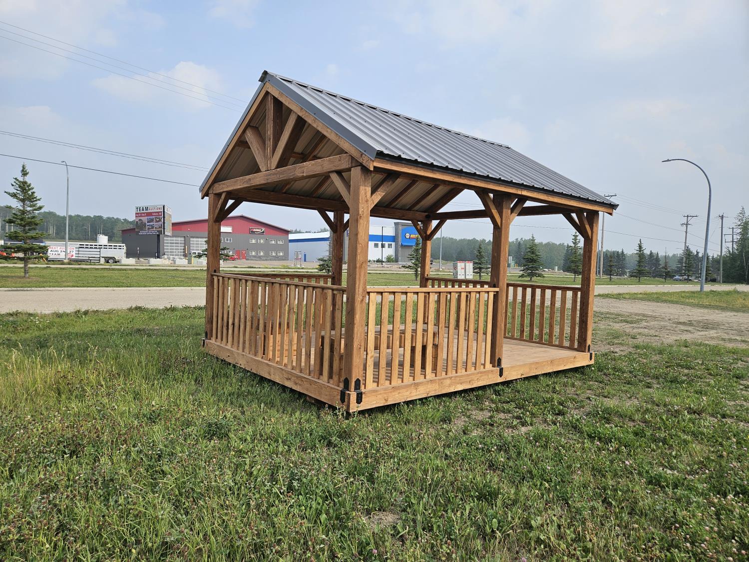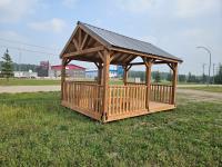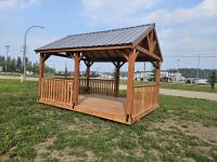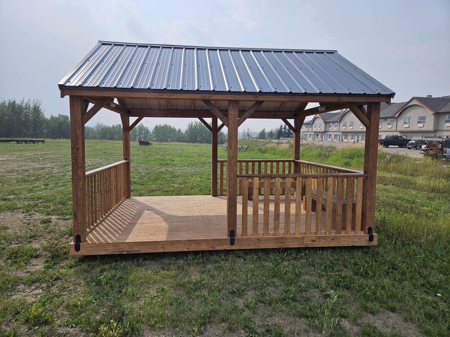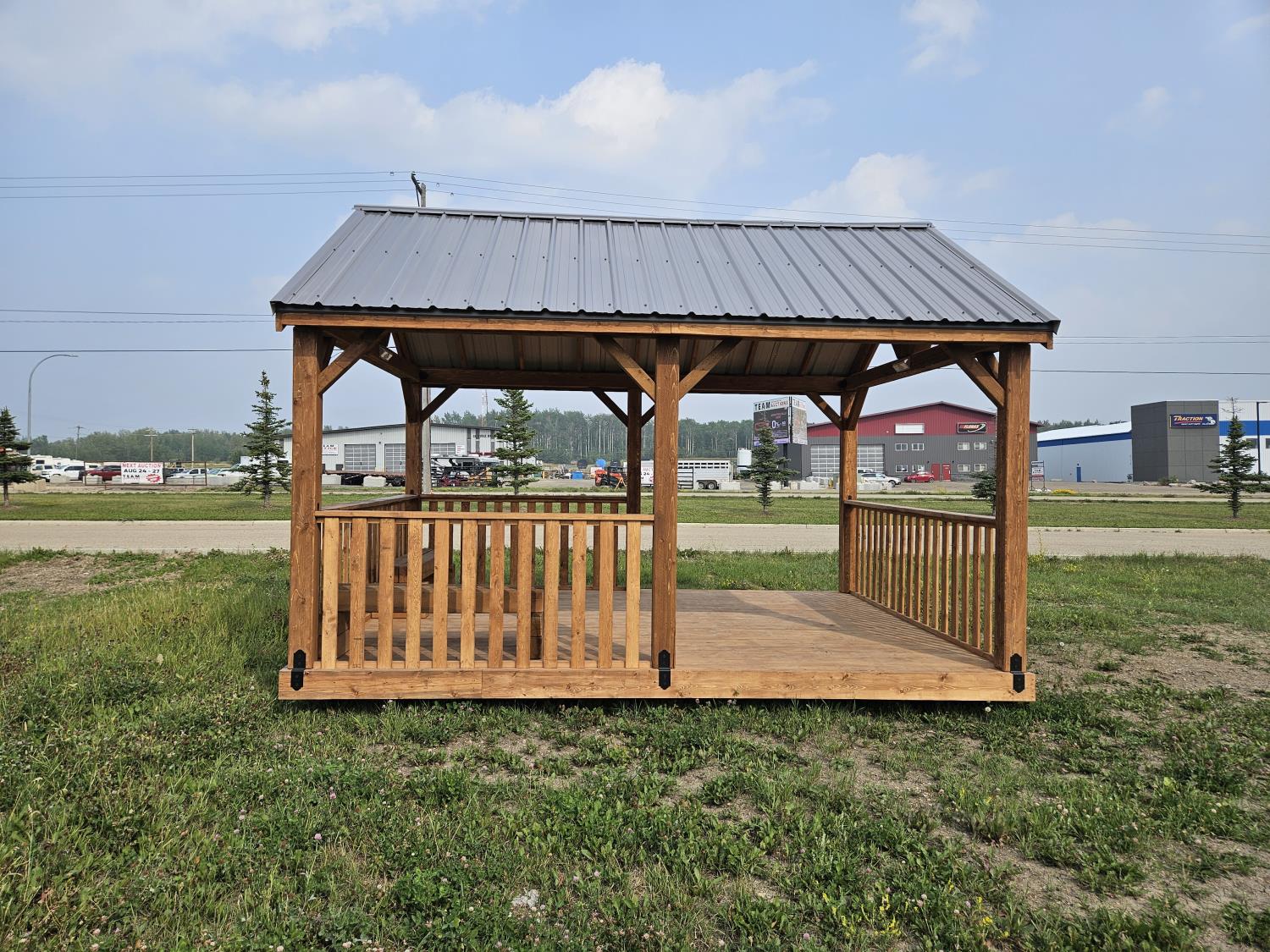 147 inch x 195 inch, 40 inch hand rail, interior lights, (2) 5 ft benches, tin roof