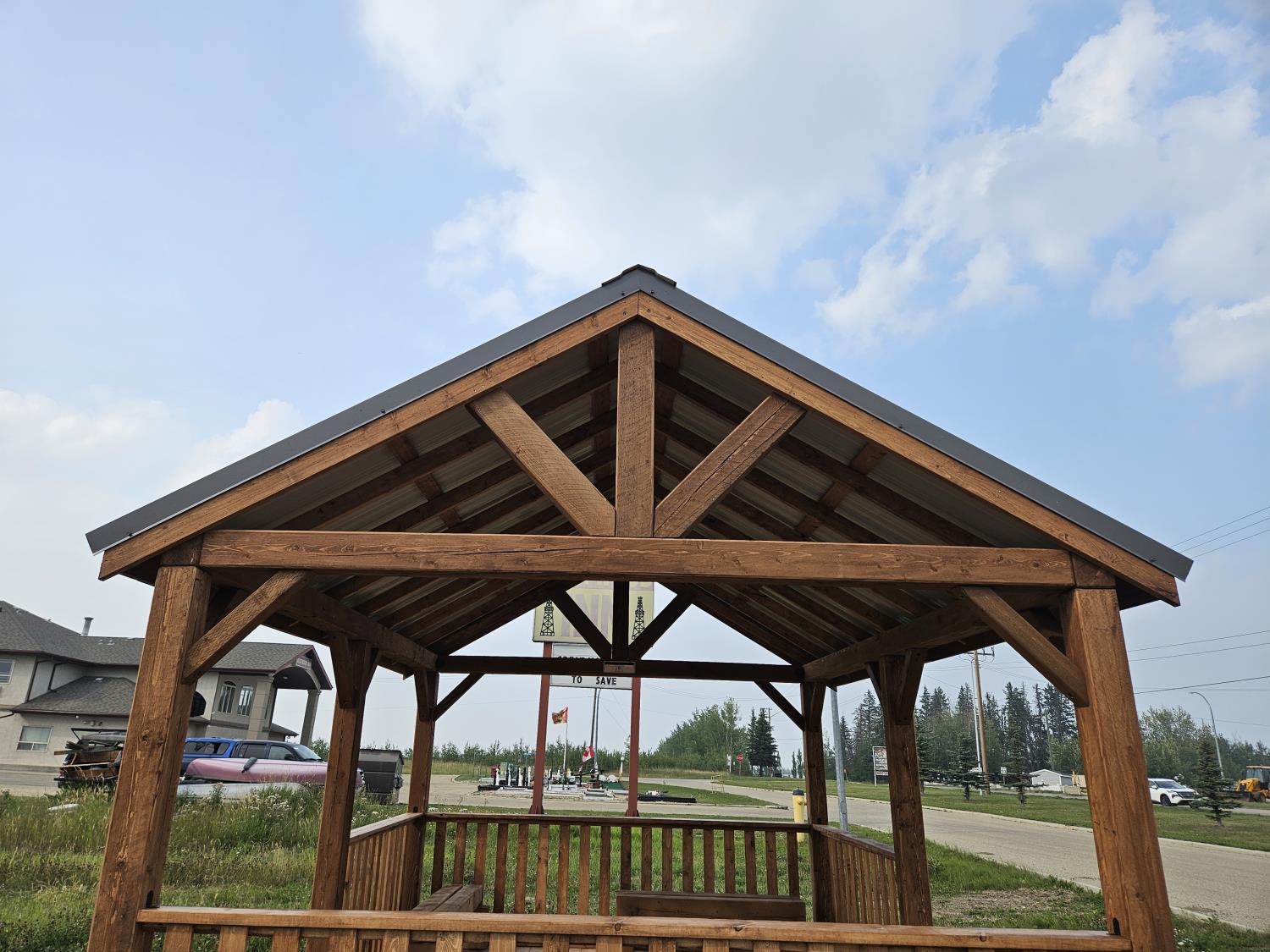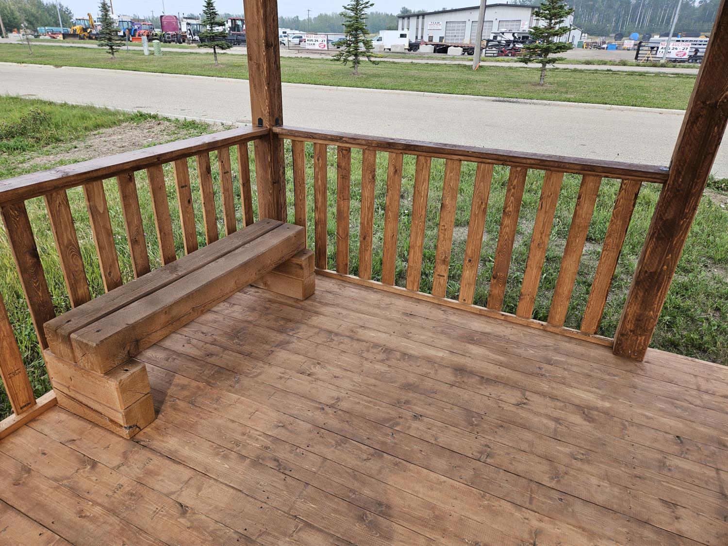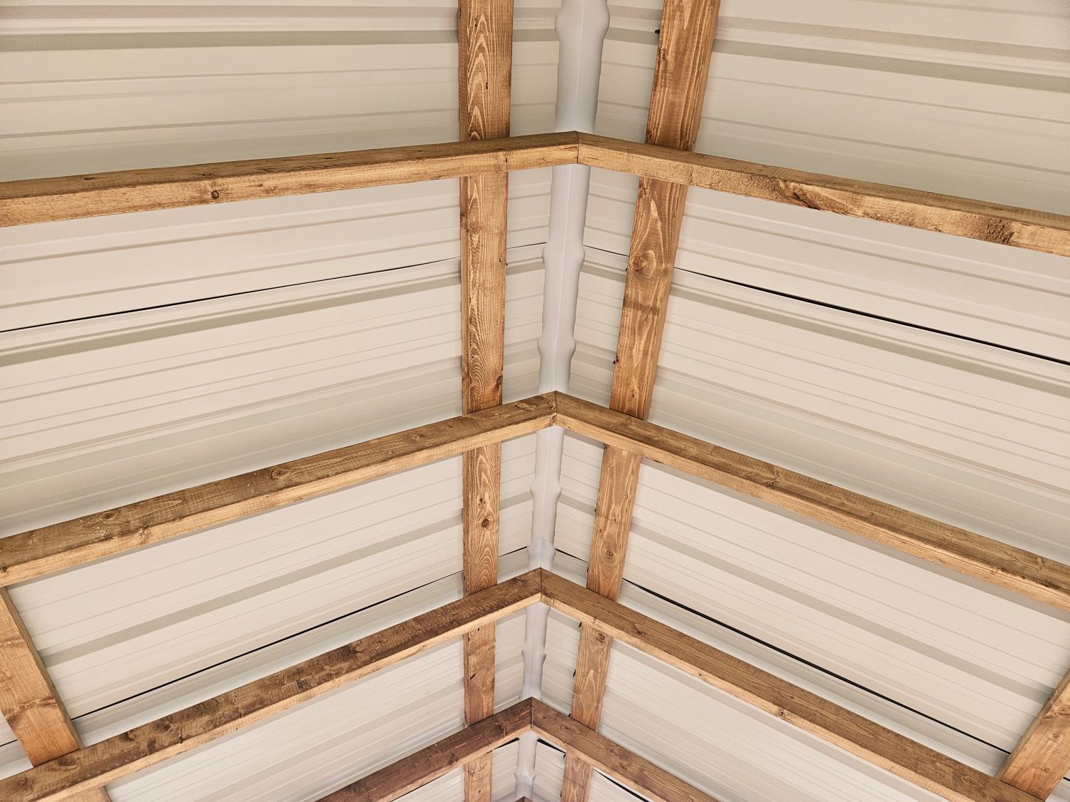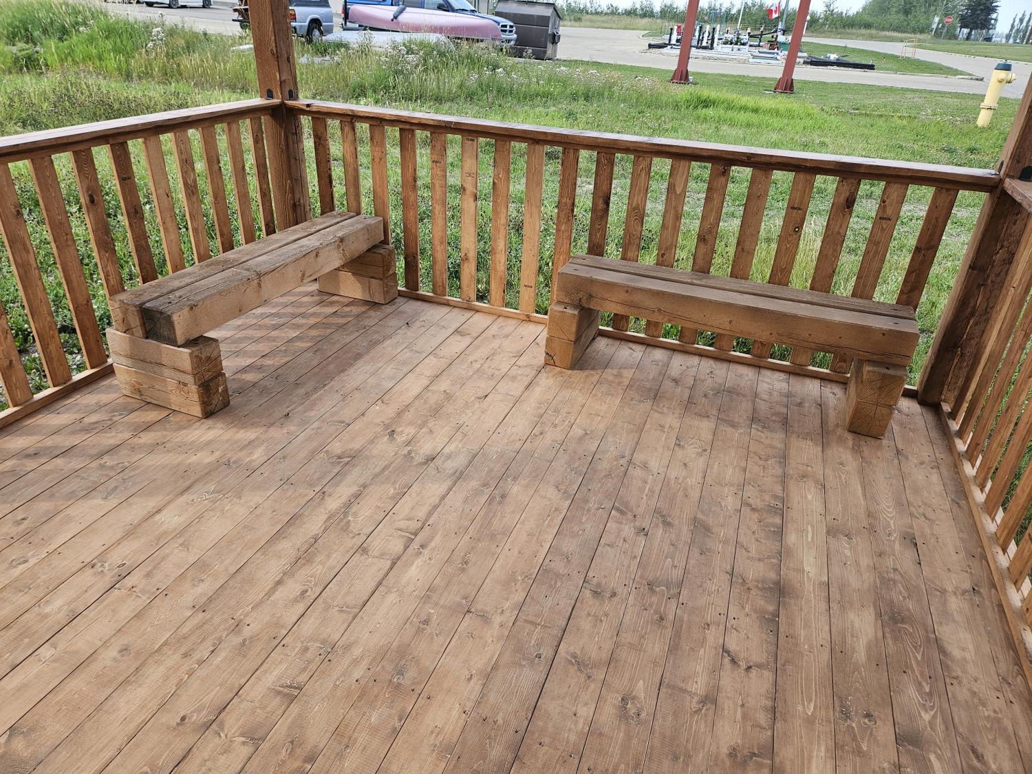 147 inch x 195 inch, 40 inch hand rail, interior lights, (2) 5 ft benches, tin roof