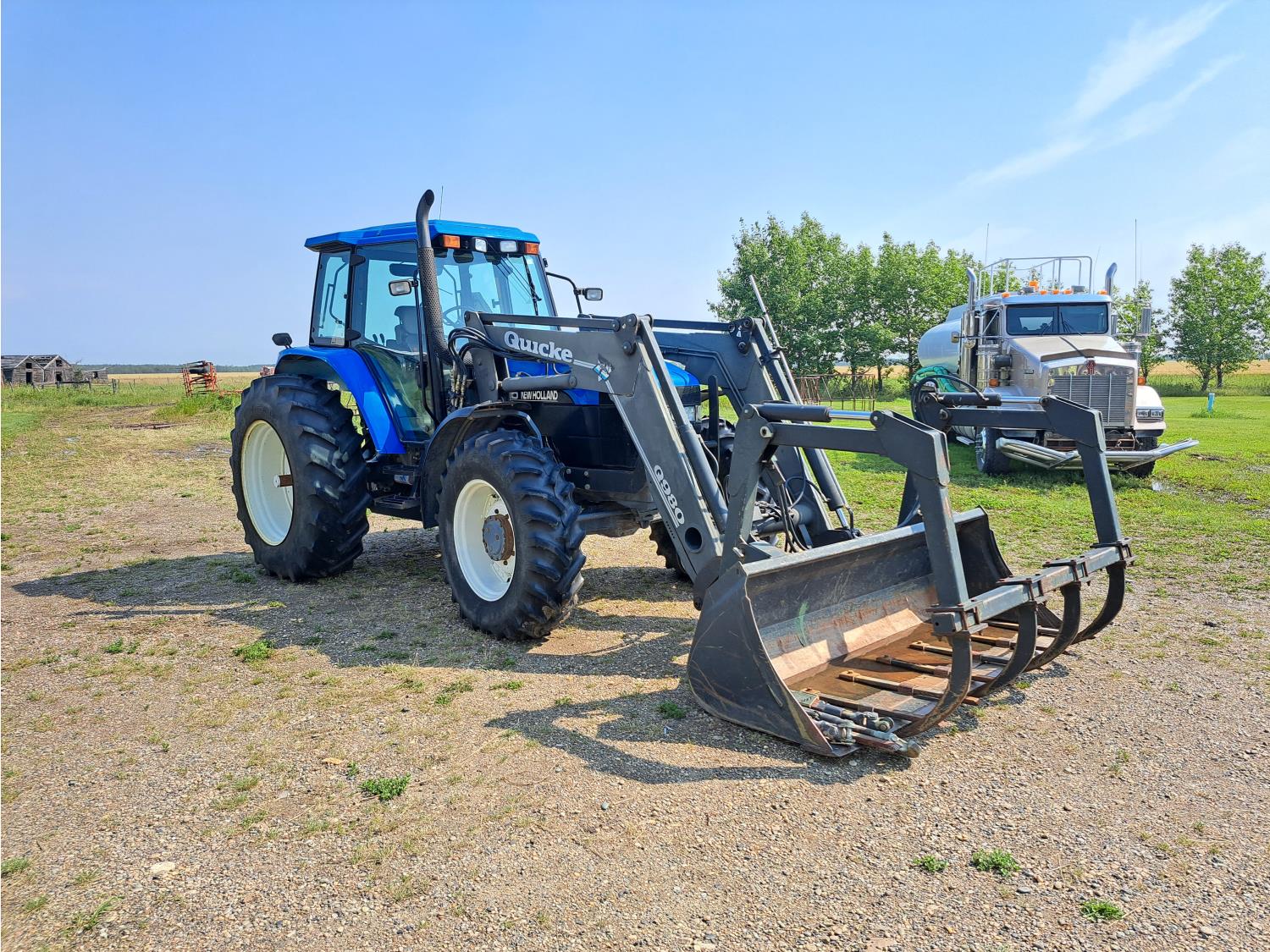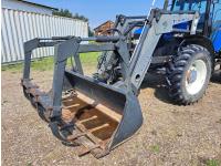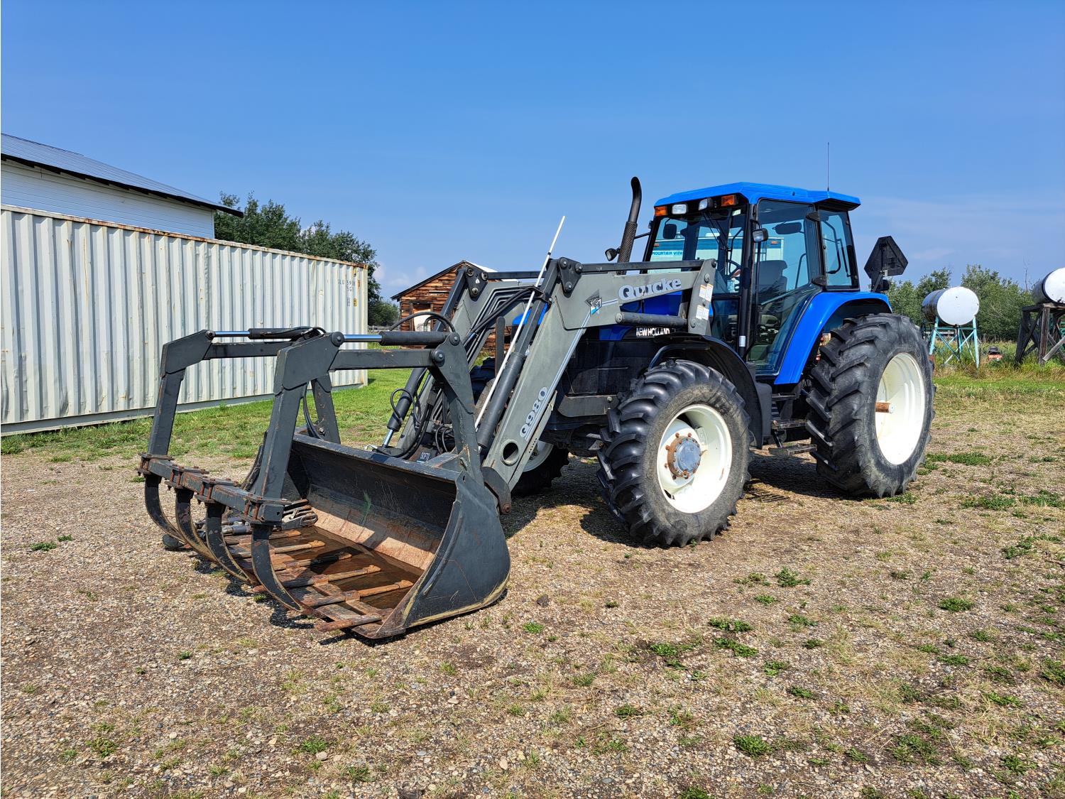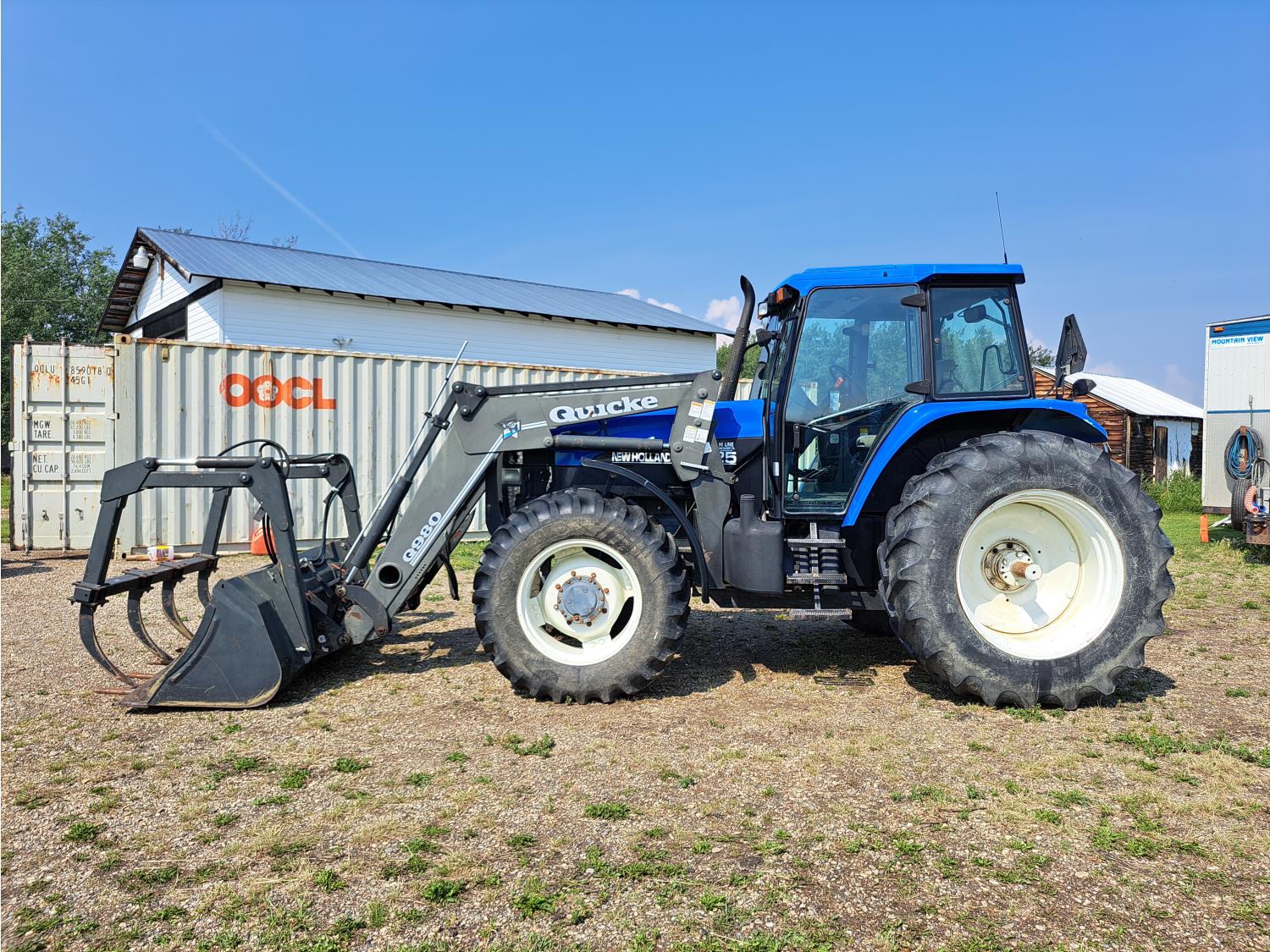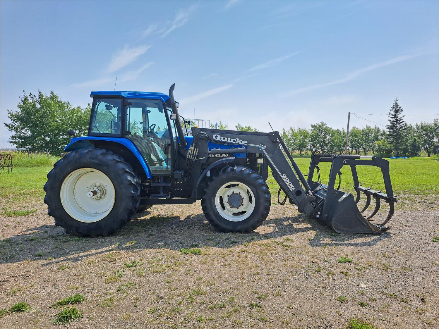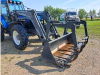 Quicke Q980 loader, 94 inch bucket, grapple, New Holland 7.5 L 6 cylinder 125 HP, diesel engine, 100 PTO HP, 18 speed power shift transmission, cab, A/C, radio, air ride seat, 540/1000 PTO, 2 rear hydraulic outlets, 14.9-28 front tires, 18.4R38 rear tires
