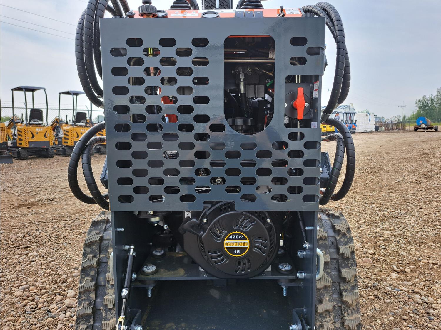 Open station, 420CC gas engine, 38 inch smooth bucket, manual coupler, 1 auxiliary hydraulics, 6 inch rubber tracks