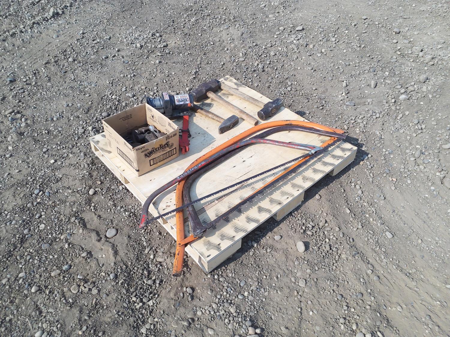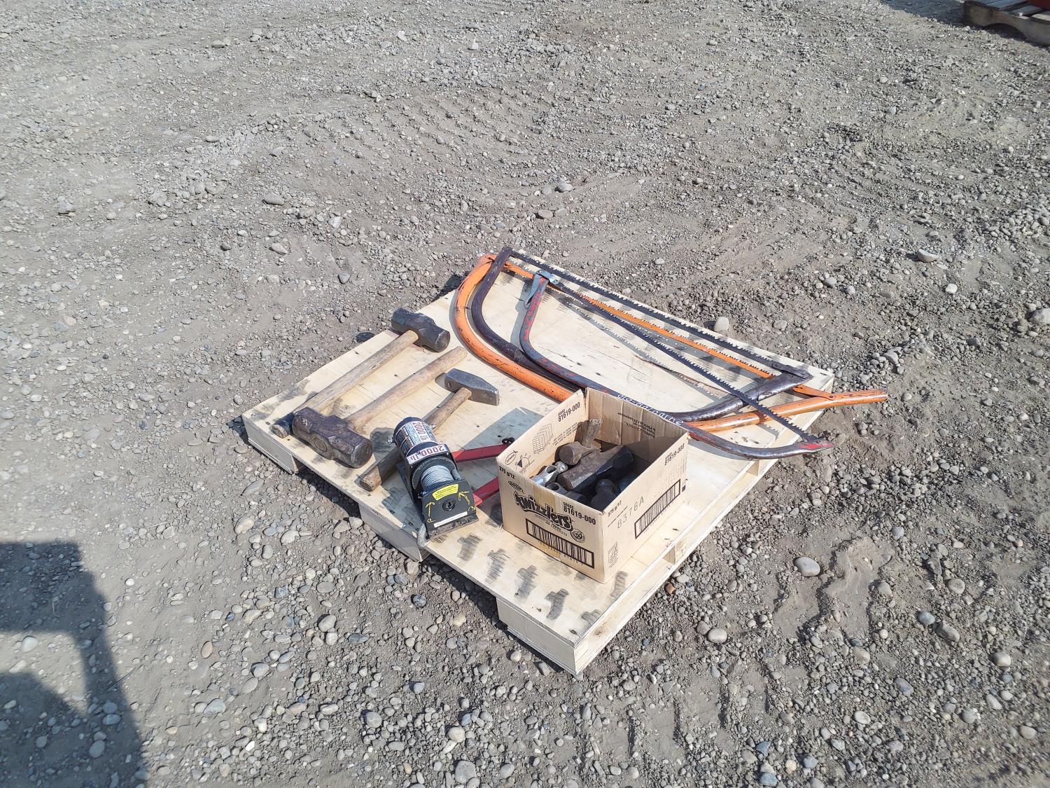 261 Misc Hammer Heads, Winch Cable, Winch, Hand Saws and Hammers