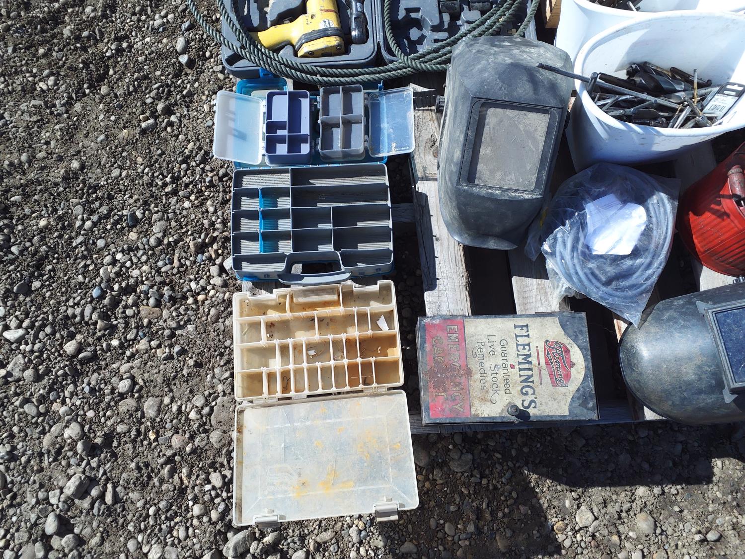 (2) welding helmets, hand tools, metal snippers, bucket of allen keys