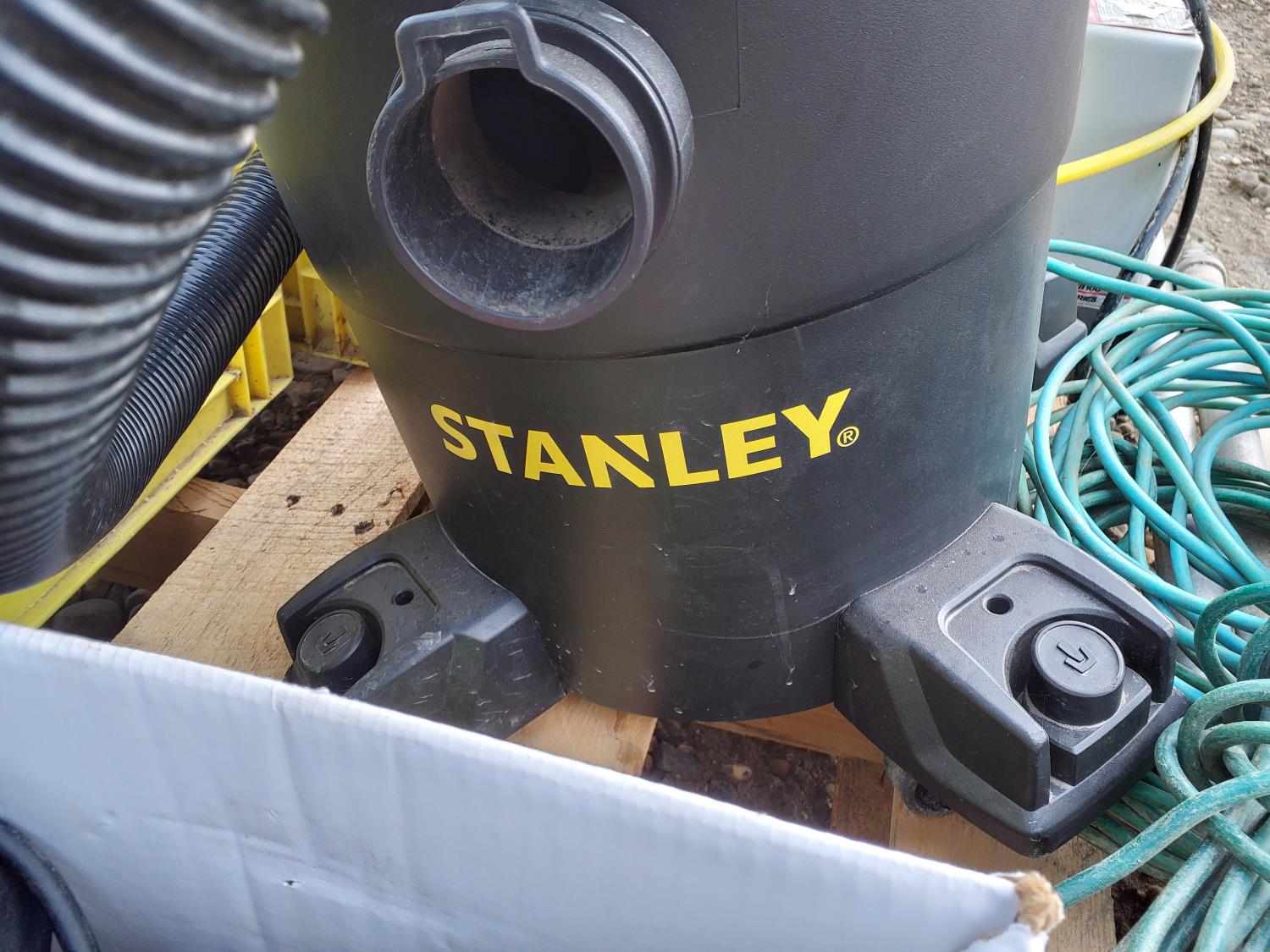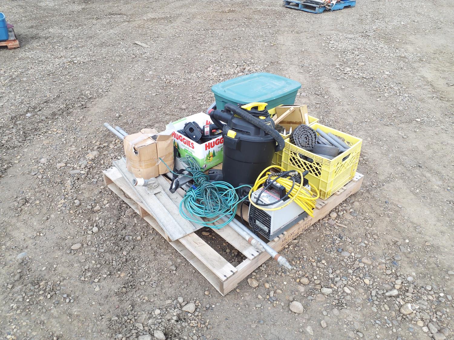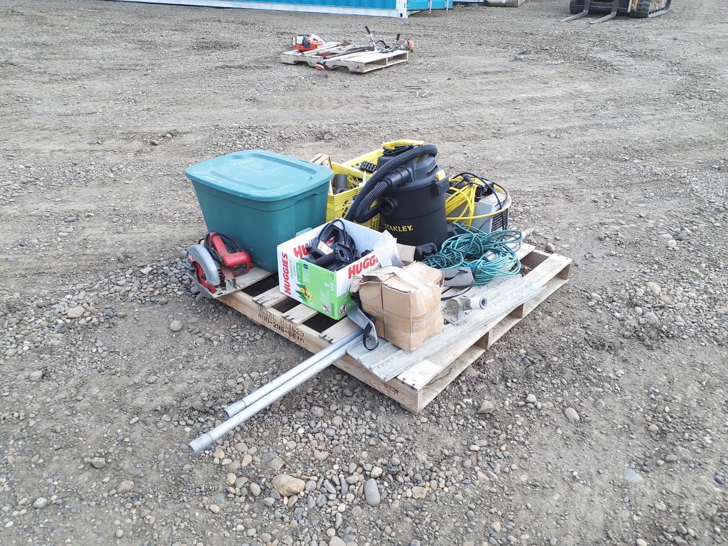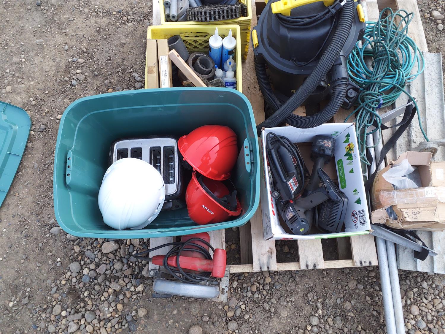 vacuum, air compressor, skill saw, work helmets, power tools, paint brushes