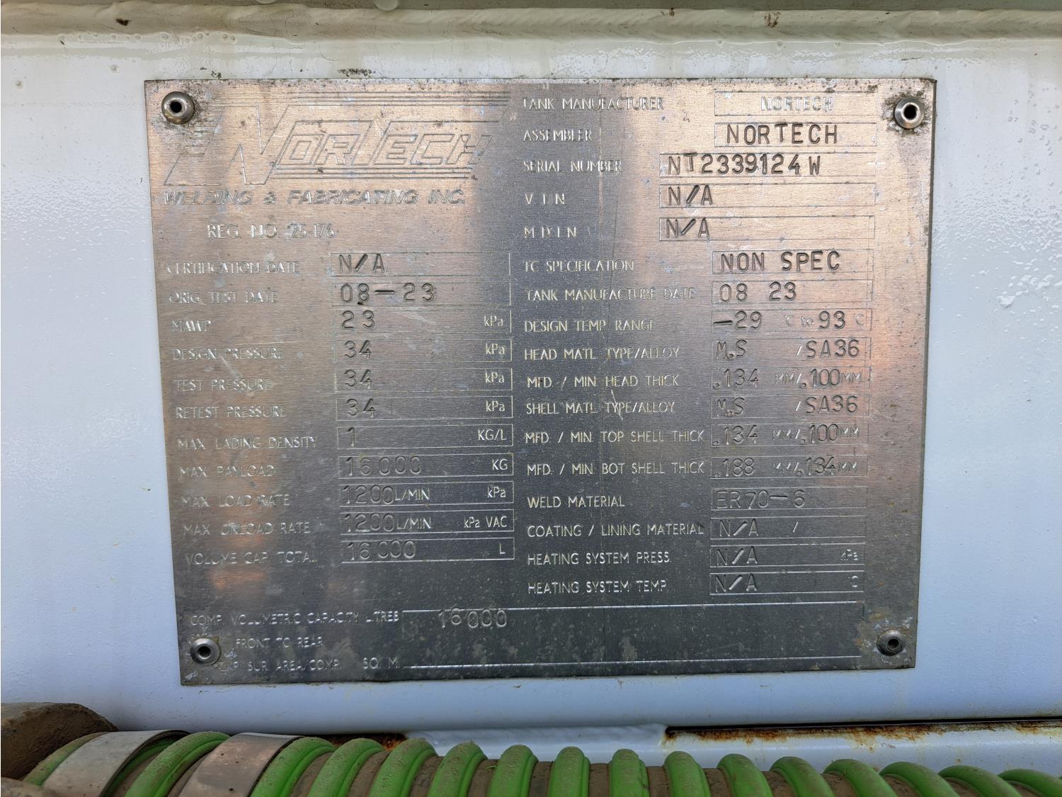Cummins ISX 15 L 6 cylinder 475 HP diesel engine, engine brake, Eaton FULLER 18 speed manual transmission, A/C, cruise control, leather interior, radio, 2-way radio, moose bumper, chain holders, Nortech 16000 liter tank, air ride suspension, full lockers, 385/65R22.5 front tires, 11R24.5 rear tires