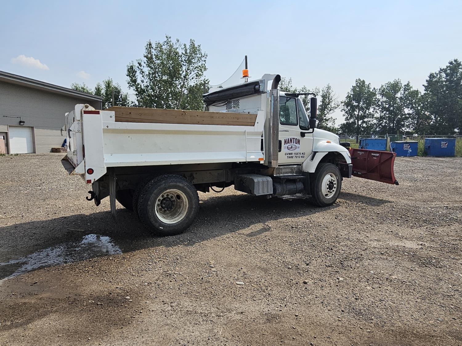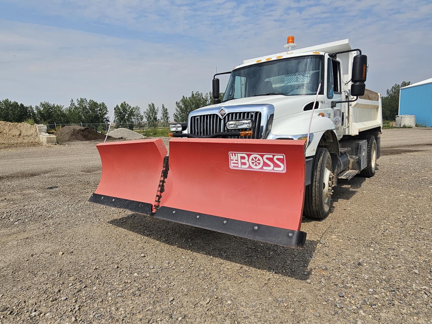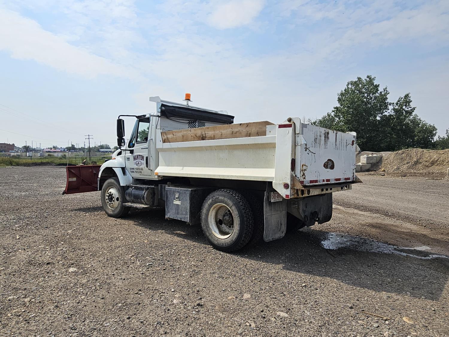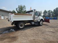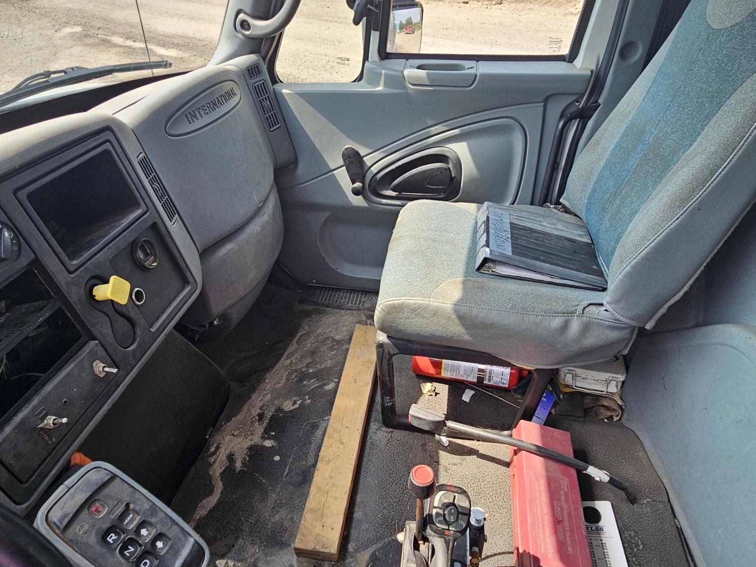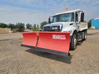 International DT466 7.6 L 6 cylinder diesel engine, automatic transmission, Boss 10ft power V plow, 30x24 steel tool boxes, 10 ft box, hoist, beacons, roll tarp, spring suspension, 12,000 lb front axle, 23,000 lb rear axles, 152 inch WB, 11R22.5 front tires, 11R22.5 rear tires