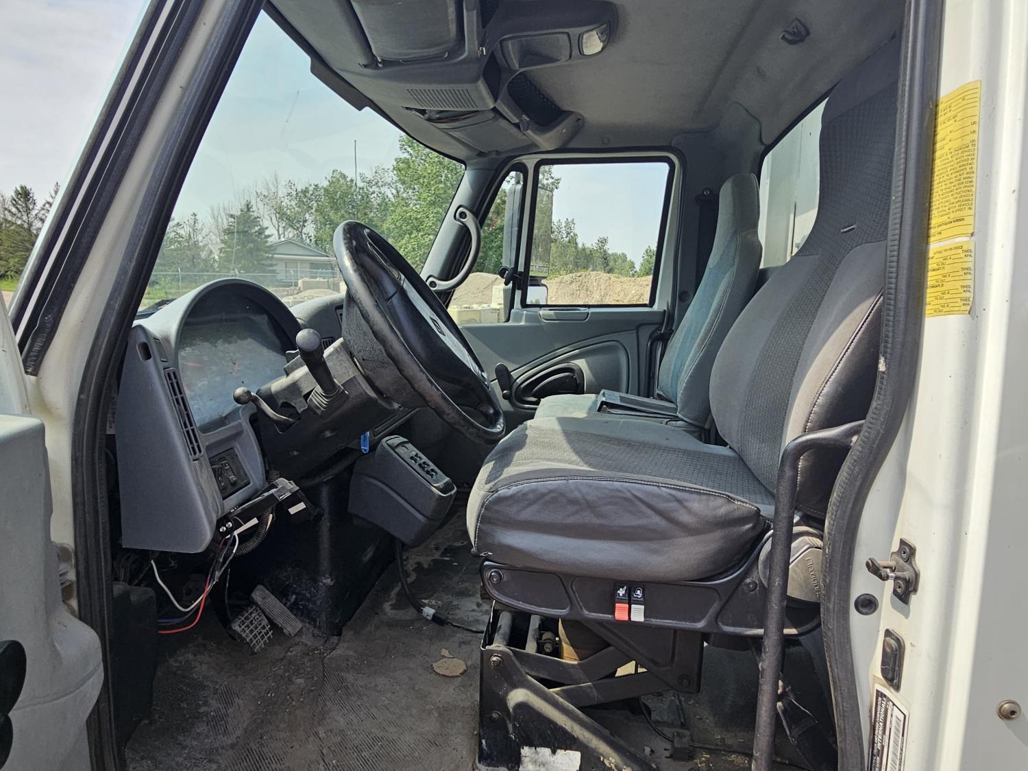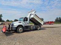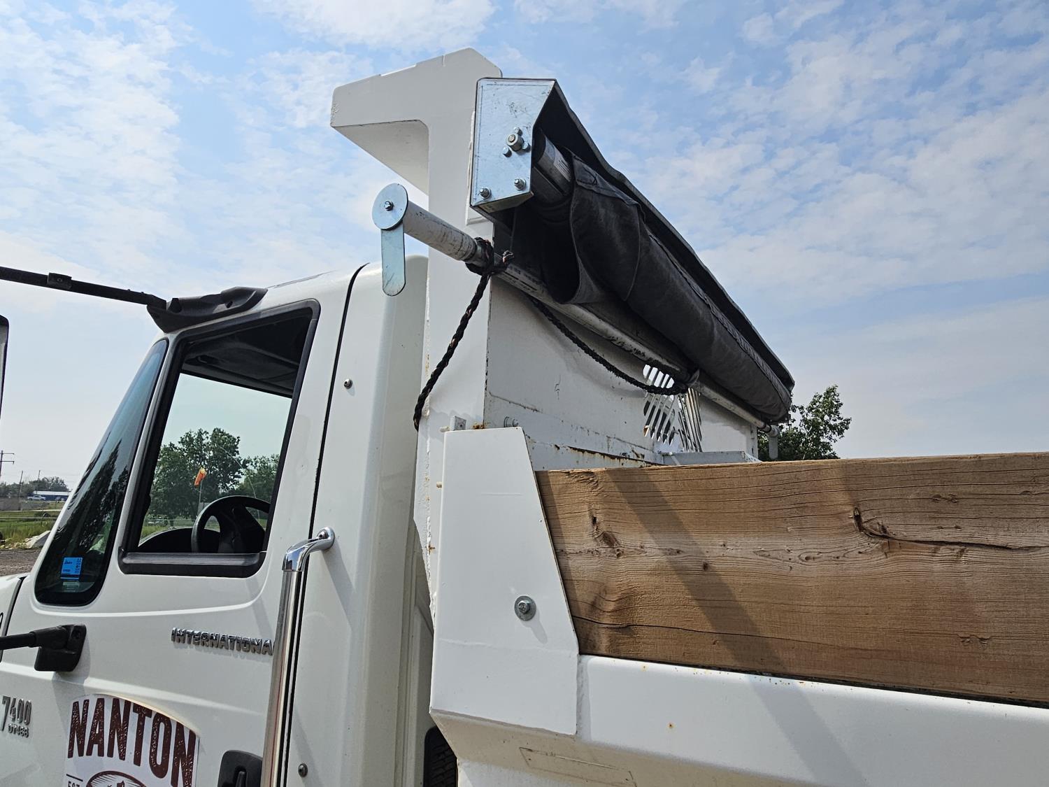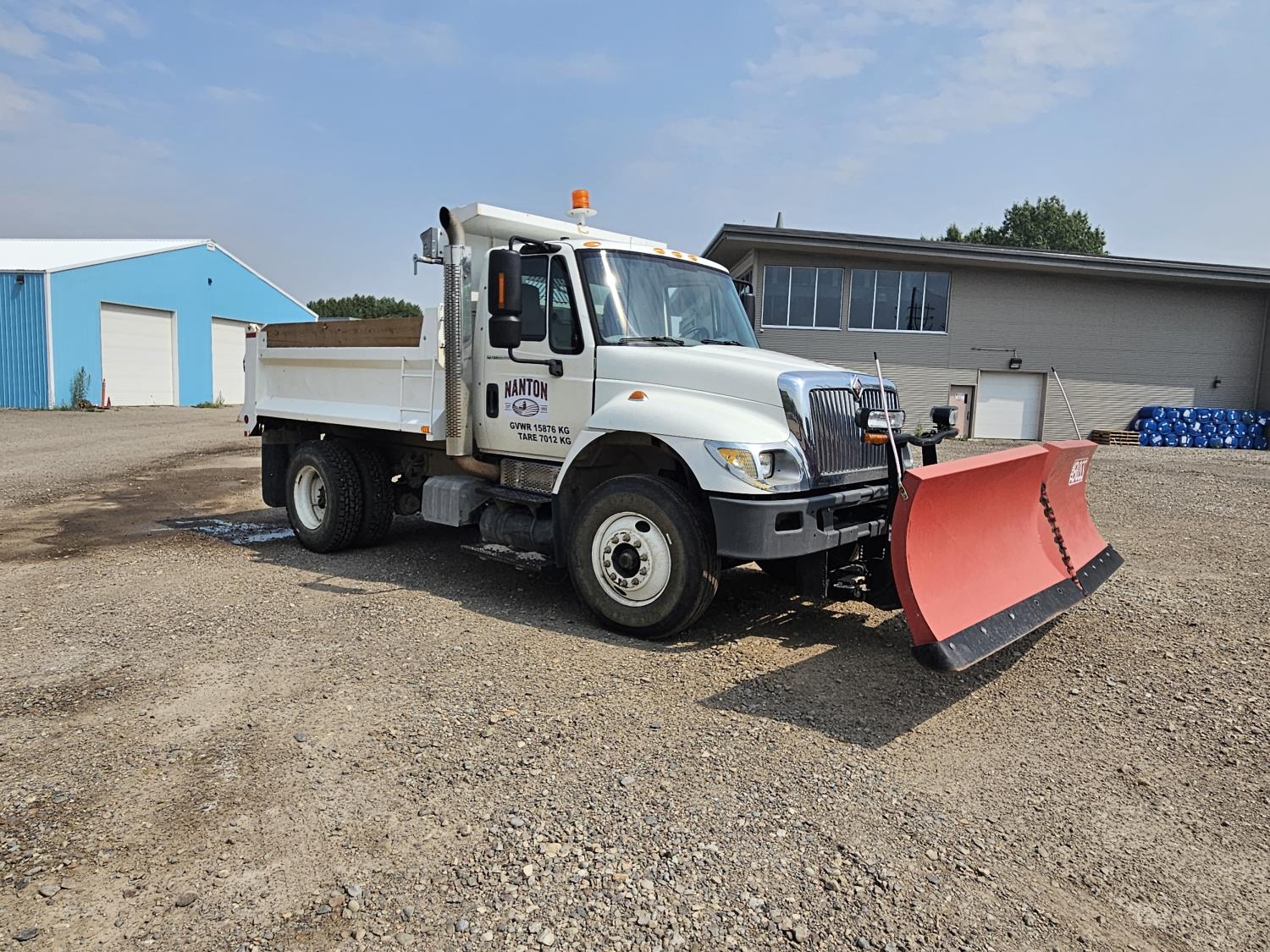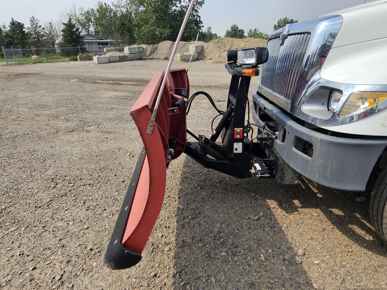 International DT466 7.6 L 6 cylinder diesel engine, automatic transmission, Boss 10ft power V plow, 30x24 steel tool boxes, 10 ft box, hoist, beacons, roll tarp, spring suspension, 12,000 lb front axle, 23,000 lb rear axles, 152 inch WB, 11R22.5 front tires, 11R22.5 rear tires