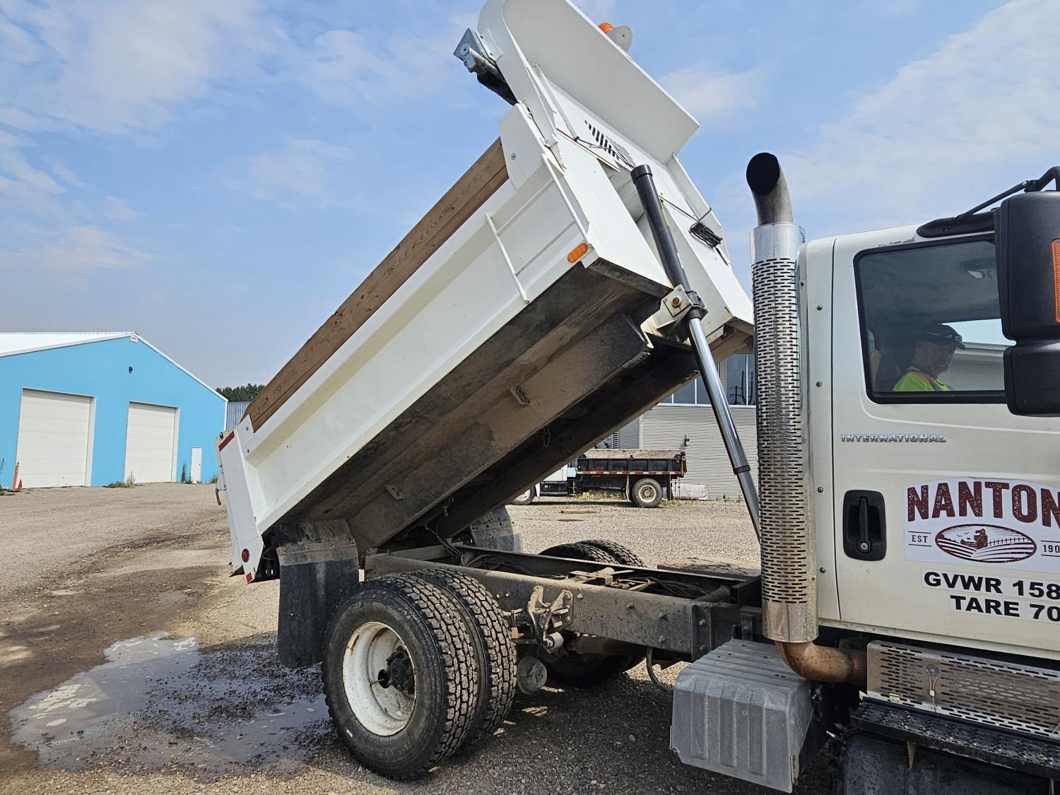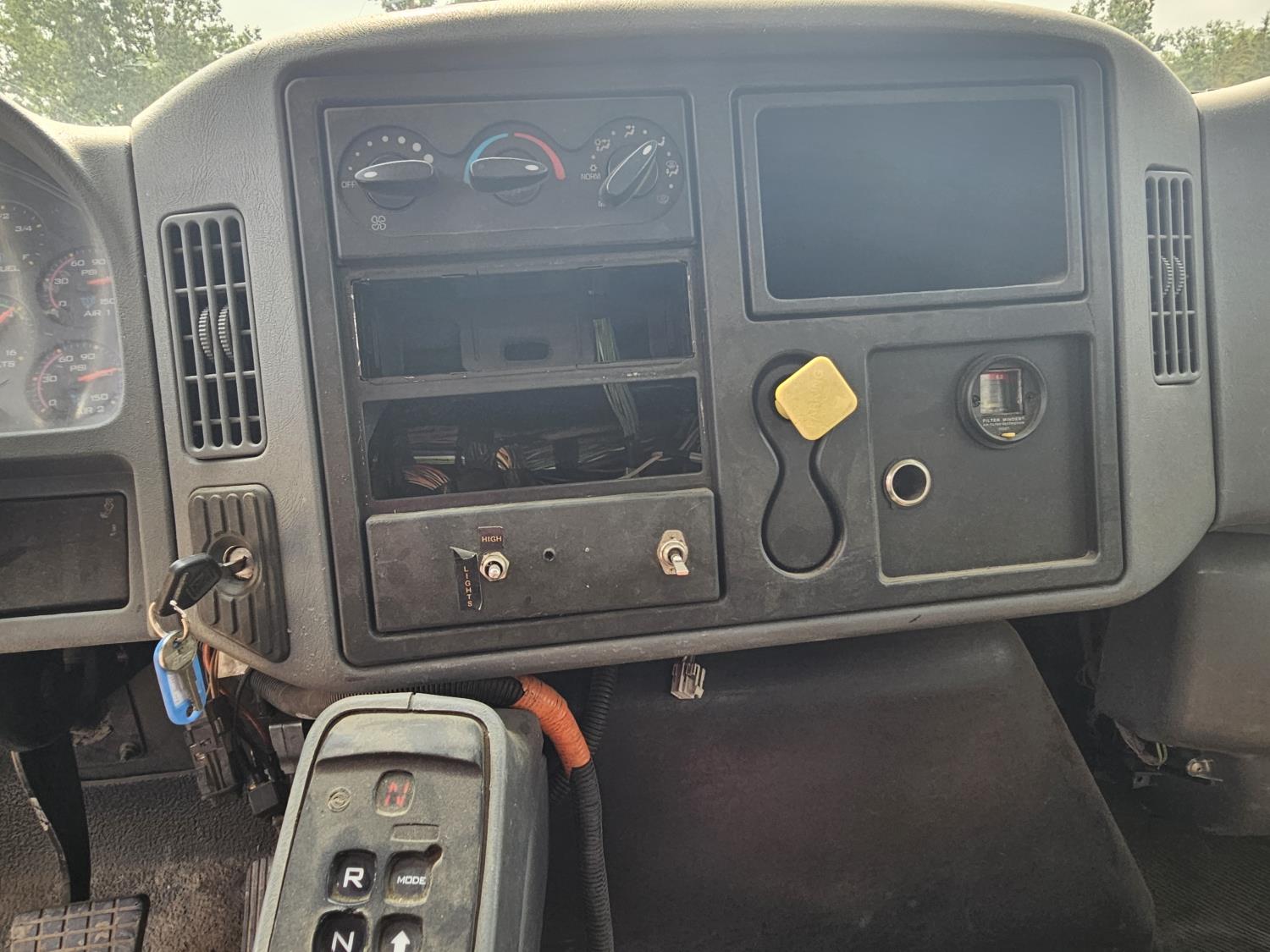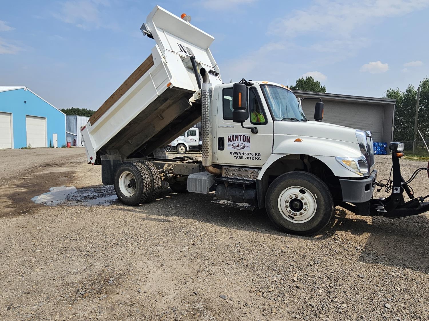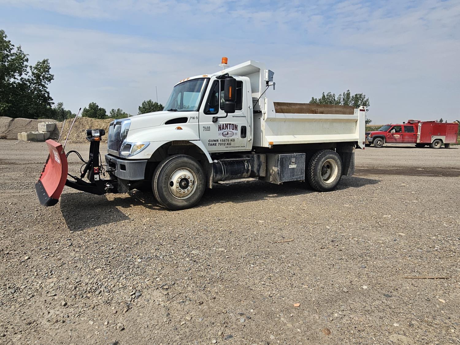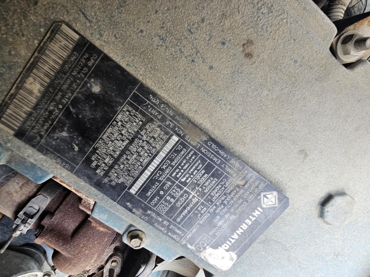 International DT466 7.6 L 6 cylinder diesel engine, automatic transmission, Boss 10ft power V plow, 30x24 steel tool boxes, 10 ft box, hoist, beacons, roll tarp, spring suspension, 12,000 lb front axle, 23,000 lb rear axles, 152 inch WB, 11R22.5 front tires, 11R22.5 rear tires