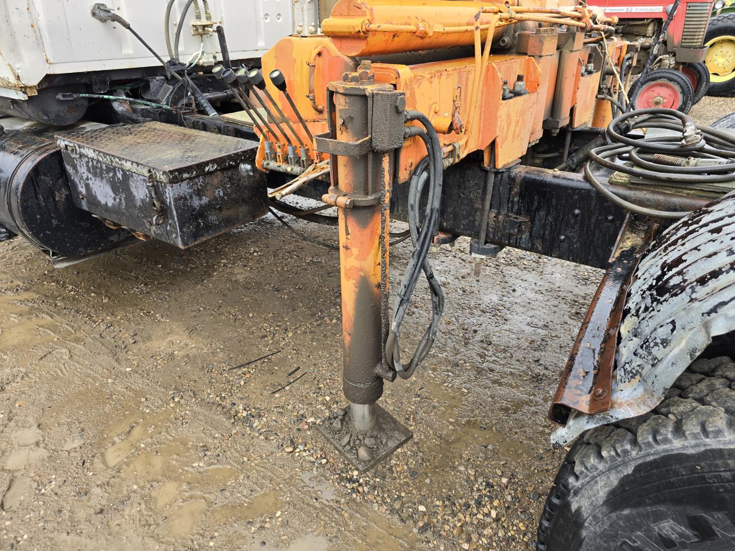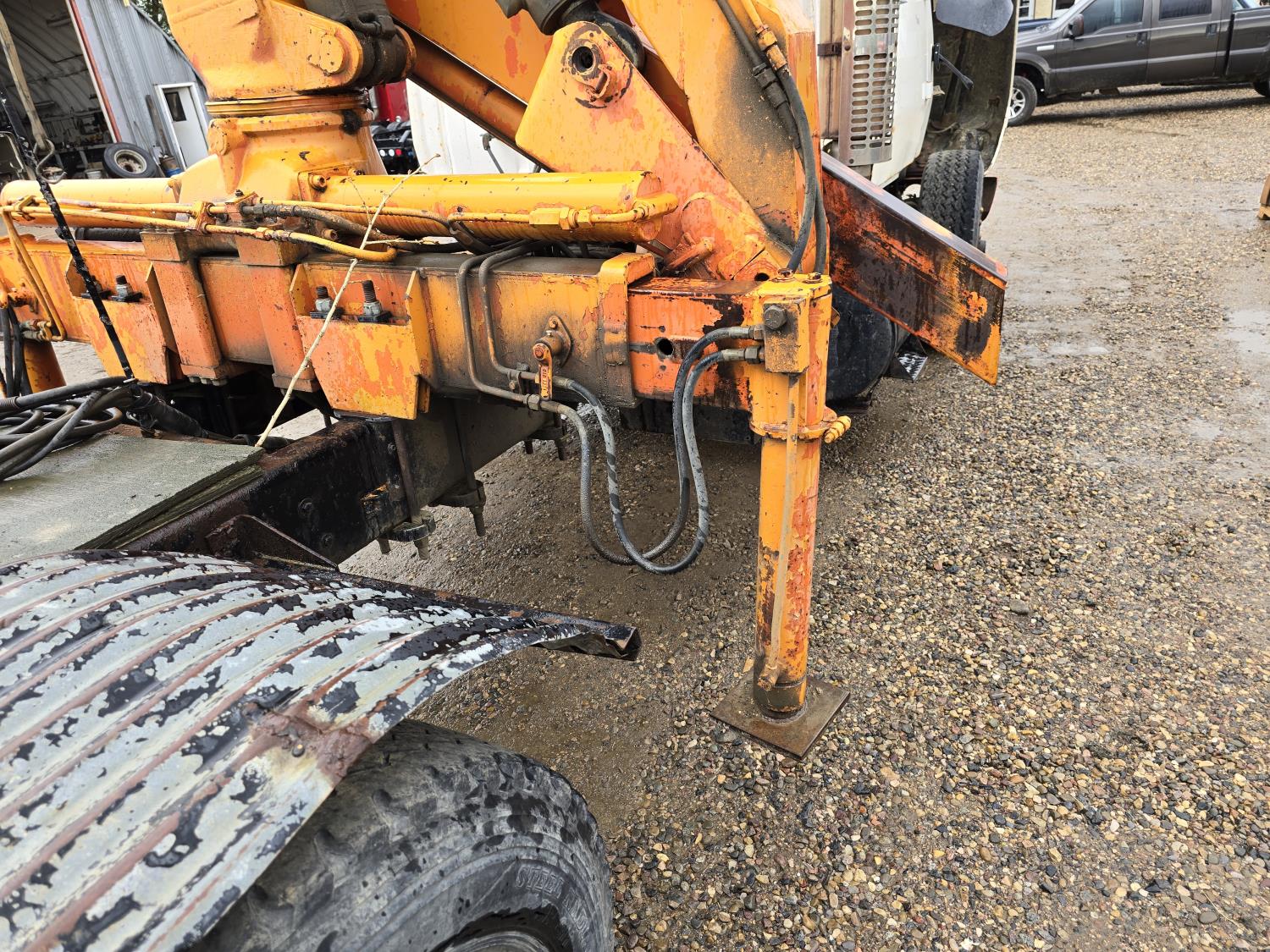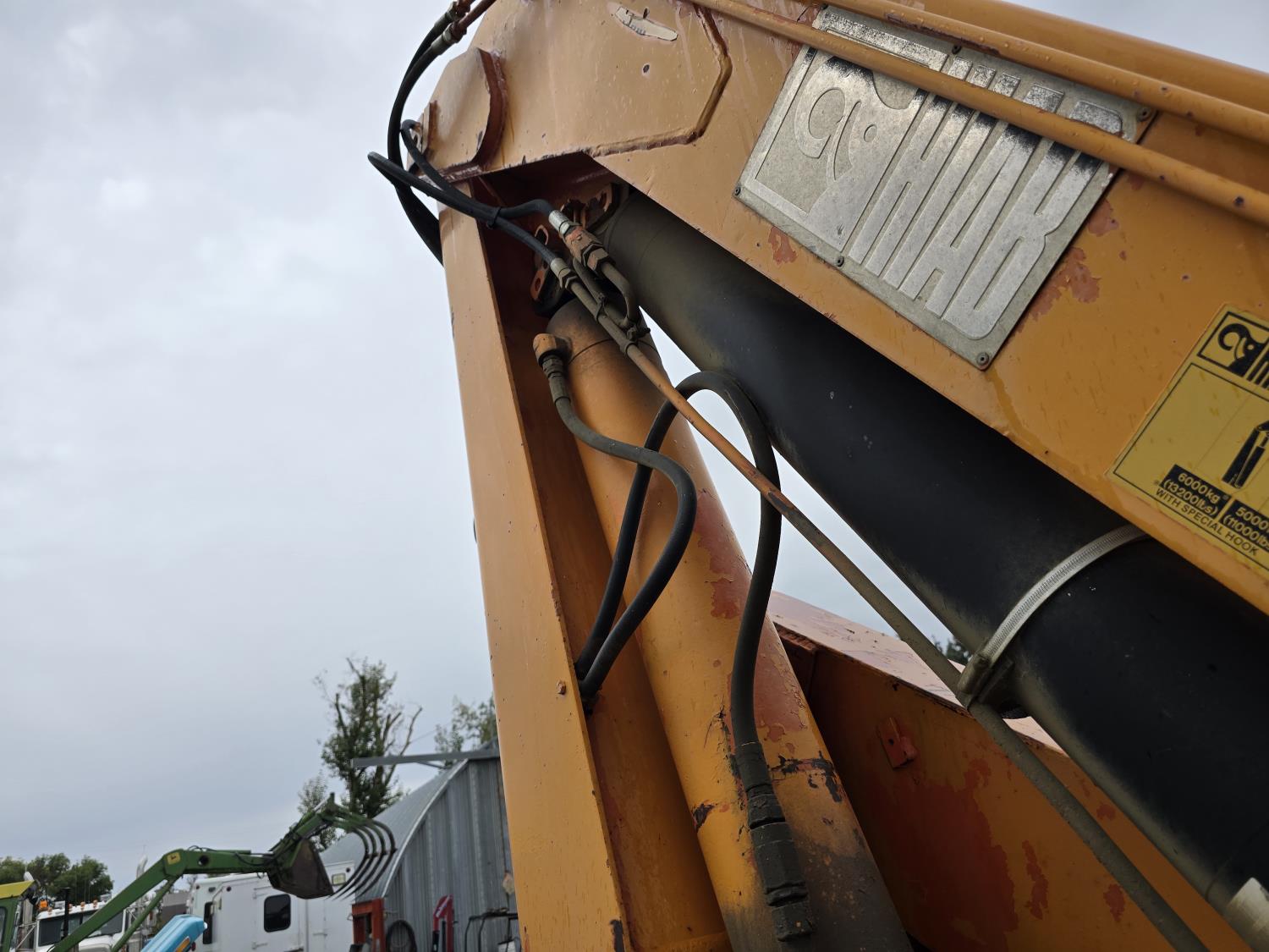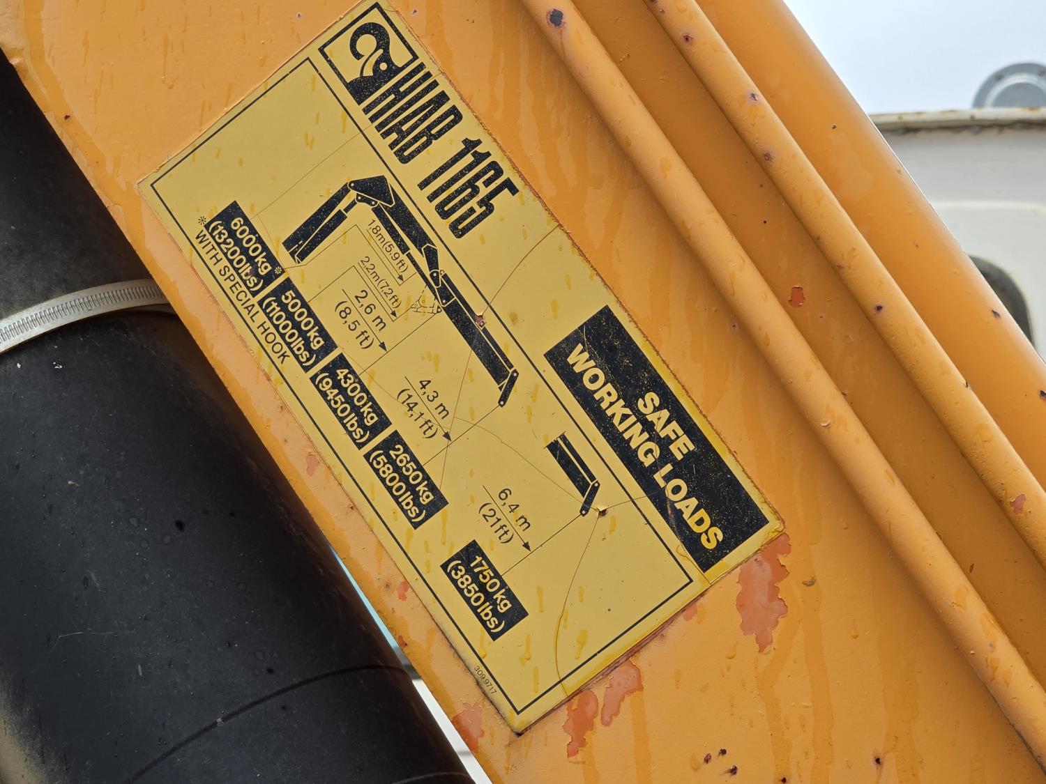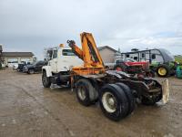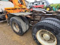 Caterpillar 3406B 14.6 L diesel engine, Eaton Fuller 13 speed manual transmission, Hiab 1165 3 section 21 ft knuckle crane, outriggers, spring suspension, 12,000 lb front axle, 30,000 lb rear axles, 224 inch WB, 11R22.5 tires