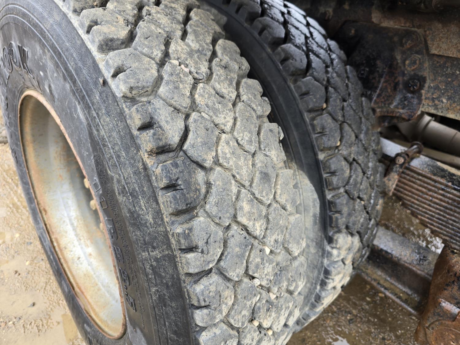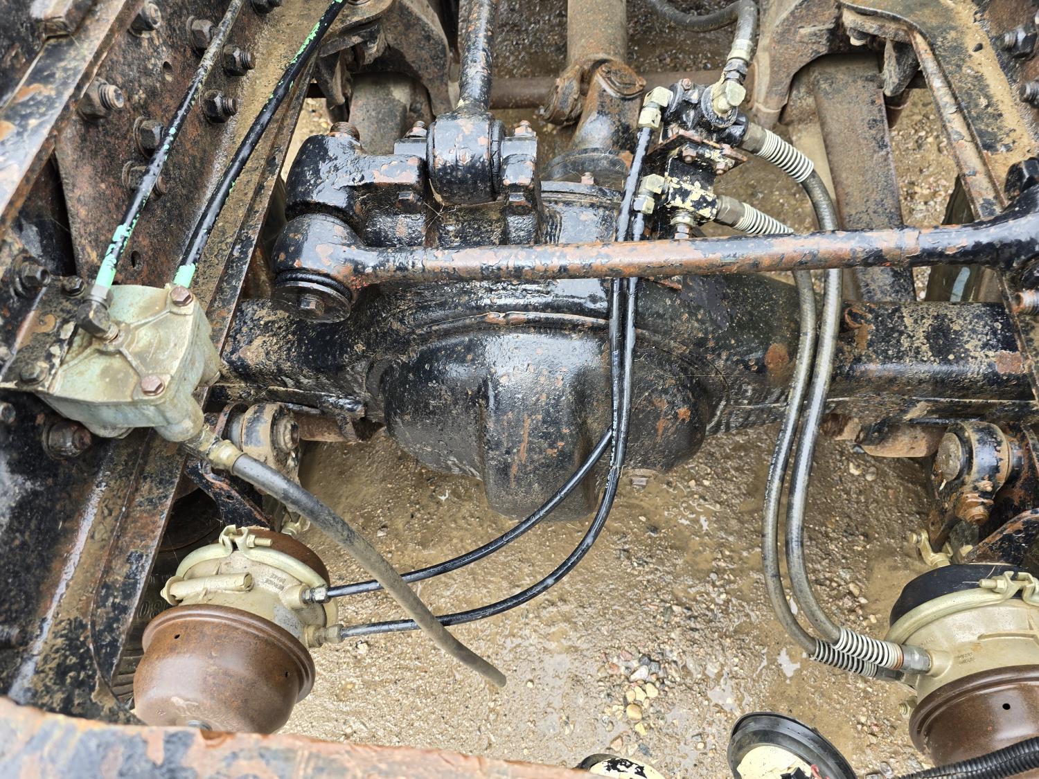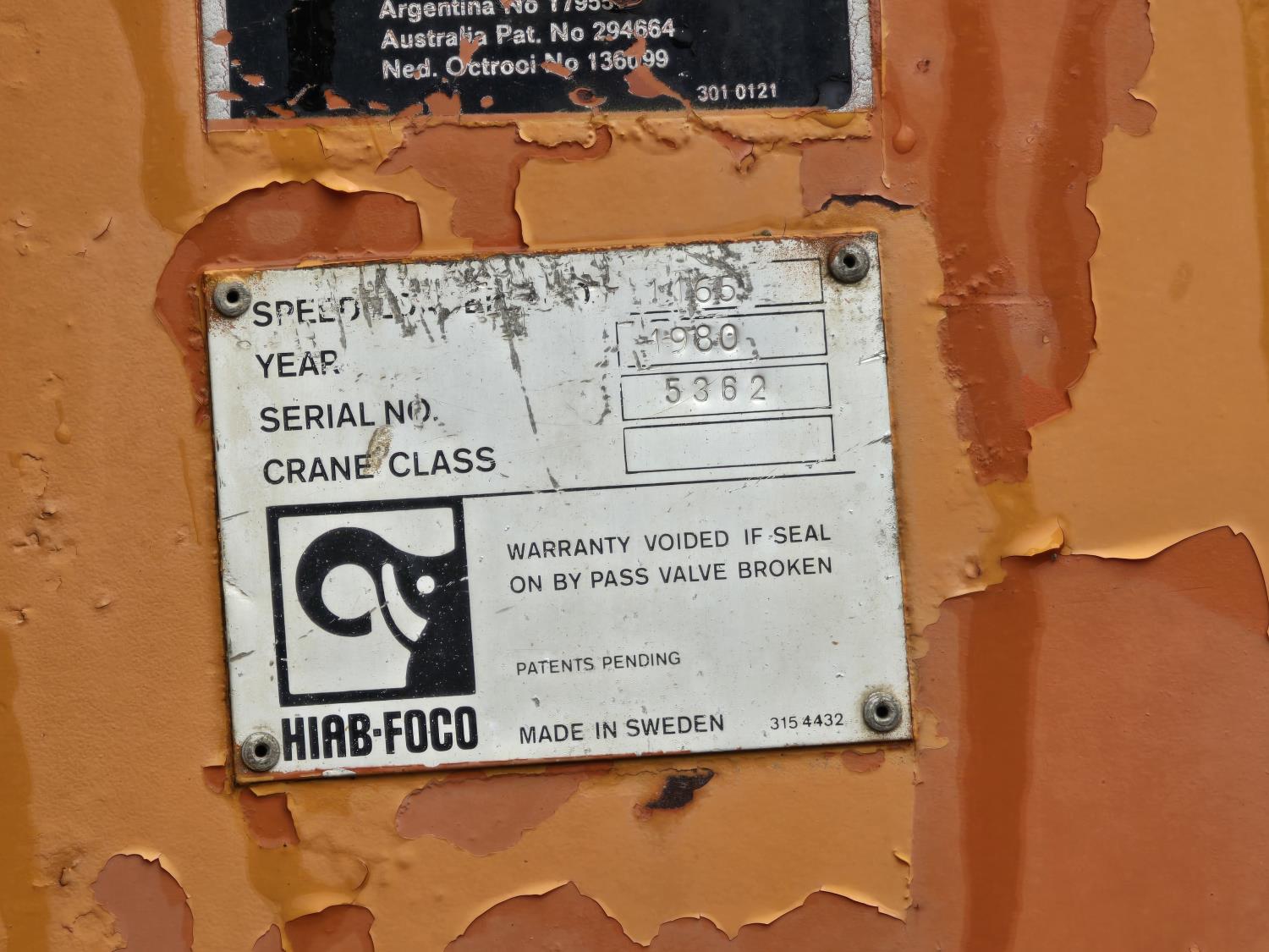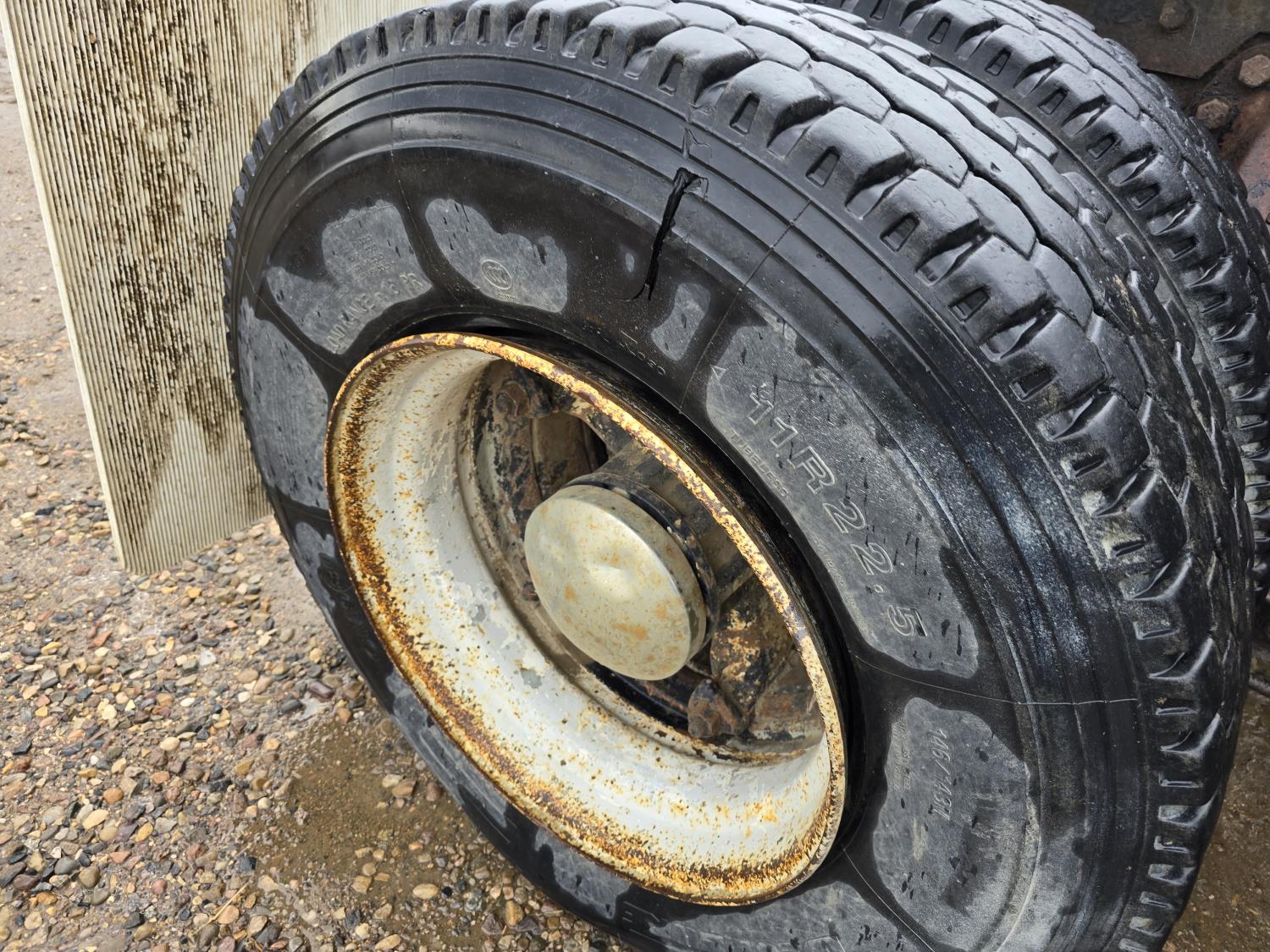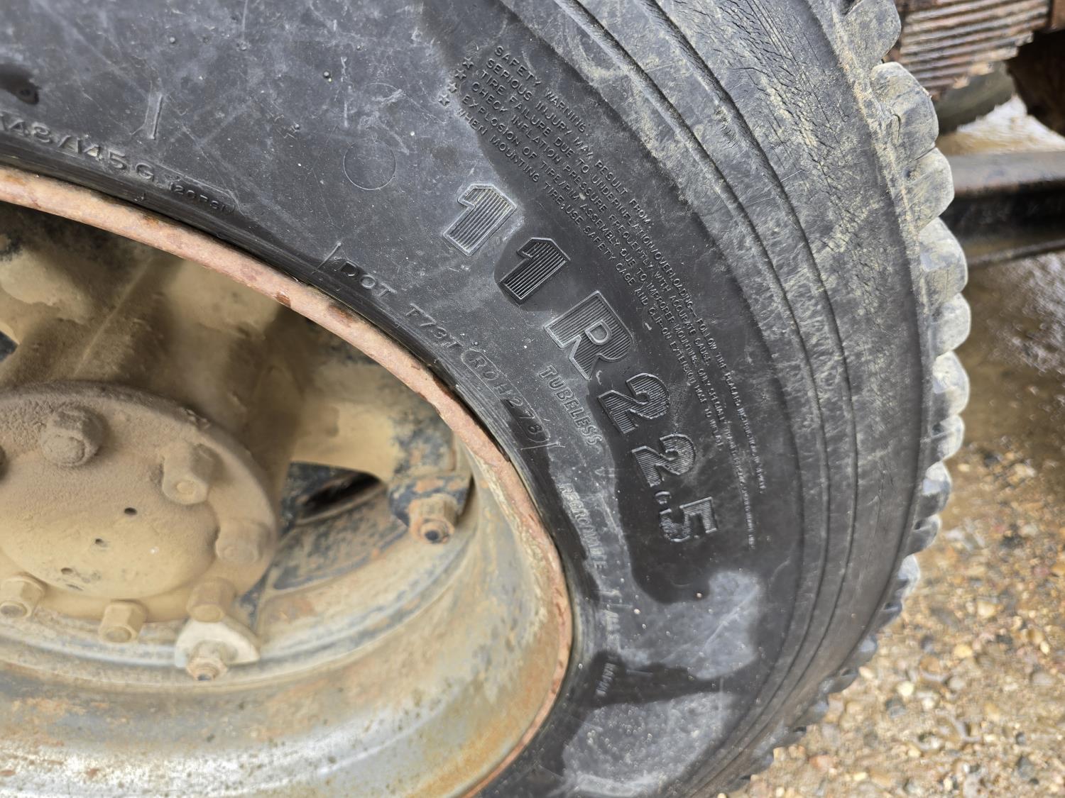 Caterpillar 3406B 14.6 L diesel engine, Eaton Fuller 13 speed manual transmission, Hiab 1165 3 section 21 ft knuckle crane, outriggers, spring suspension, 12,000 lb front axle, 30,000 lb rear axles, 224 inch WB, 11R22.5 tires