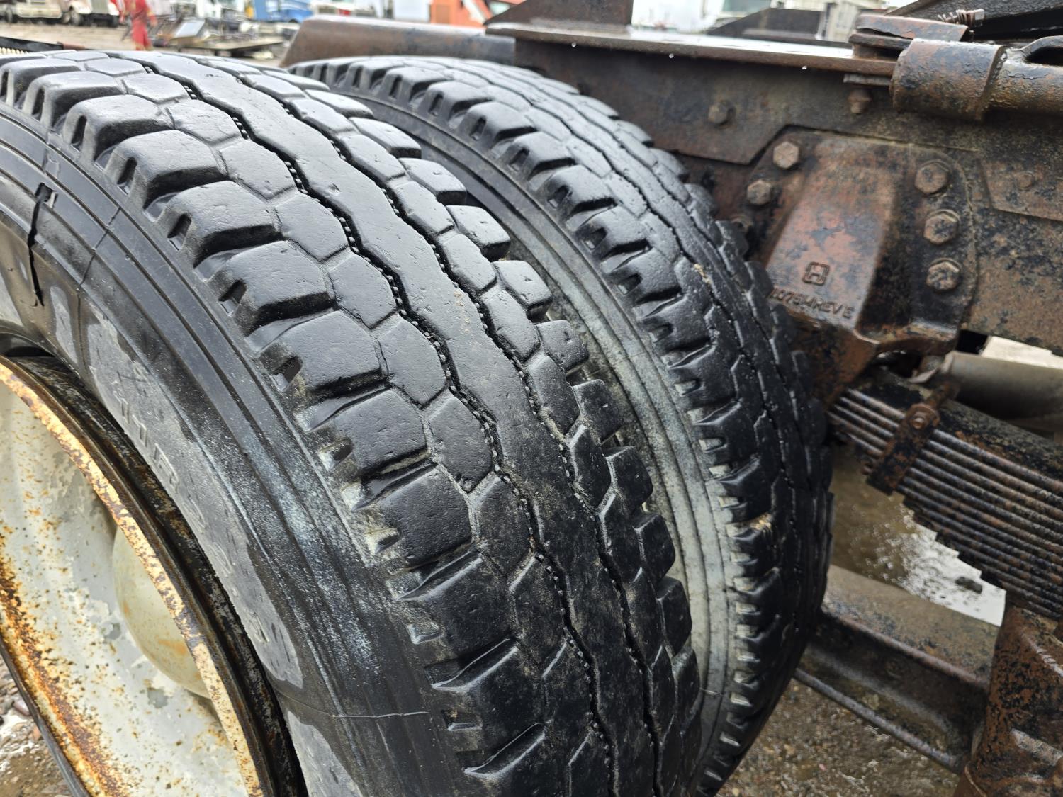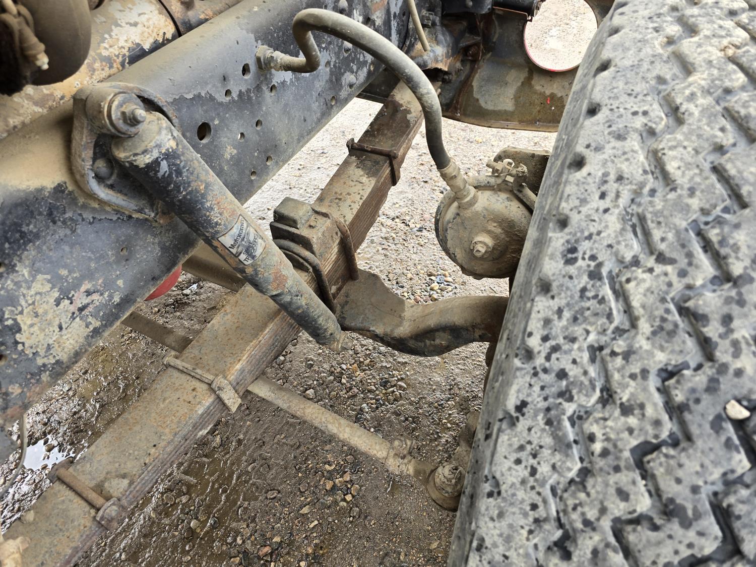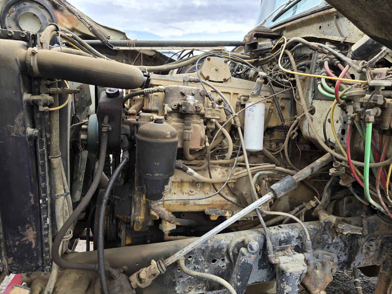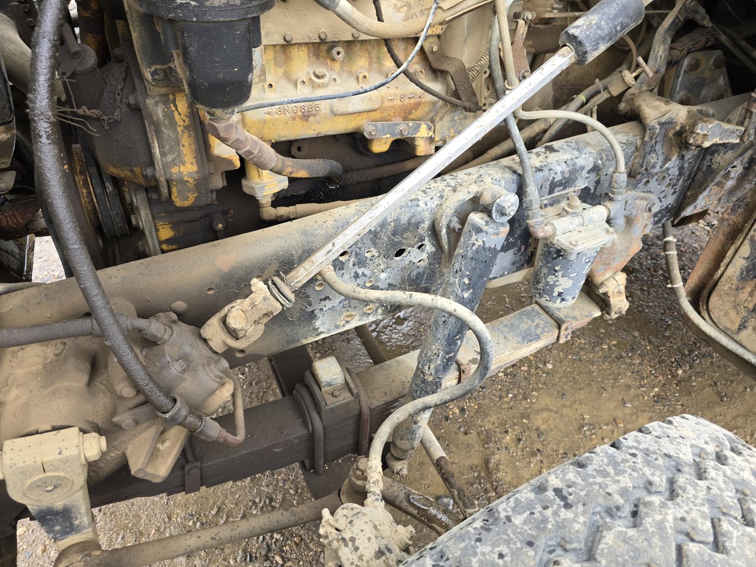 Caterpillar 3406B 14.6 L diesel engine, Eaton Fuller 13 speed manual transmission, Hiab 1165 3 section 21 ft knuckle crane, outriggers, spring suspension, 12,000 lb front axle, 30,000 lb rear axles, 224 inch WB, 11R22.5 tires