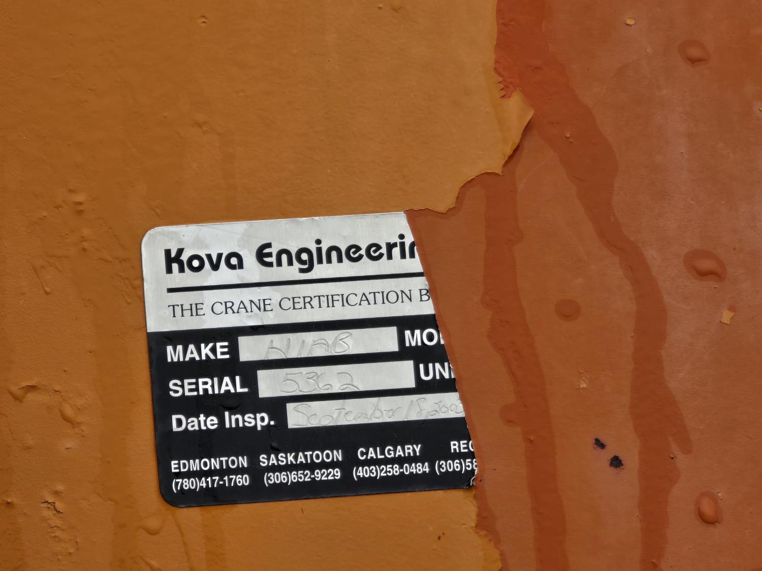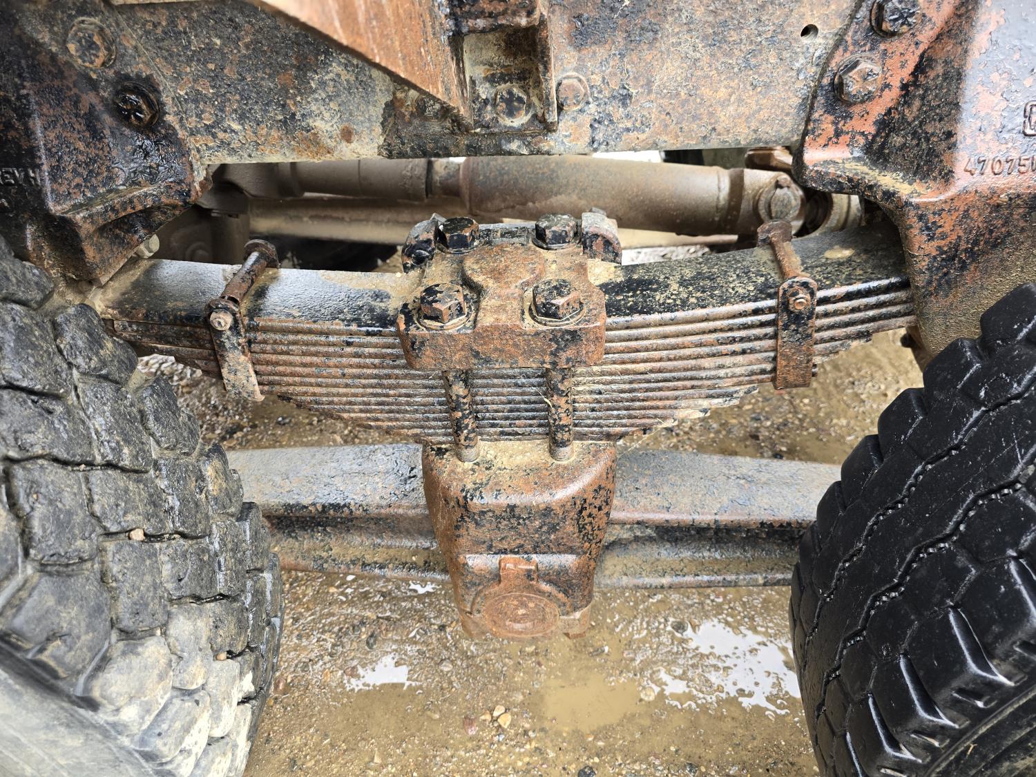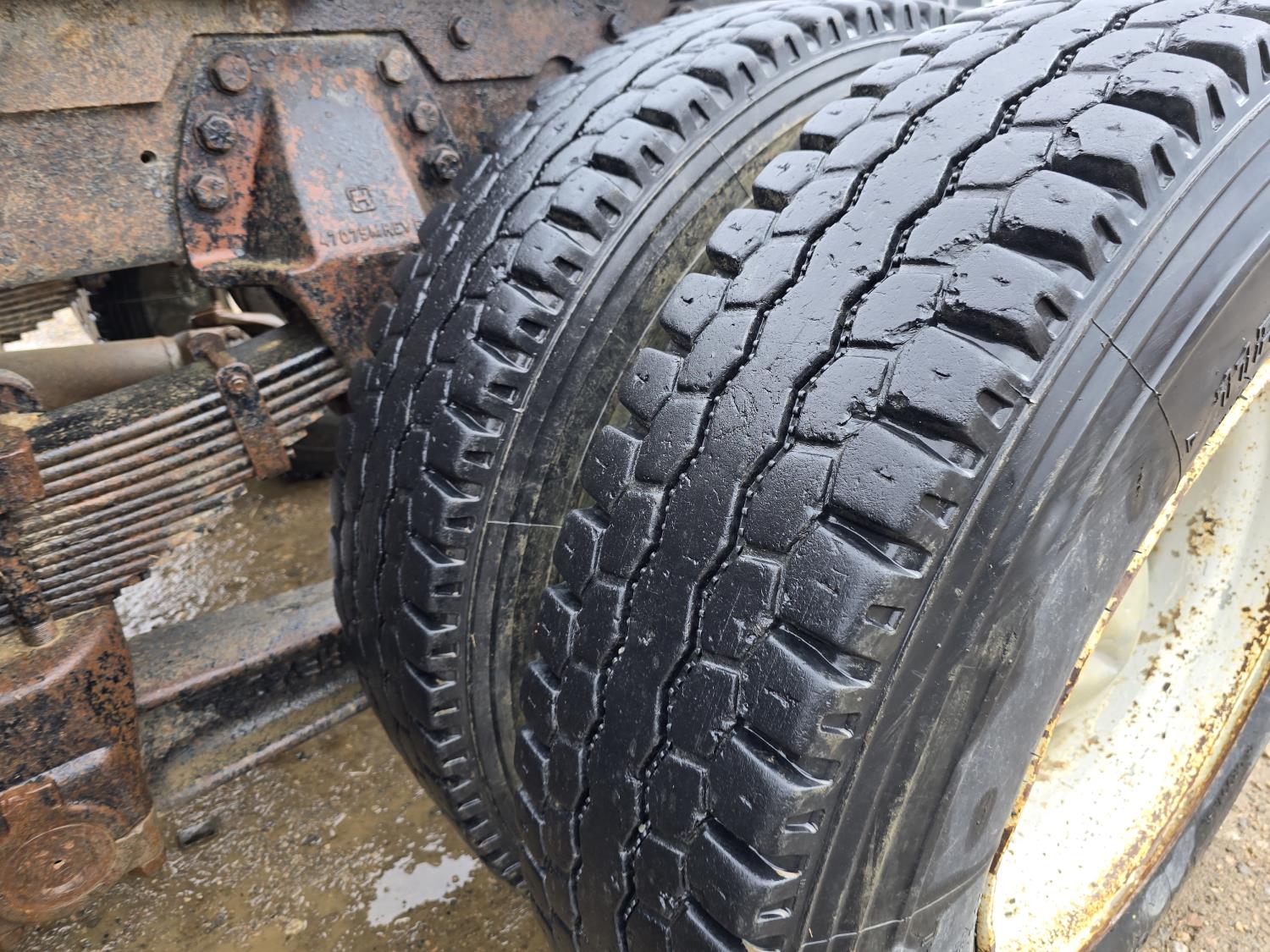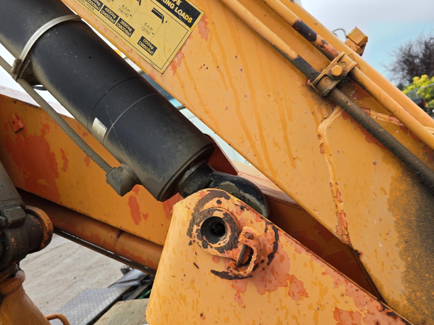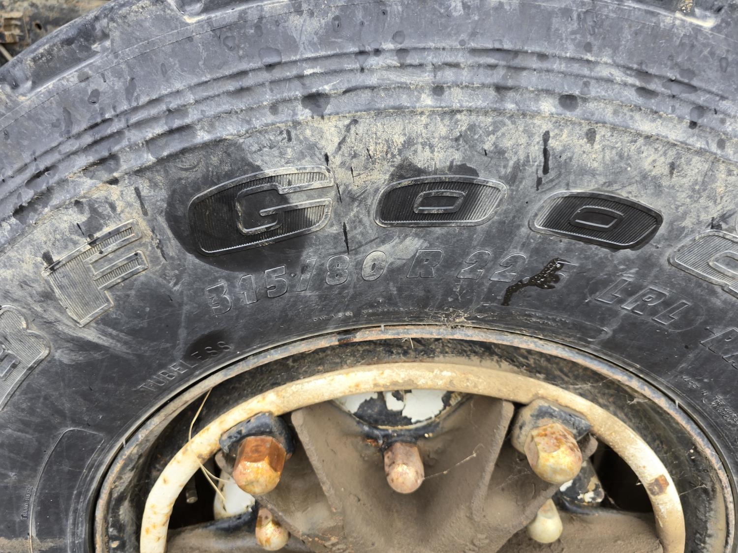 Caterpillar 3406B 14.6 L diesel engine, Eaton Fuller 13 speed manual transmission, Hiab 1165 3 section 21 ft knuckle crane, outriggers, spring suspension, 12,000 lb front axle, 30,000 lb rear axles, 224 inch WB, 11R22.5 tires