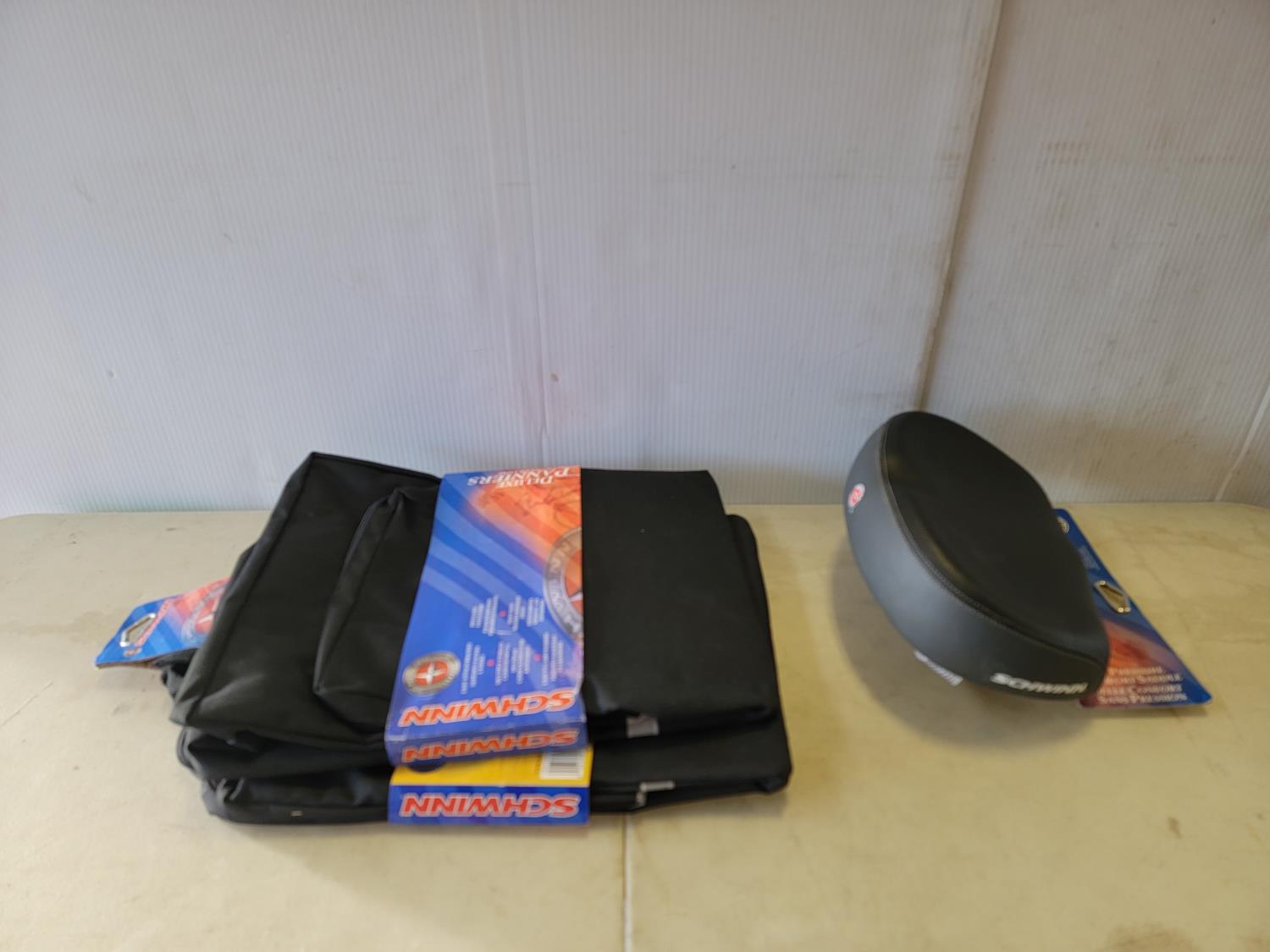 Bike panniers bag, bicycle comfort saddle, child's size tri-cycle