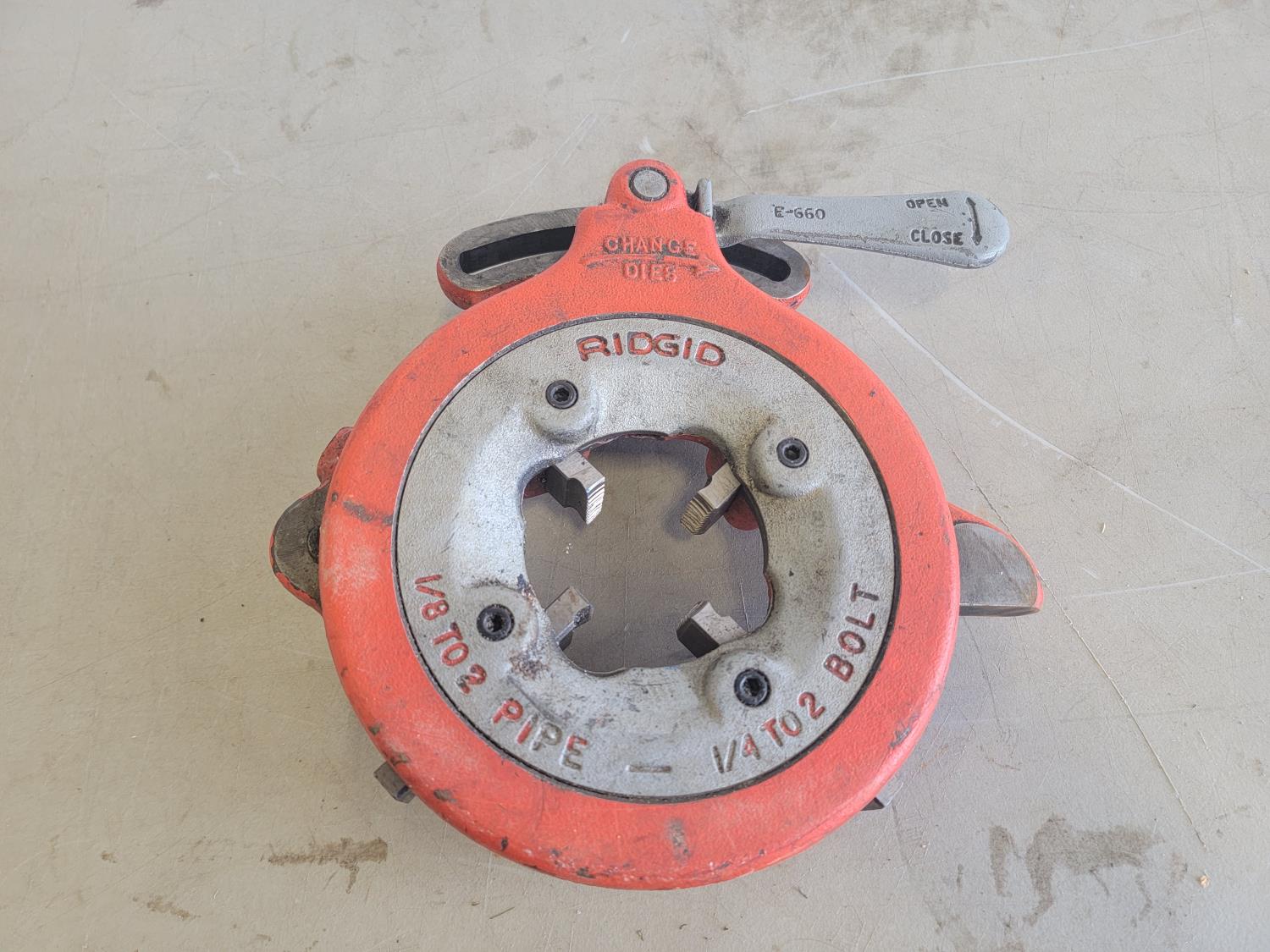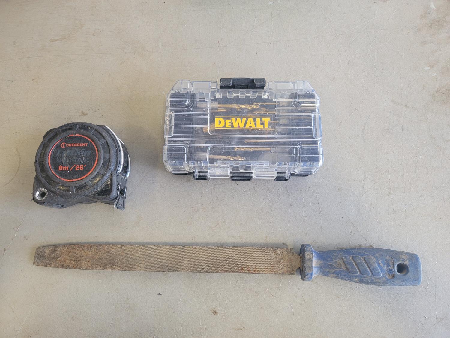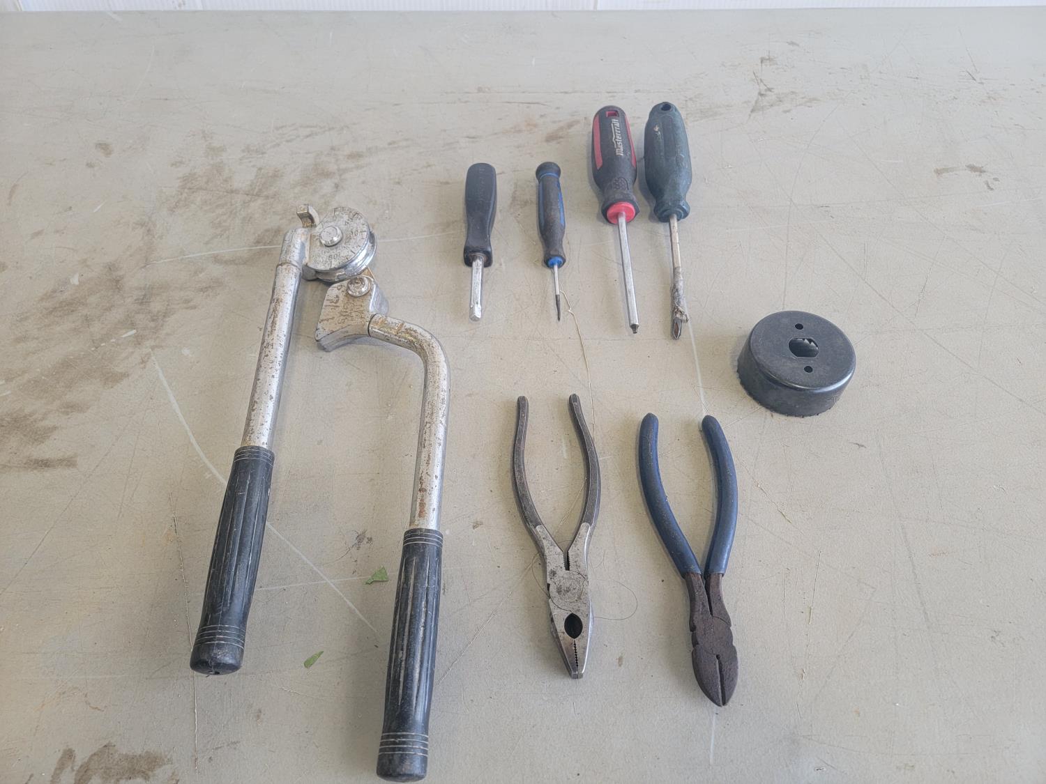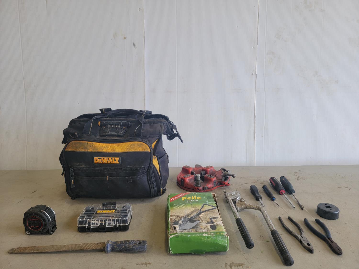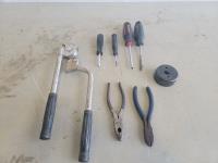 Screwdrivers, pliers, folding shovel, drill bits, file, measuring tape, Ridgid pipe threader
