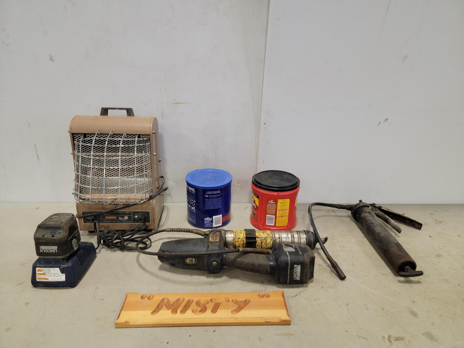 Lincoln 18V grease gun with extra battery, manual grease gun, Markel heater, golf balls and tees