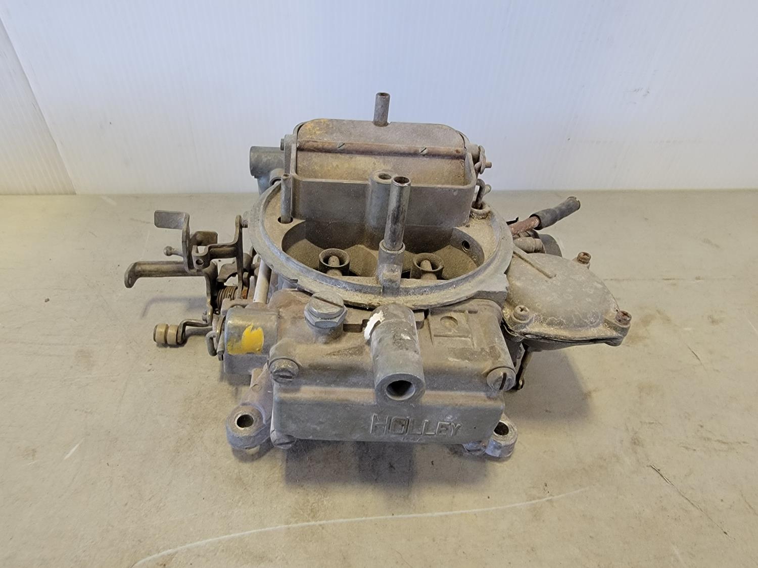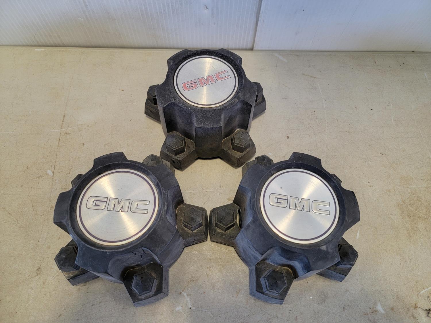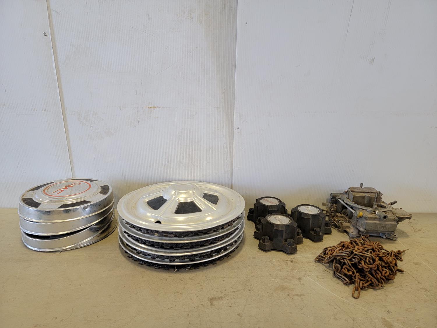 (2) chrome truck box rails, (4) GMC chrome hubcaps, (4) Sonoma chrome hubcaps, (3) GMC black center caps, Holley 650 carburetor, (2) snow blower tire chains