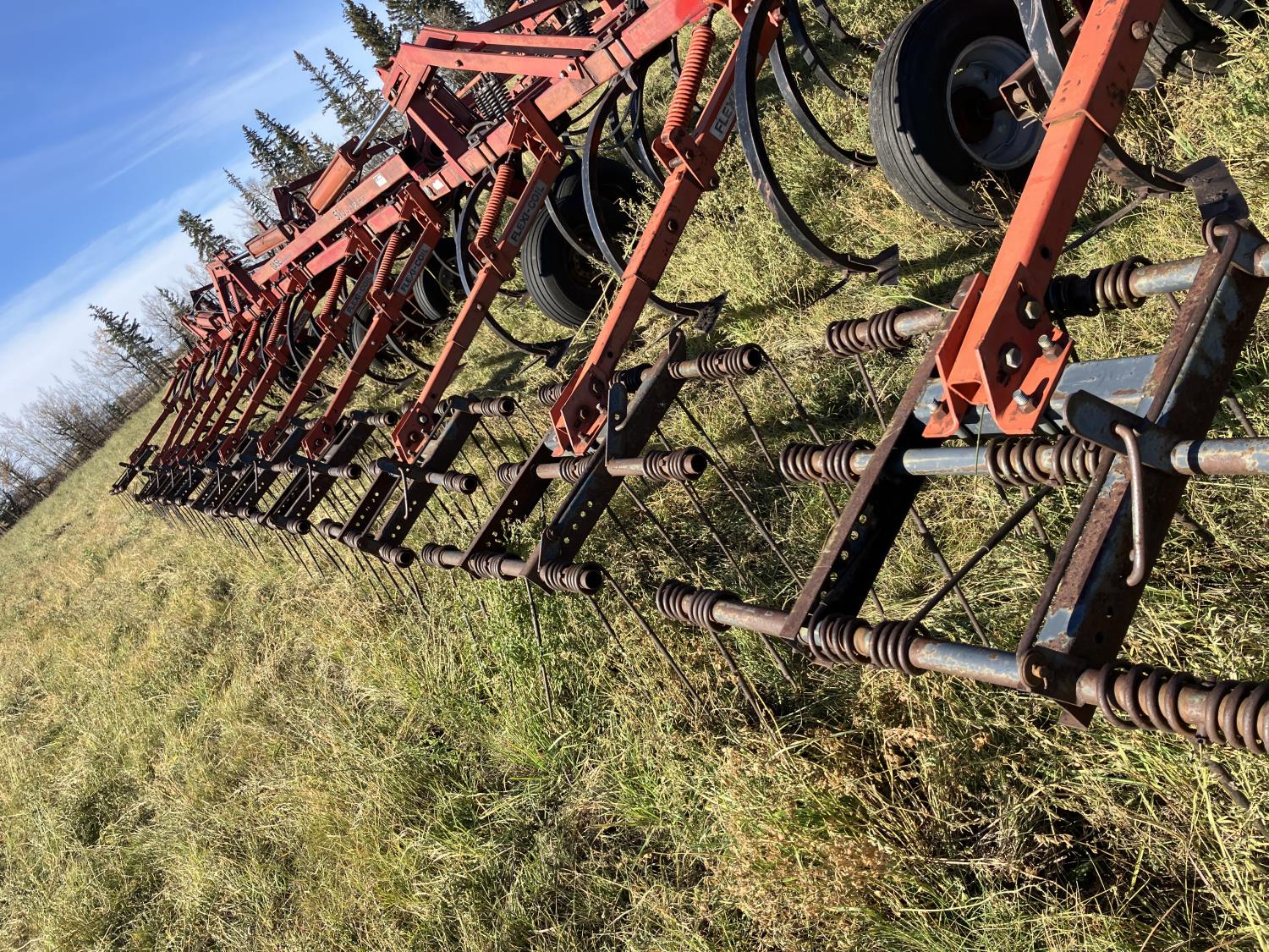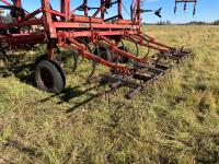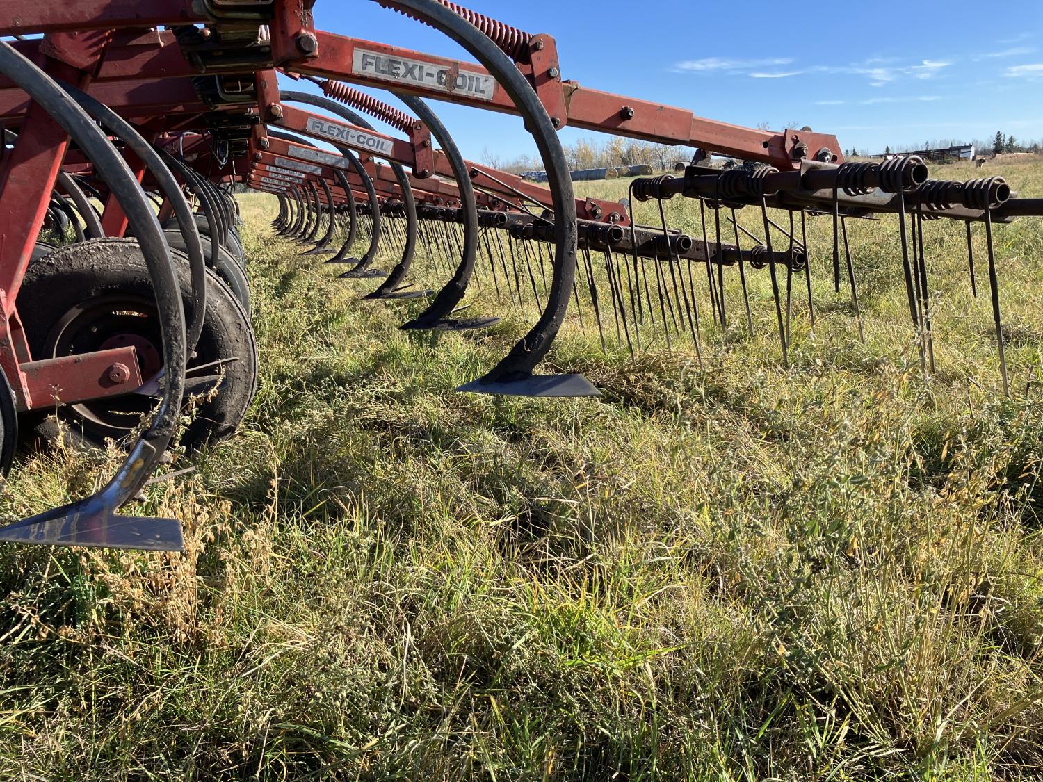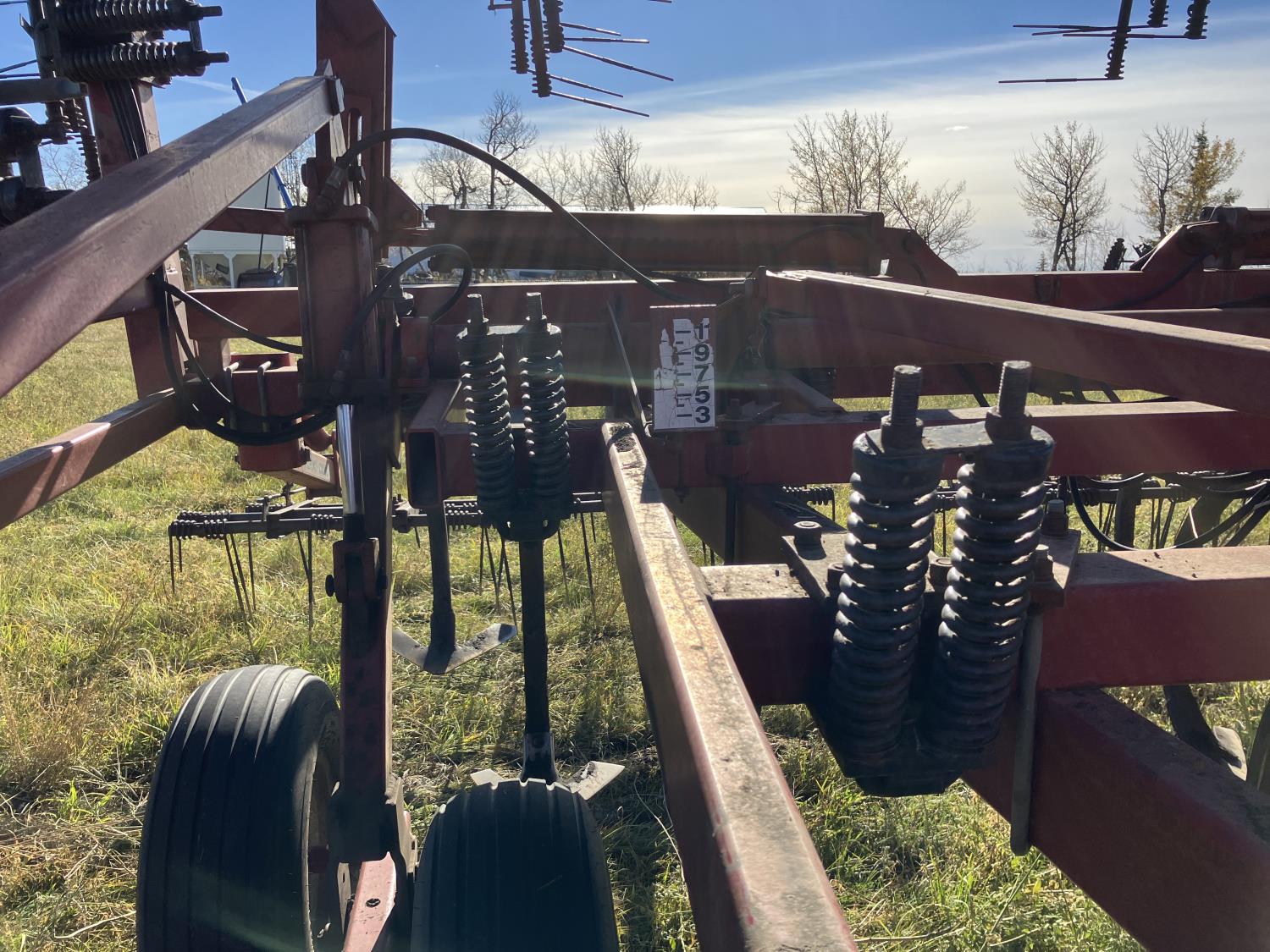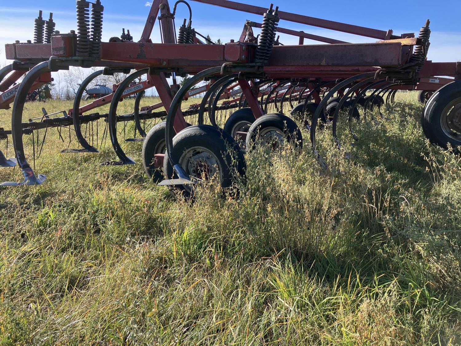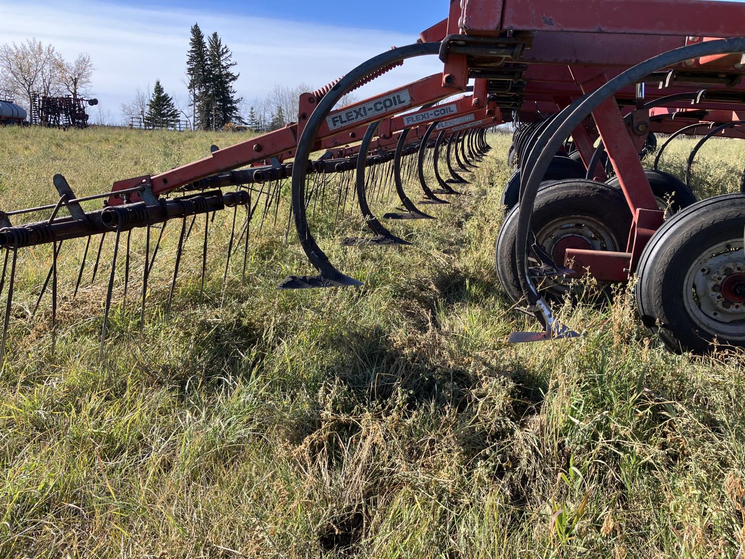 16 inch sweeps, Flexicoil 3 bar spring tooth harrows, walking axles on main frame, walking axles on wings, 16" harrow tines, 11L-15SL main frame tires, 7.60-15 wing tires