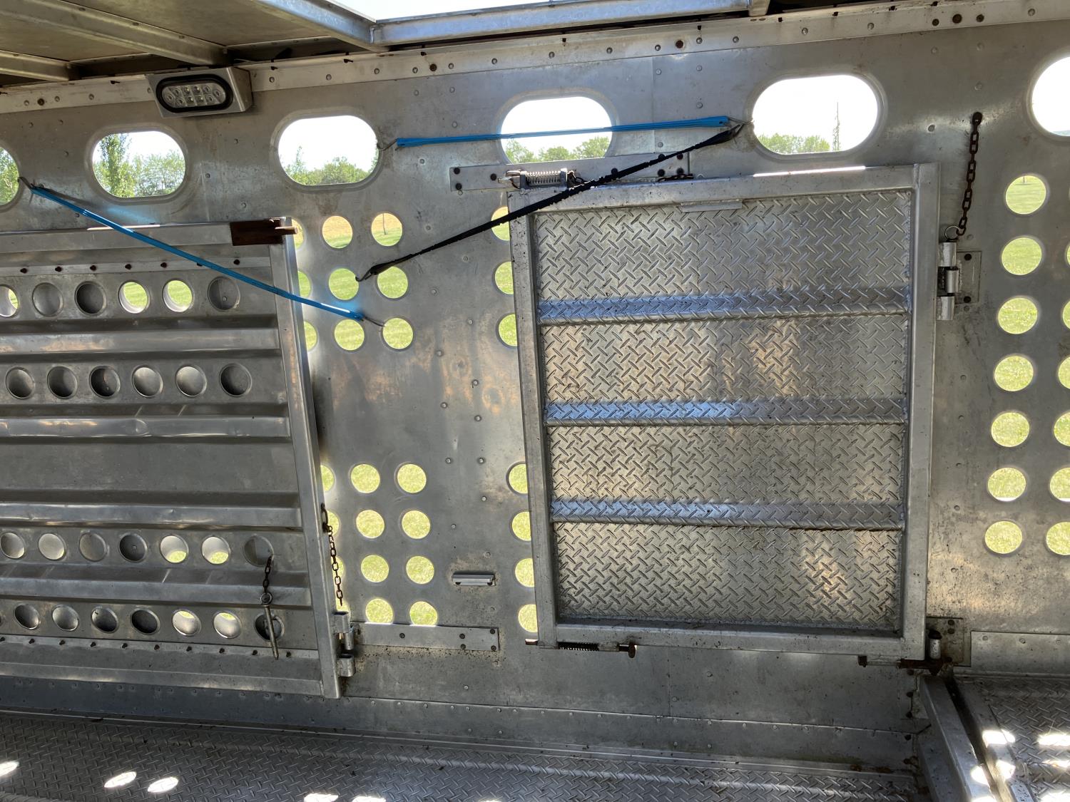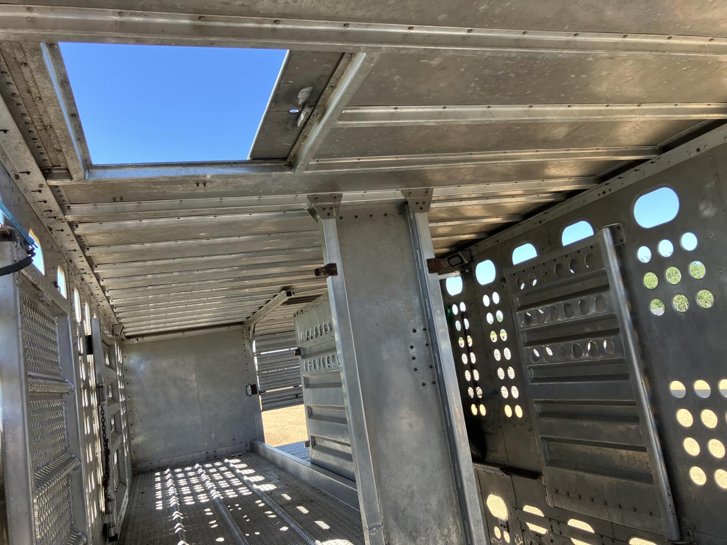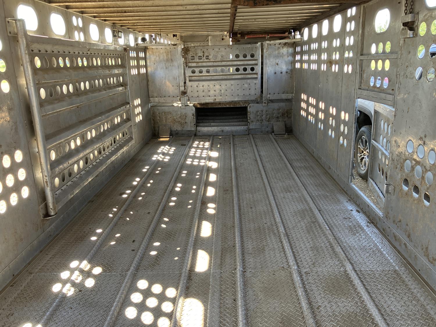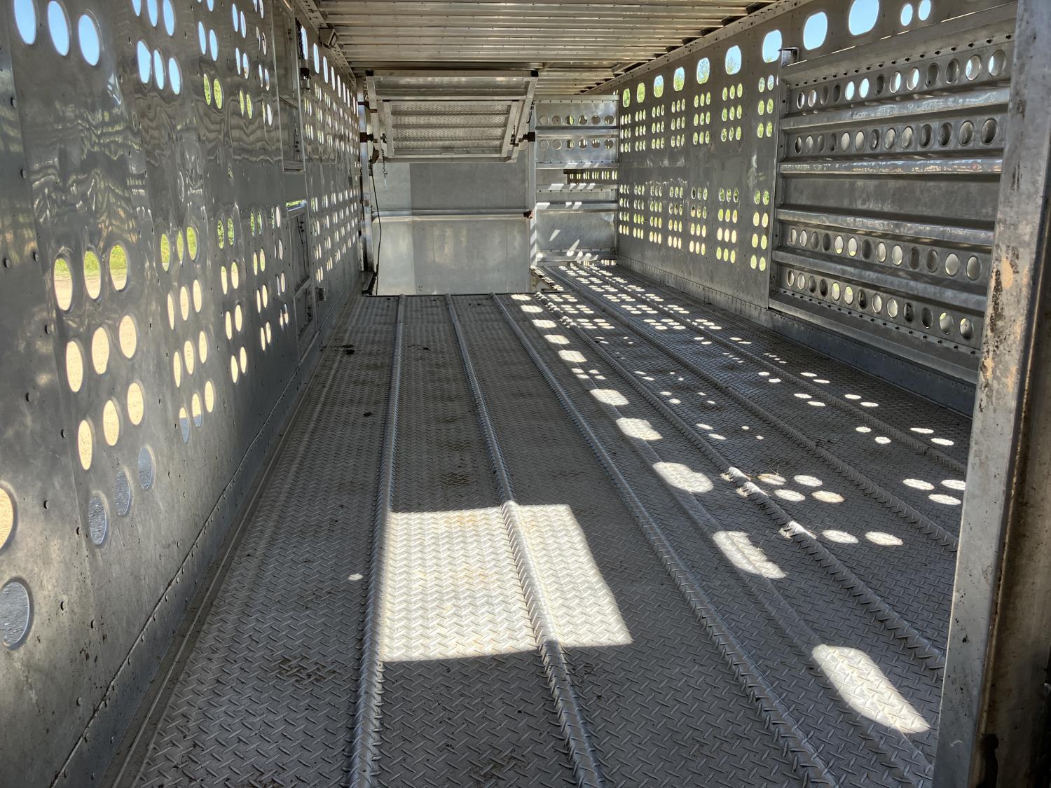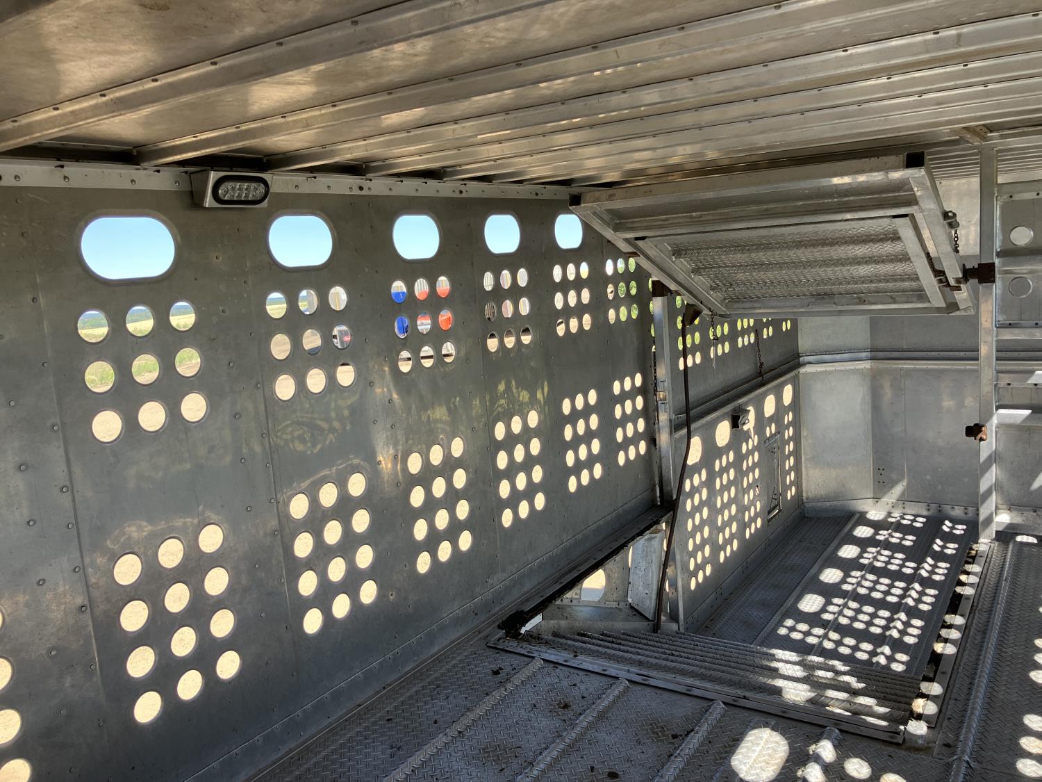 dog house, suspension air gauge, front and rear lift axels, 16 ft rear end, 26 ft belly, 10 ft nose, front deck planks, escape latches, aluminum wheels, 225/70R22.5 tires