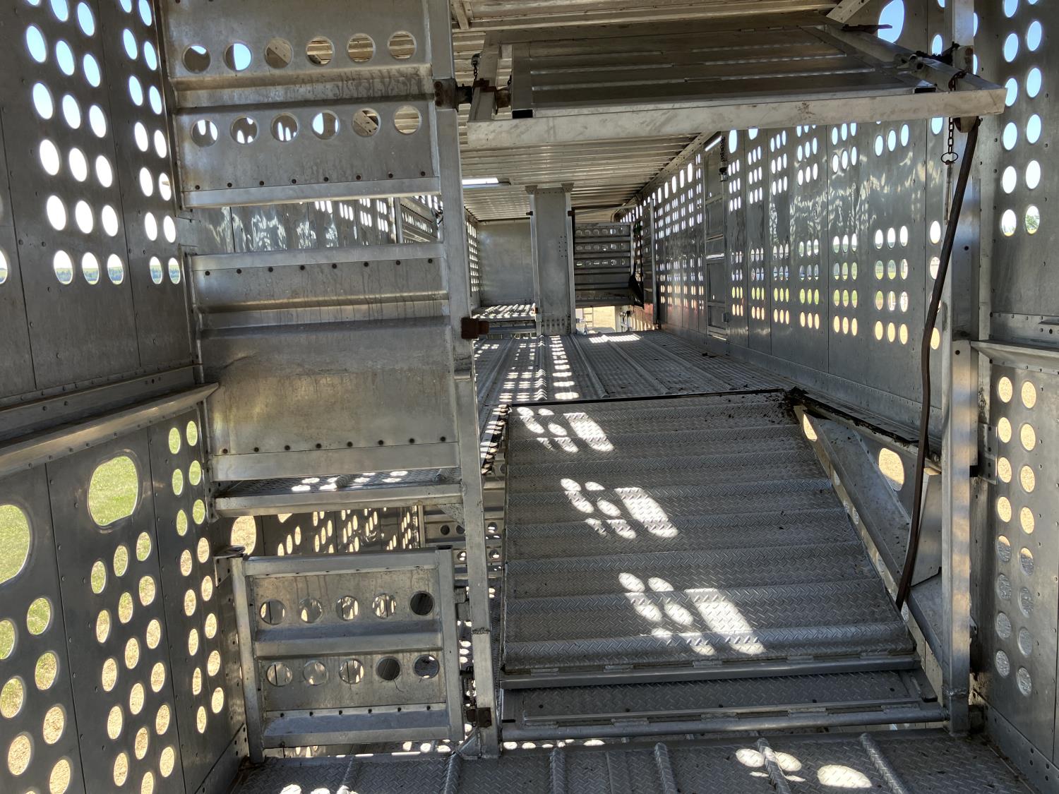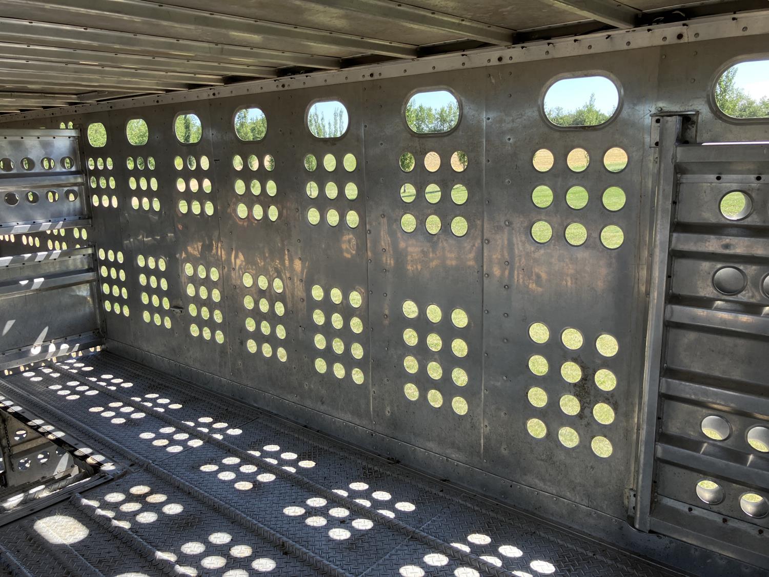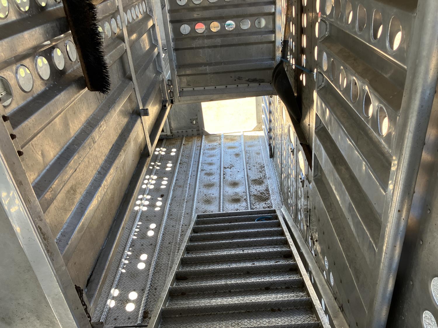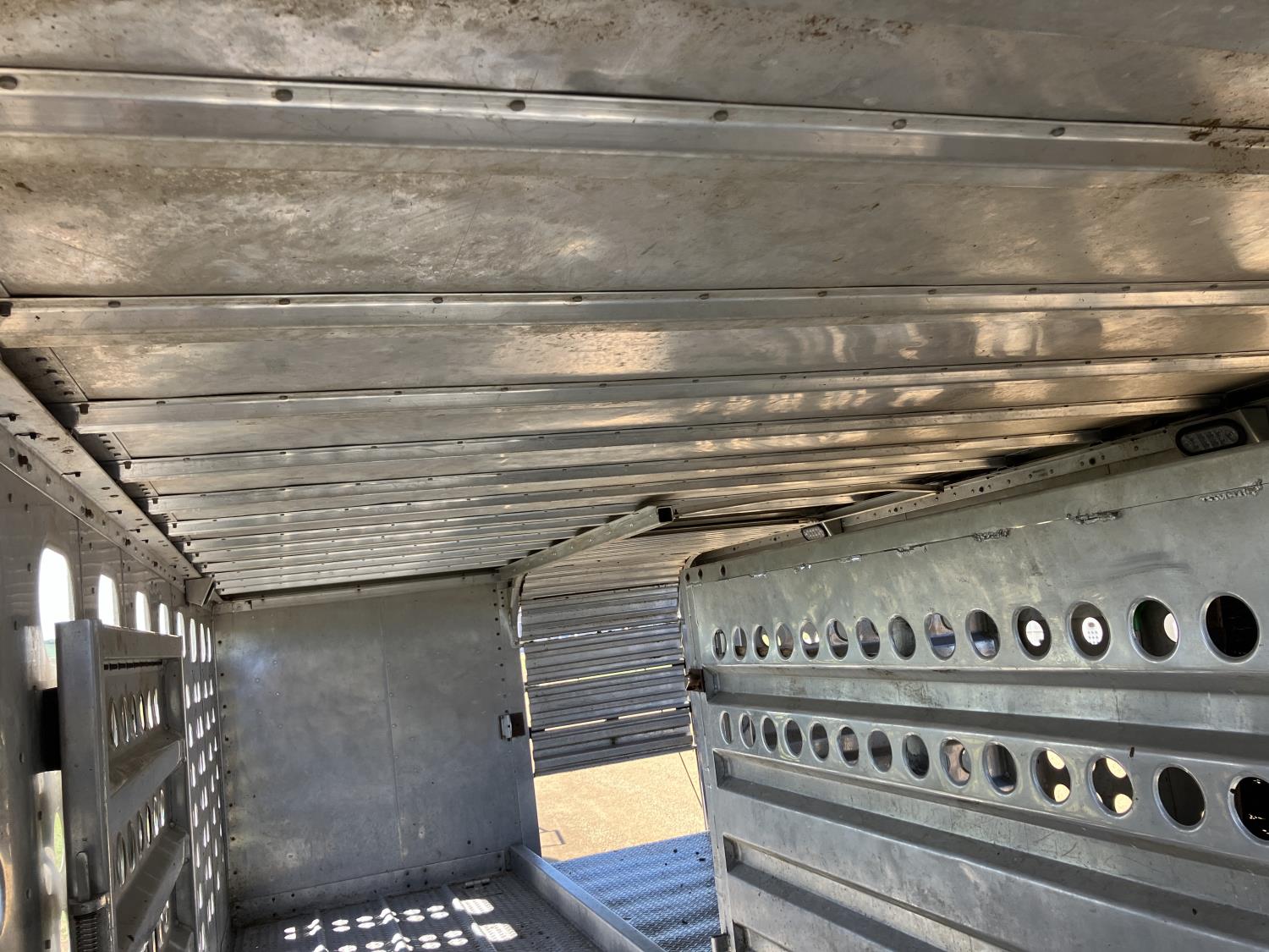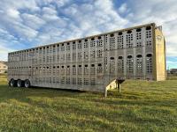 dog house, suspension air gauge, front and rear lift axels, 16 ft rear end, 26 ft belly, 10 ft nose, front deck planks, escape latches, aluminum wheels, 225/70R22.5 tires