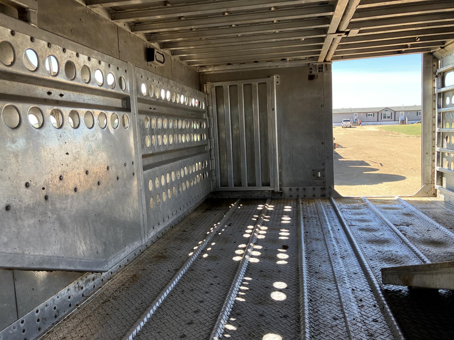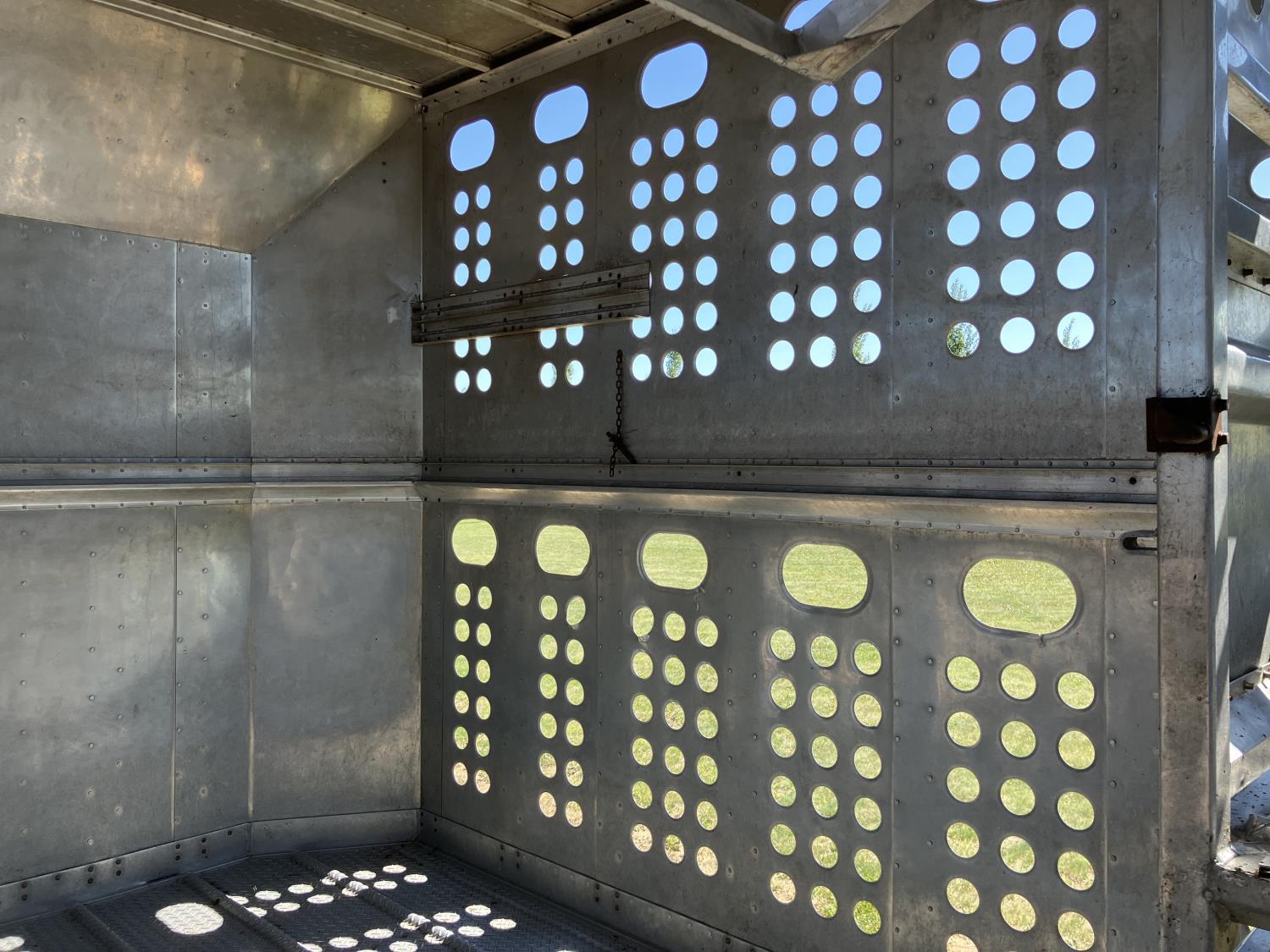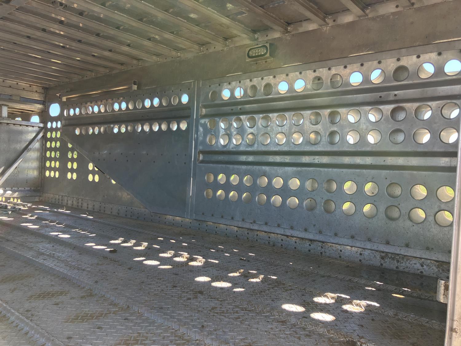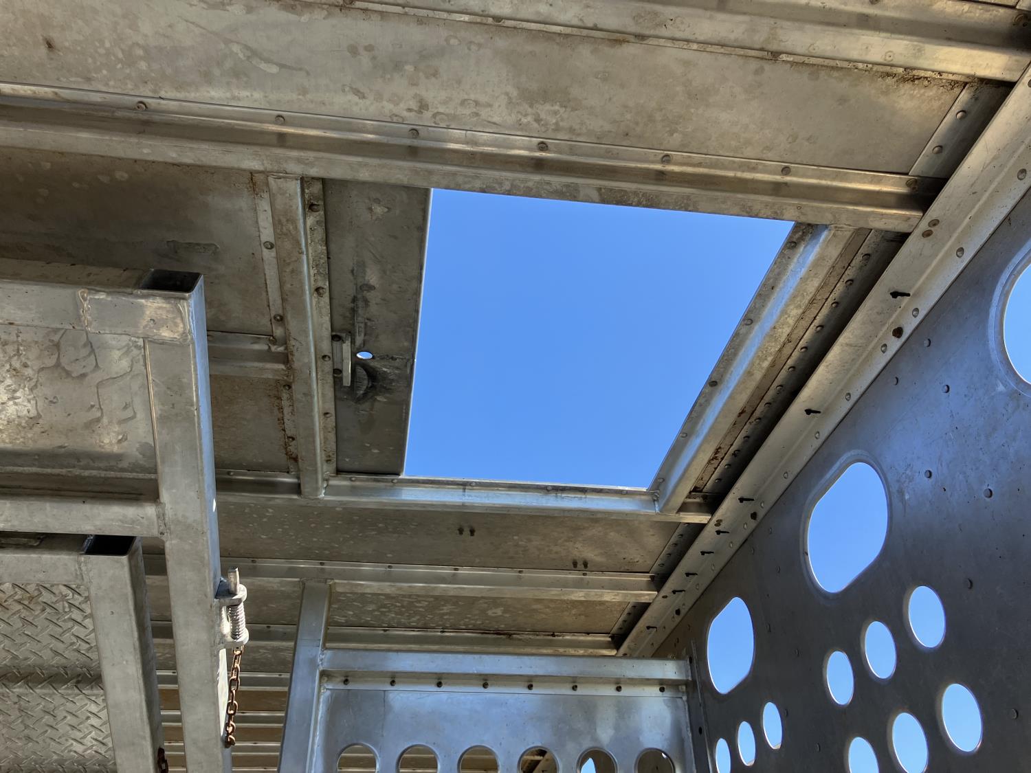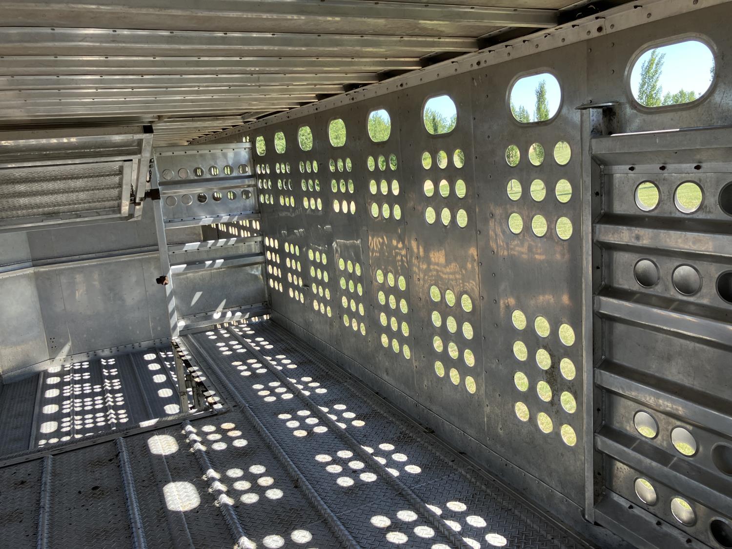 dog house, suspension air gauge, front and rear lift axels, 16 ft rear end, 26 ft belly, 10 ft nose, front deck planks, escape latches, aluminum wheels, 225/70R22.5 tires
